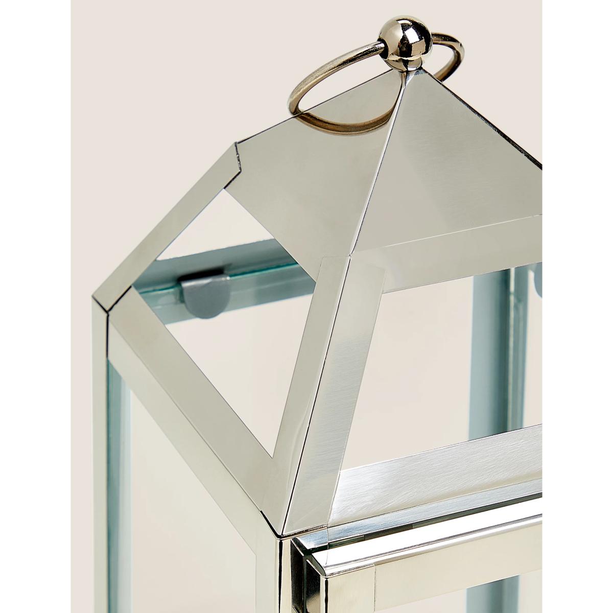Bring a charming glow to outside areas with this compact metal lantern. It features a shiny frame, bent pyramid roof and ring for hanging. One panel is a window that can be opened to add or remove a pillar candle.