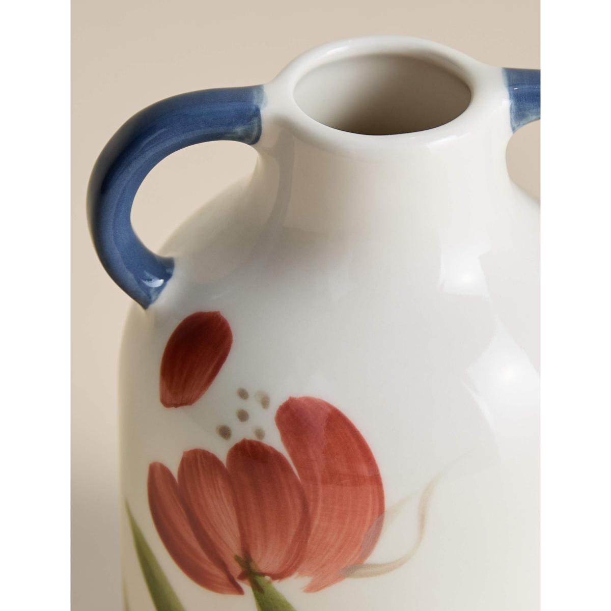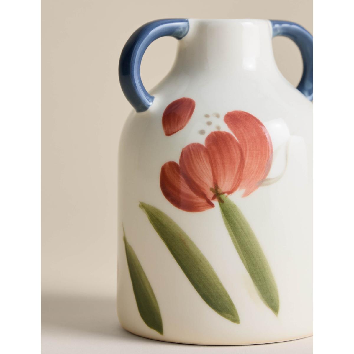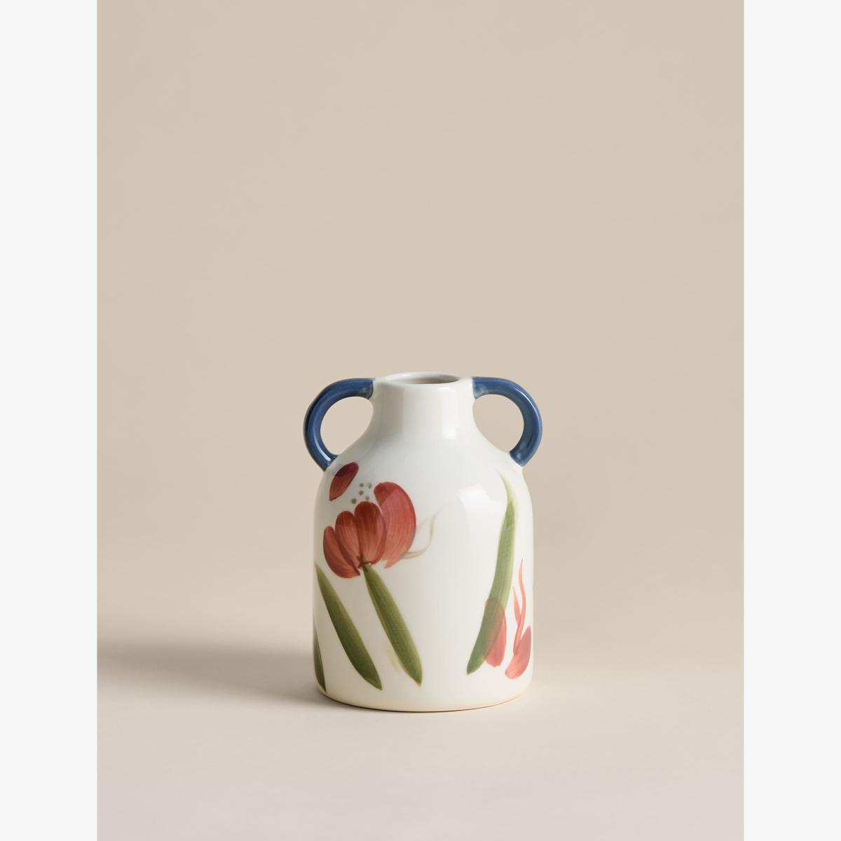 Add an elegant look to your interior with this mini ceramic vase, featuring a bright hand-painted floral design. Handle details and a narrow neck create stylish touches.