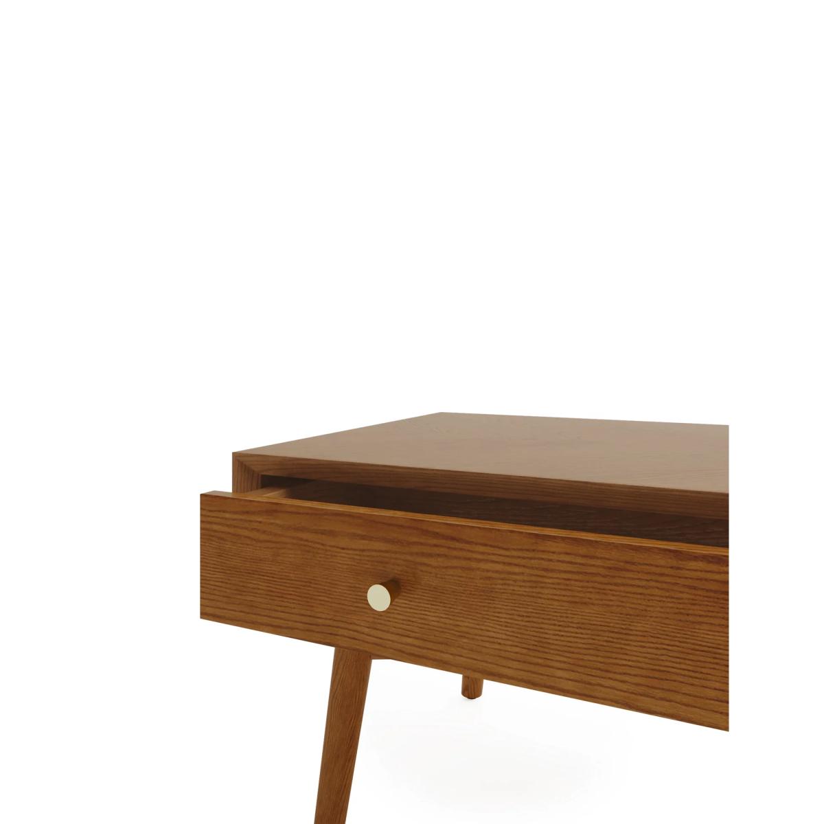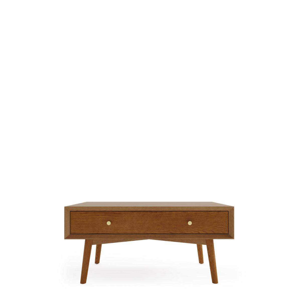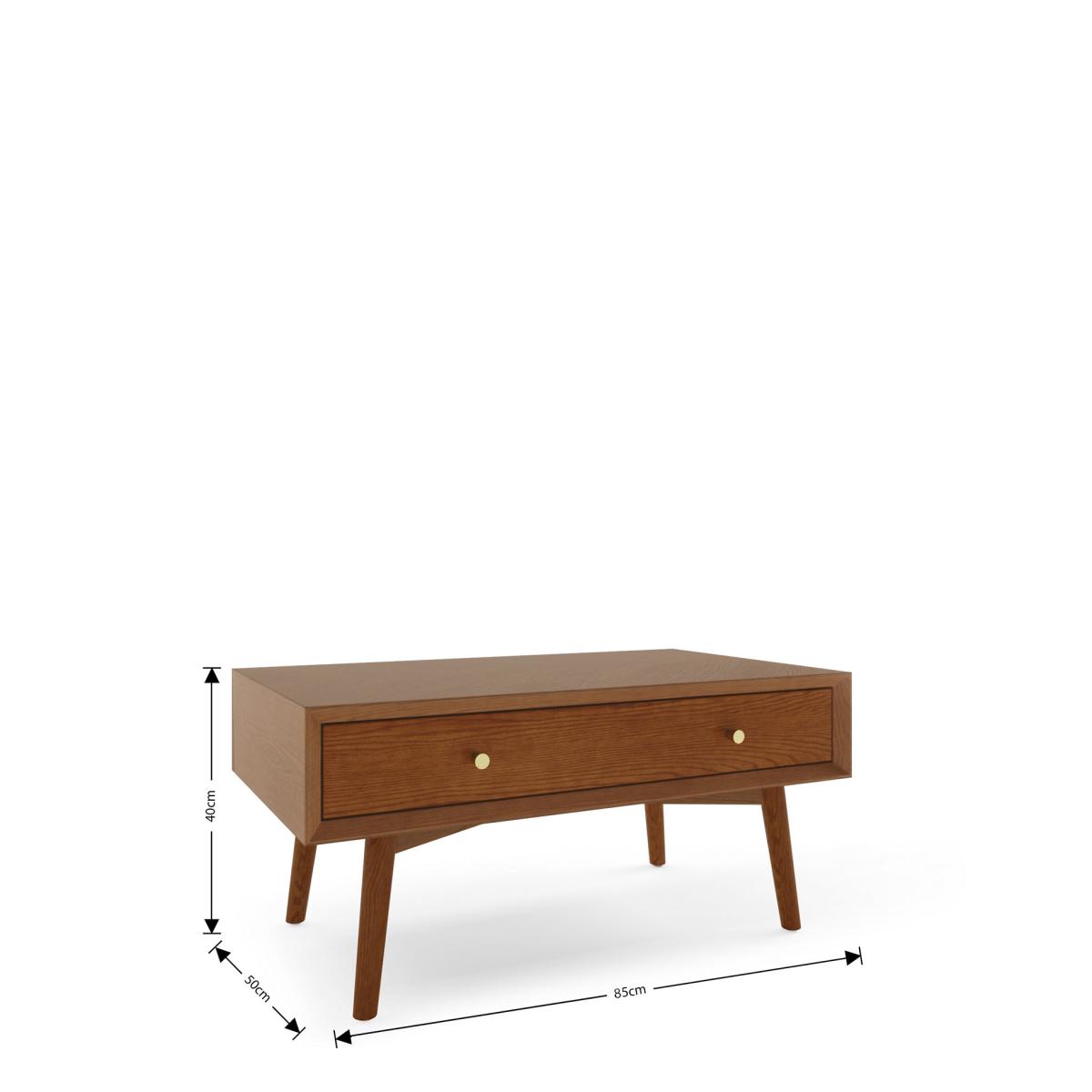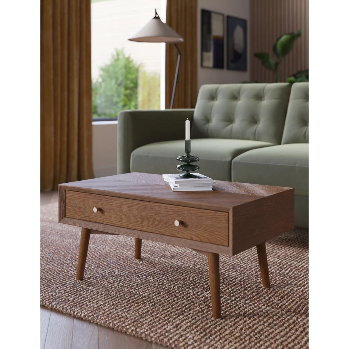 The Monroe coffee table is the perfect way to bring a touch of mid-century modern to your living space. Its boxy design and splayed solid oak legs capture the traditional design of the era, while the oak veneer chevron table top, with a pull out drawer on one side with storage on the reverse side top keeps it feeling contemporary. Circular, warm brass-effect handles add a neat finishing detail. We’re so confident our furniture is built to last, our industry-leading guarantee covers any manufacturing failure on all furniture. That’s our promise, and why our furniture comes with a 10-year guarantee that you can trust. Excludes: outdoor furniture and any issues that are a result of normal wear and tear, improper care or accidental damage.