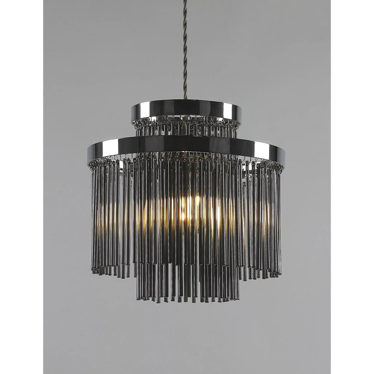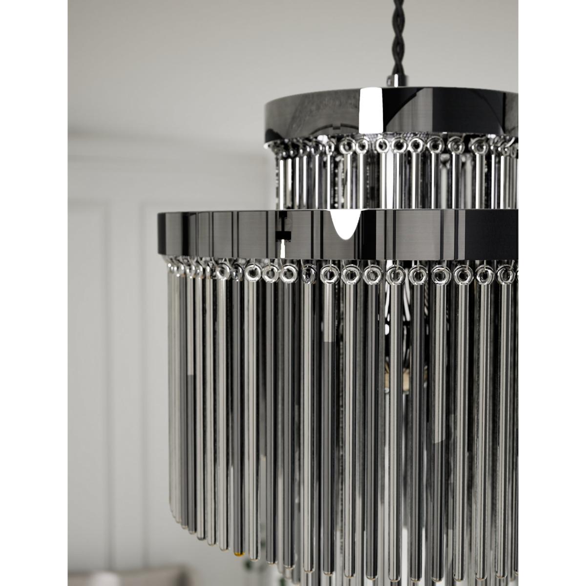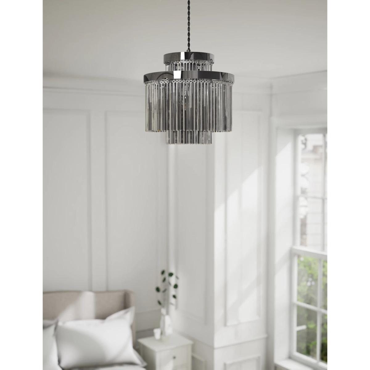 The Monroe ceiling lamp shade has an easy-fit design, so it's simple to place in your room. Its twin-circle shape and metallic frame ensure a sleek and eye-catching look. A fringe of slender glass strands creates a lustrous effect as it captures and refracts the light.
