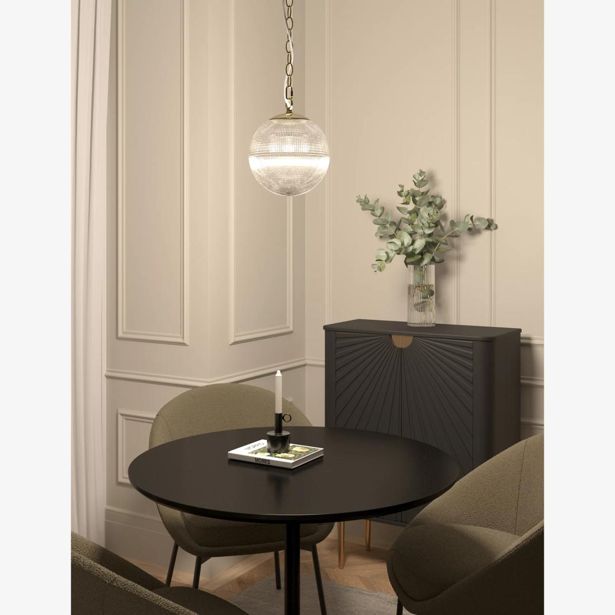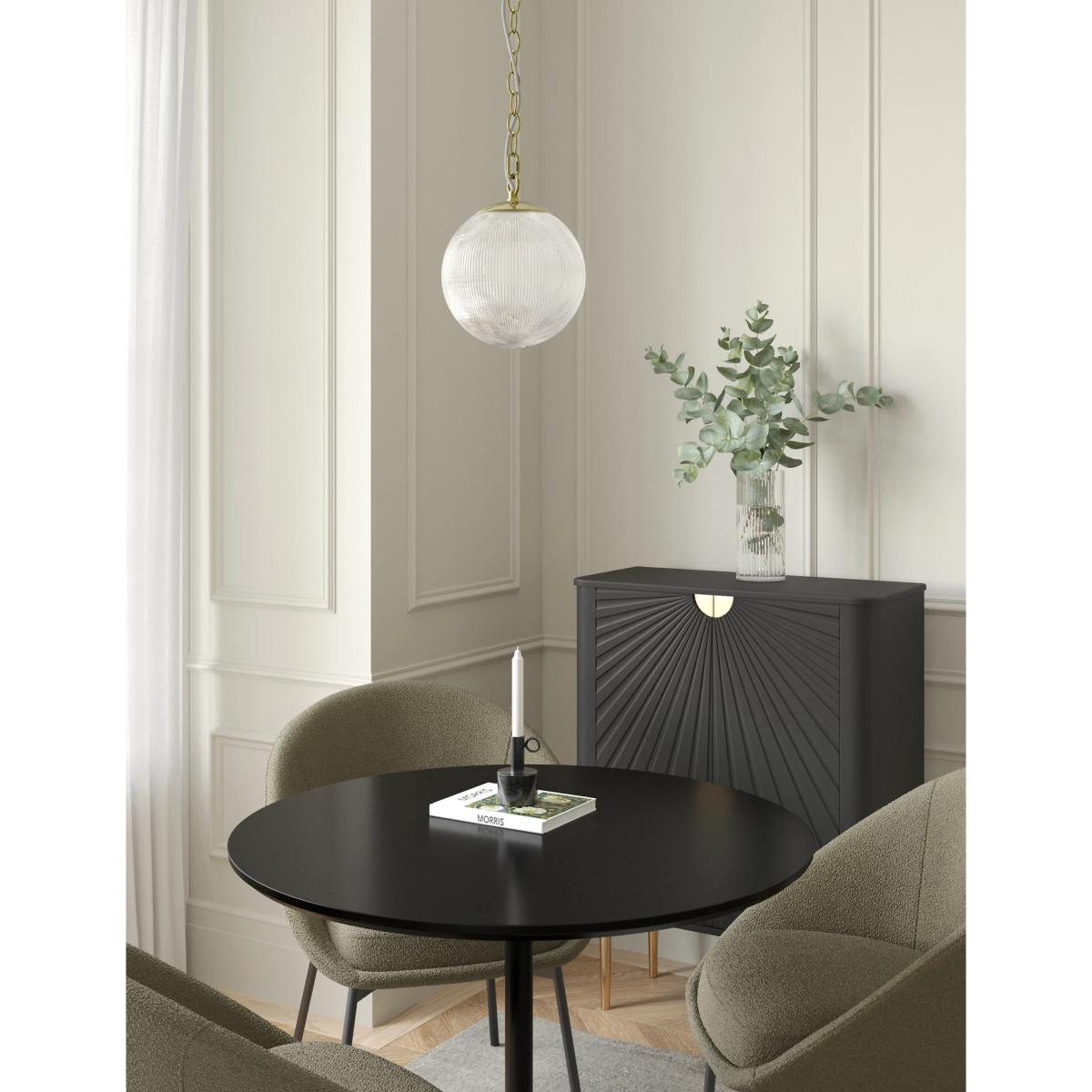 Inspired by Art Deco designs, this ceiling pendant light makes for an elegant focal point. The large globe shade is made from ribbed glass to diffuse the light and complements the ceiling rose and long gold-tone metal chain.