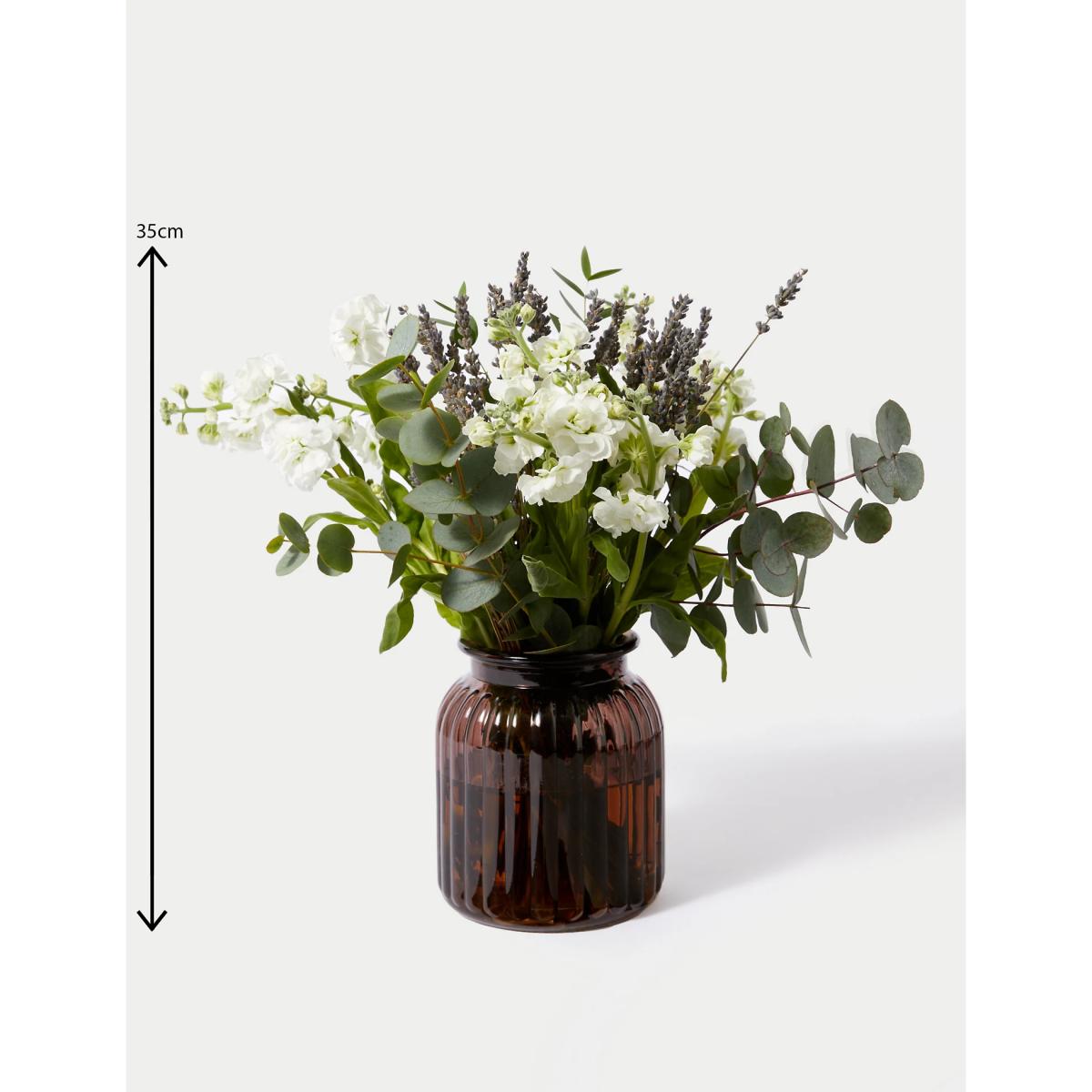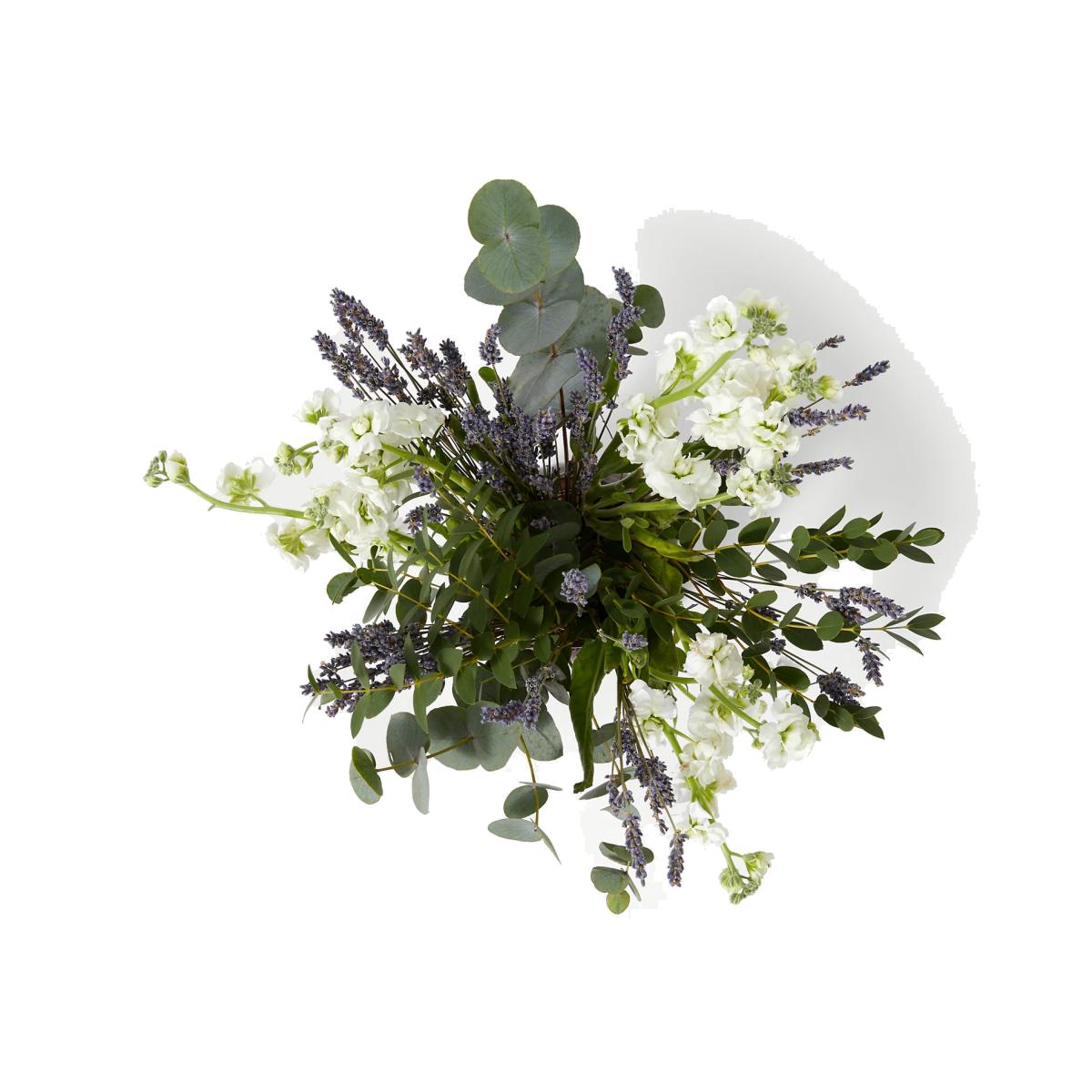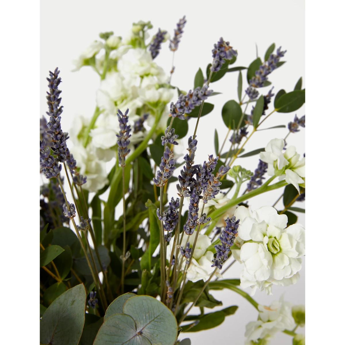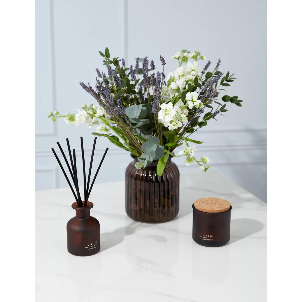 Treat your mum to a relaxing experience this Mother's Day with the Calming bouquet. This tranquil selection of stems includes three white stocks, a bunch of lavender and four fronds of eucalyptus, presented in their own elegant vase. The blooms are accompanied by a candle and diffuser scented with the 'Calm' fragrance from our Apothecary collection. Colours may vary slightly throughout the season.