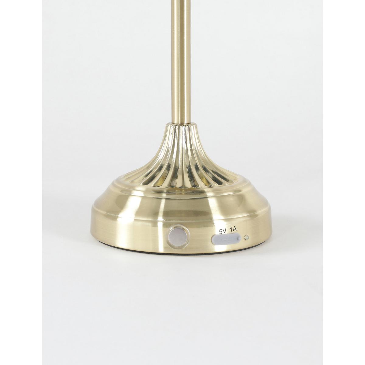 Bring a traditional touch to your space with this small table lamp. It's crafted from metal and designed with an elegant slender arm and decorative base. For added style, this lamp features a pleated shade. Plus, its integrated battery can be recharged when it runs out of power.