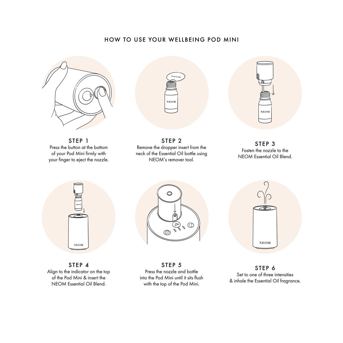 Discover the neom wellbeing pod mini. Designed to scent little spaces (think car, home office, bathrooms) in minutes. Whatever your wellbeing need, the Neom Wellbeing Pod Mini works at the touch of a button, helping you achieve better sleep, less stress, more energy or a mood boost through our 100% natural essential oil blends.