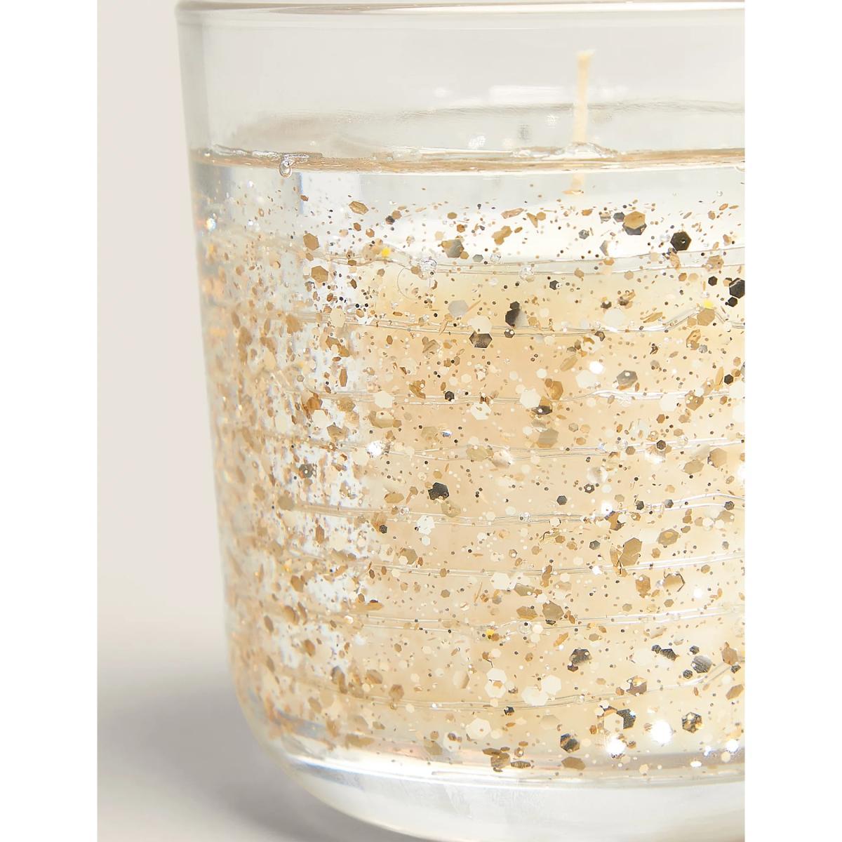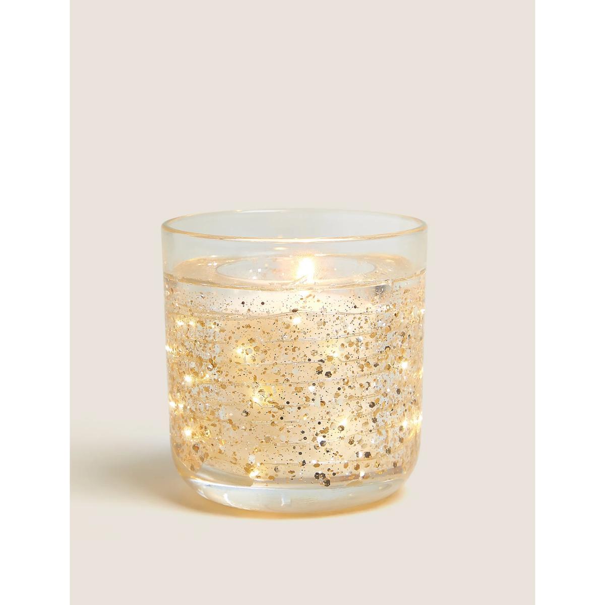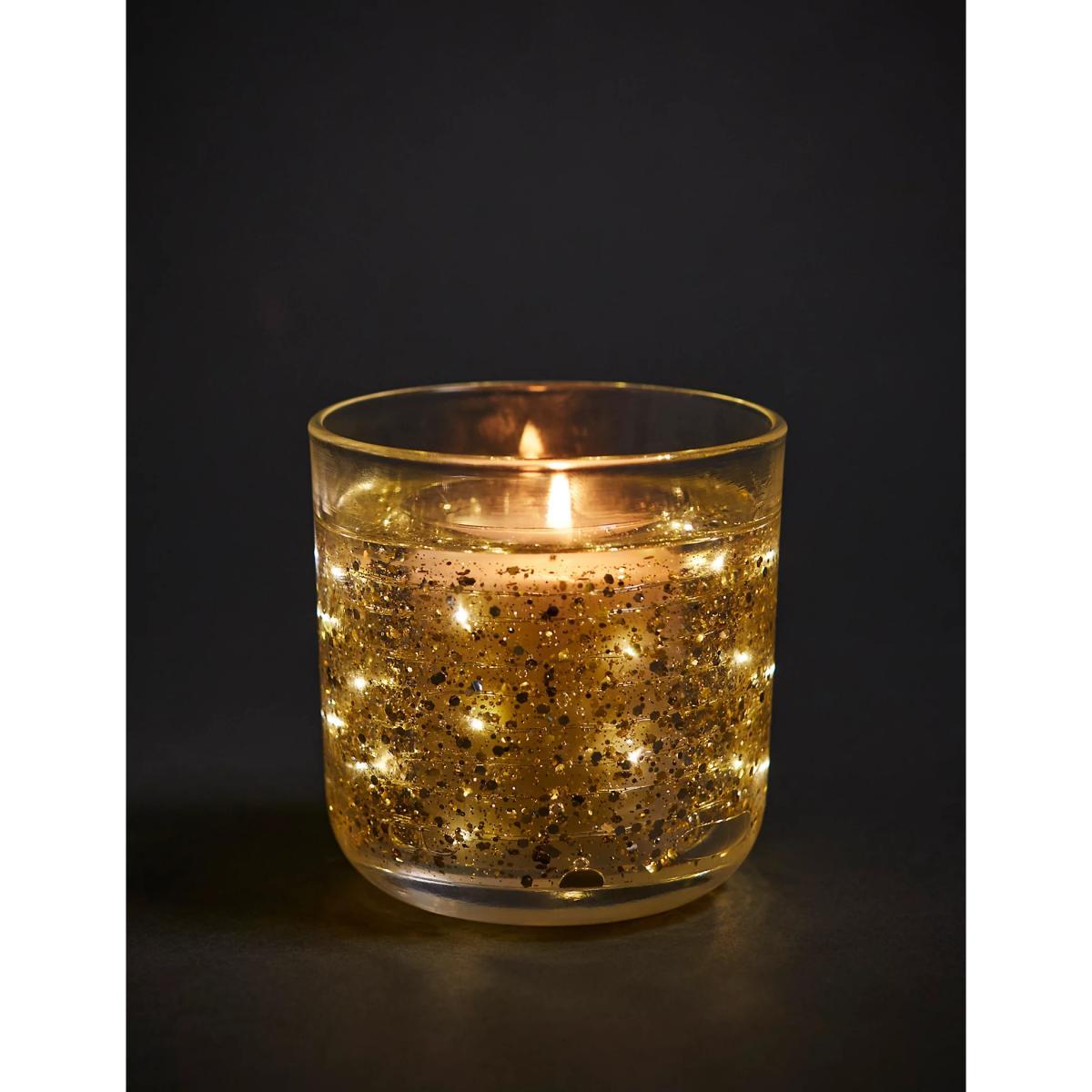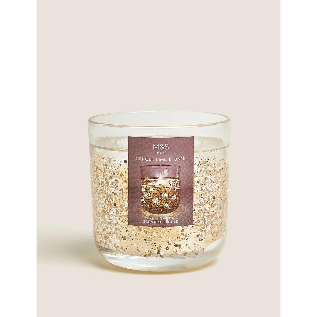 Add to the ambience of your room with this light-up candle. Silver sequins in the gel surrounding the candle glow and glisten for an iridescent finish. Simply light the candle as usual which will trigger the LED lights that wrap around the candle, creating a beautiful warm glow. Scented with notes of neroli, lime and basil, the candle infuses your home with a citrusy aroma.