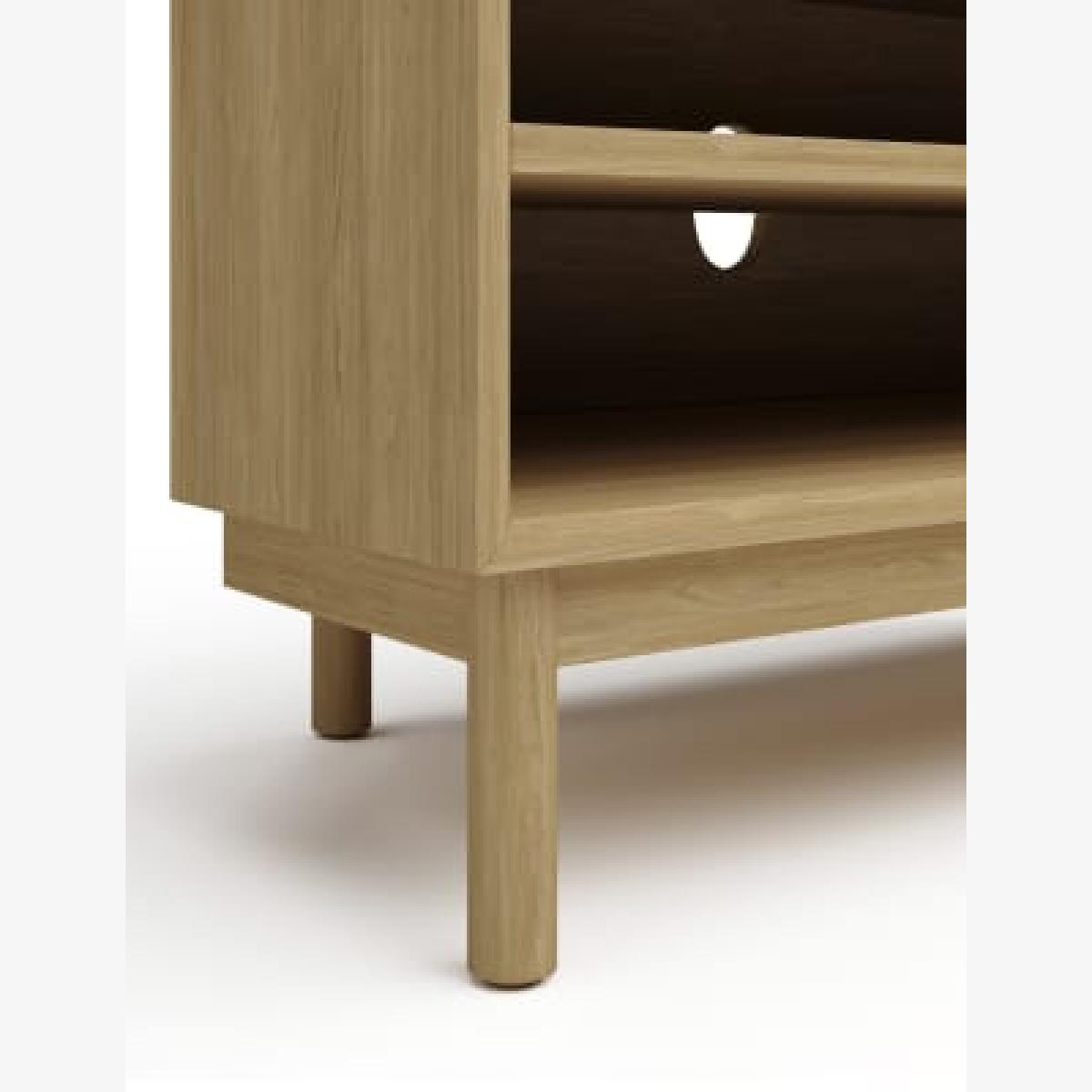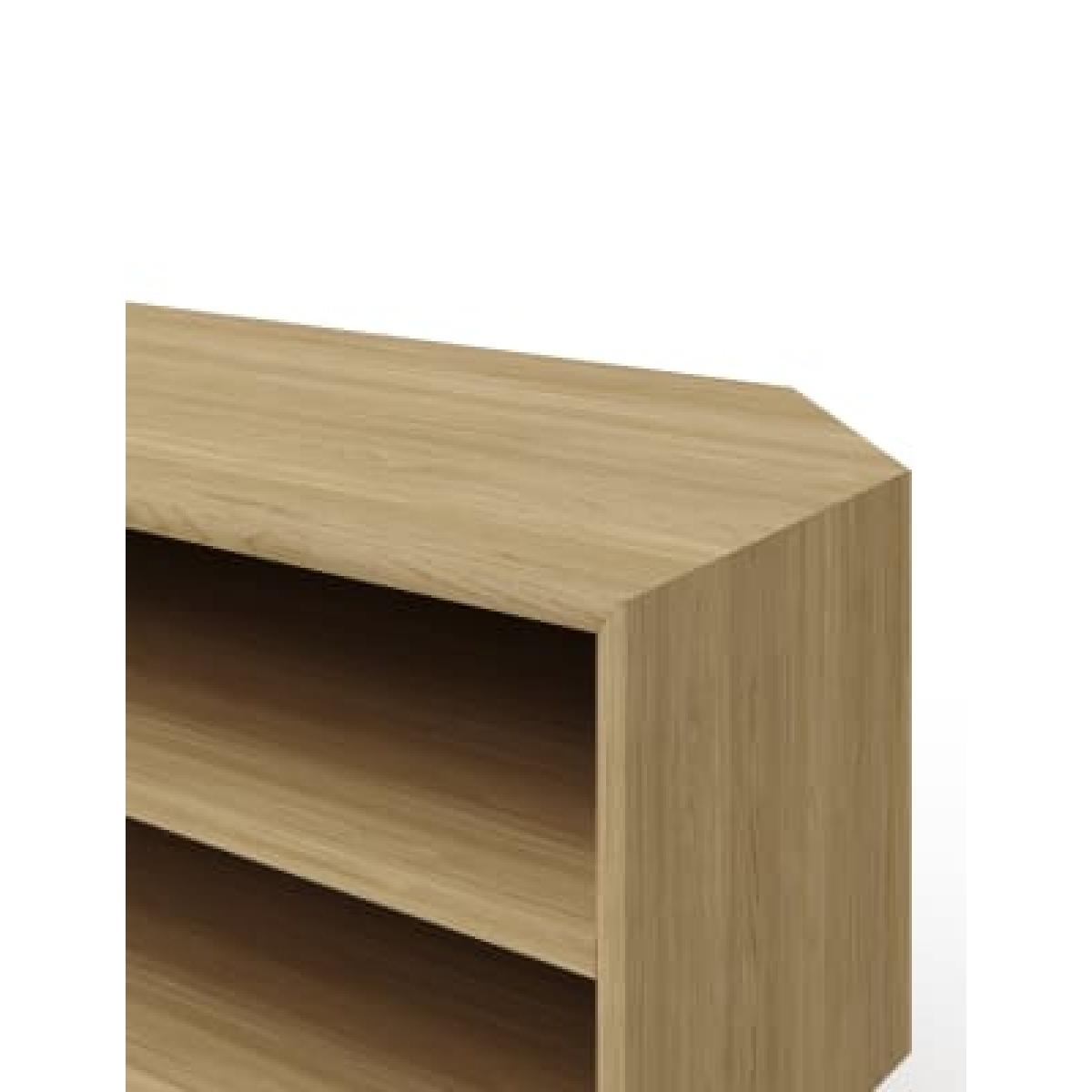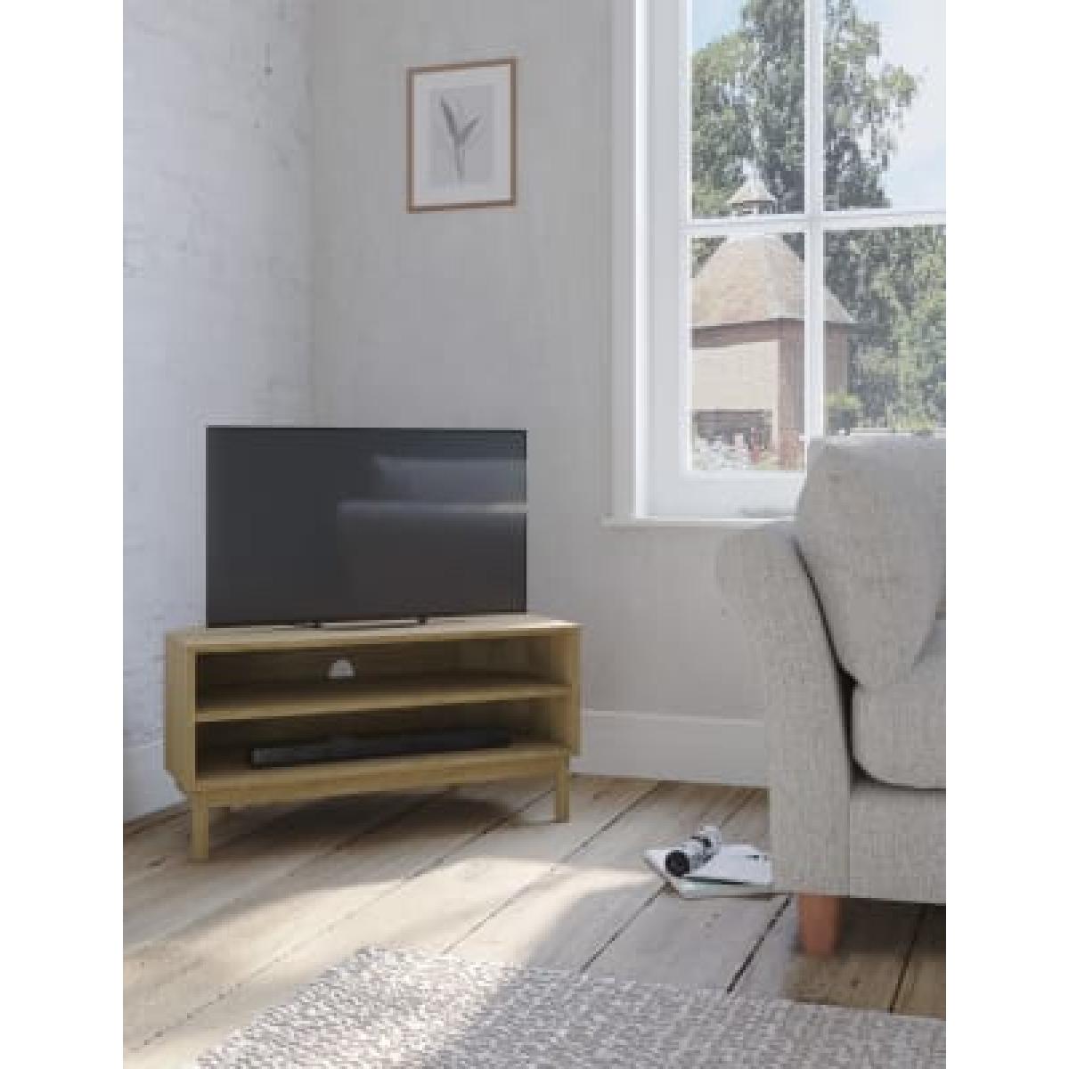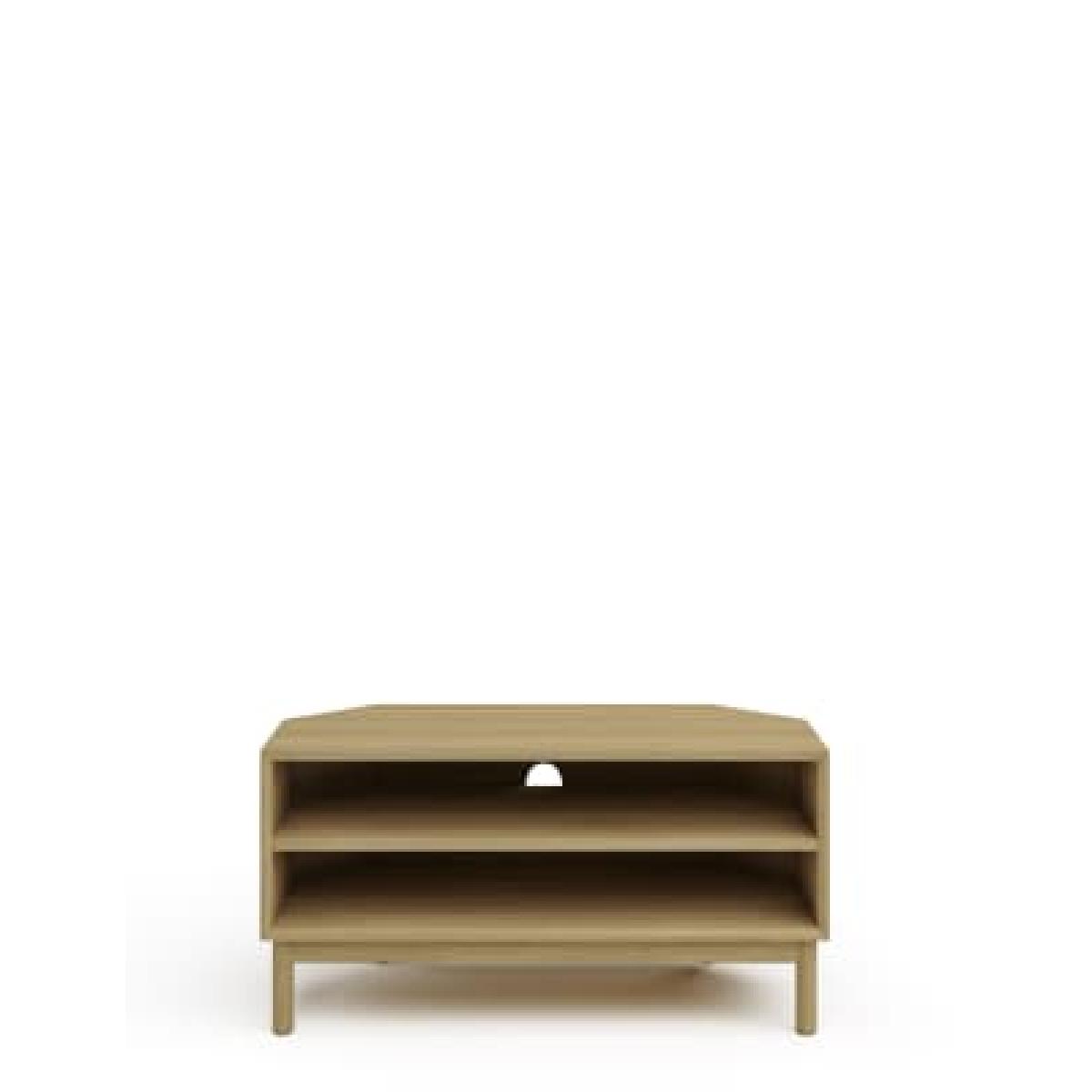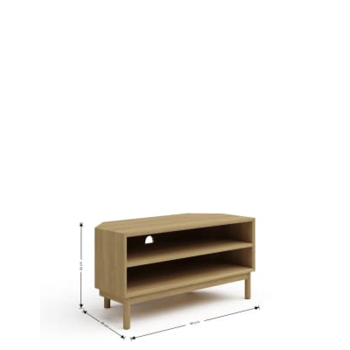 House your devices in contemporary style with the Newark TV unit. It's designed with an angled shape, making it ideal for fitting into corner spaces. Its two shelves hold multiple entertainment units, while a small opening at the back accommodates their wires. Made from oak veneer with solid oak legs, this modern piece has a subtle grained wood texture. Matching items are available for a coordinated look. We’re so confident our furniture is built to last, our industry-leading guarantee covers any manufacturing failure on all furniture. That’s our promise, and why our furniture comes with a 10-year guarantee that you can trust. Excludes: outdoor furniture and any issues that are a result of normal wear and tear, improper care or accidental damage.