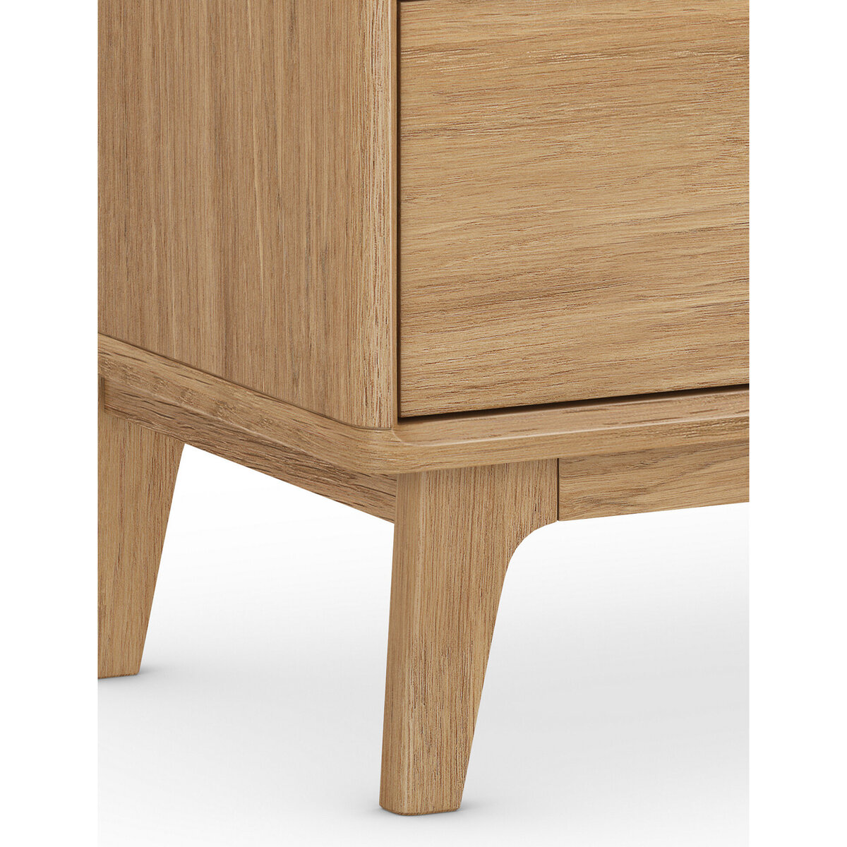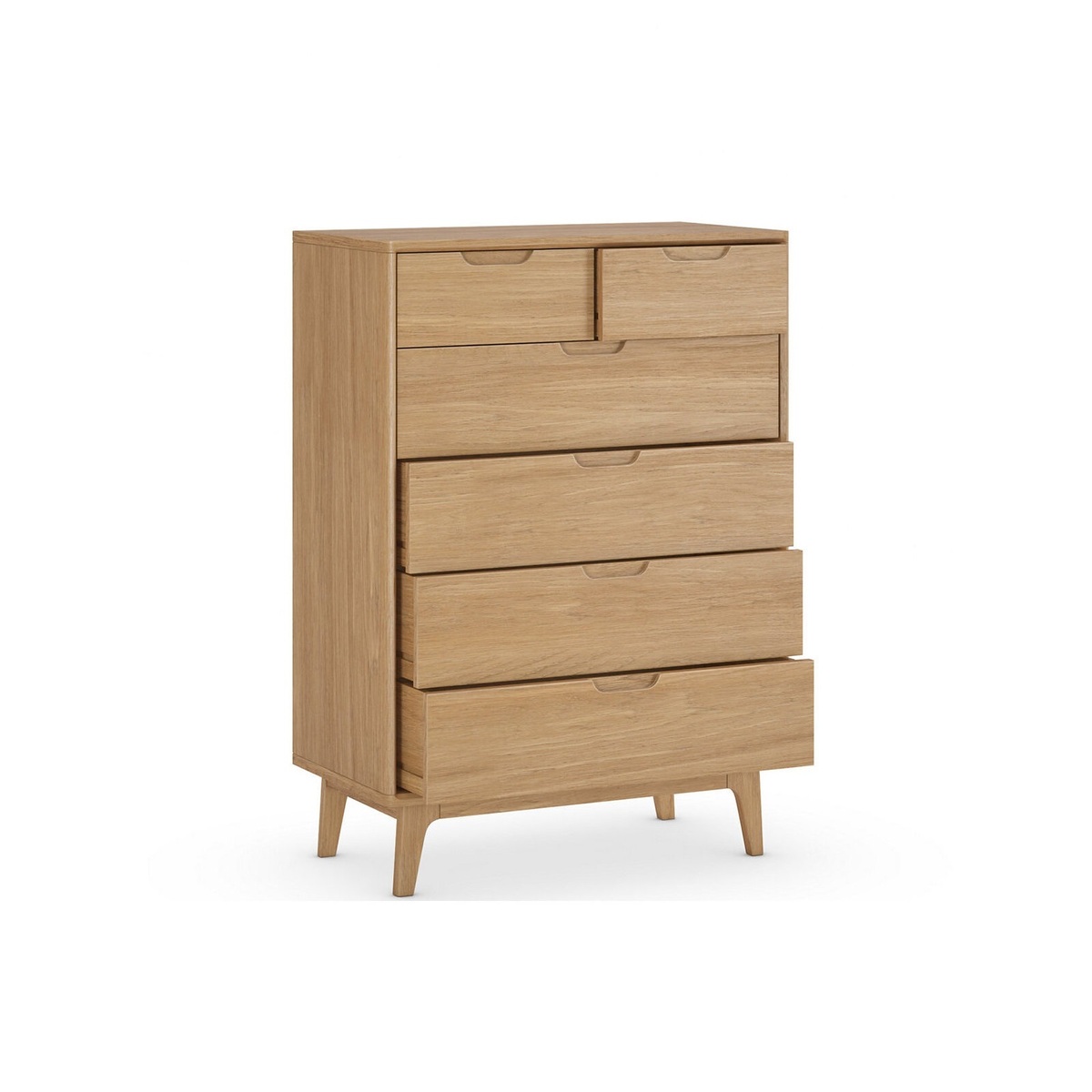 With its Scandi-inspired minimalist look and recessed handles, this chest from the Nord range combines practicality with style. It features four long drawers and two smaller ones, and sits elegantly on short angled legs. It offers ample storage space while remaining small enough to fit into most rooms. It's made from sustainable wood to limit its impact on the environment.