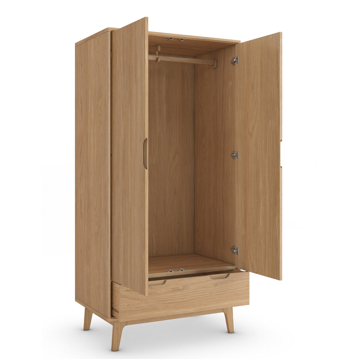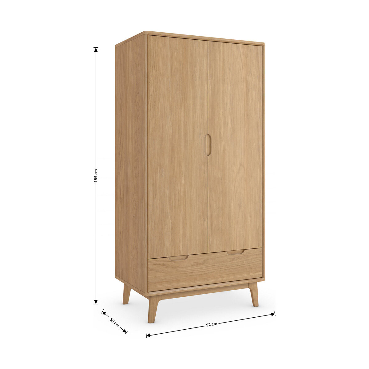 I love this wardrobe for its clean, minimalist lines and warm oak finish, making it versatile enough to fit into many interiors - from Scandi-inspired spaces to contemporary schemes. Its natural wood tone adds warmth without overpowering, and the compact width makes it ideal for smaller bedrooms or as a supplementary storage piece. To style it effectively, consider pairing it with neutral bedding and soft furnishings, using layered textures to add depth. A few decorative accessories, like a statement lamp or plants nearby, can help balance its practical design with subtle personality. Overall, it’s a functional yet stylish addition that will blend seamlessly into most modern or minimalist interiors.