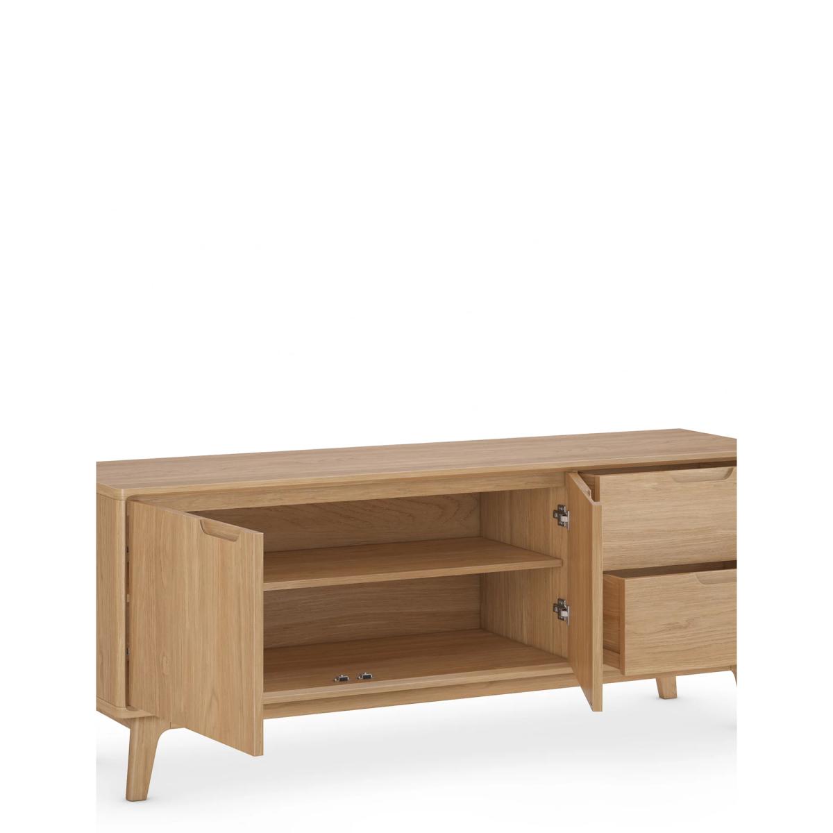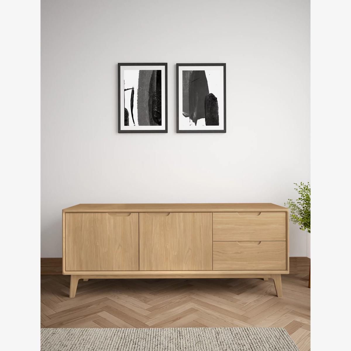 I love this sideboard for its clean, Scandinavian-inspired look that brings warmth and simplicity to a range of interiors. Its oak finish lends a natural, timeless appeal, making it versatile enough for contemporary, minimalist, or even rustic schemes. Practical styling tips include using the flat top surface to display a mix of decorative objects, such as statement lamps, vases, or art books, while keeping the inside organised with storage baskets or boxes. It works especially well in living rooms or dining spaces where you want to combine storage with a sleek aesthetic. Its understated design means it can be fussed with easily, allowing you to add colour or texture through accessories without overpowering the piece.