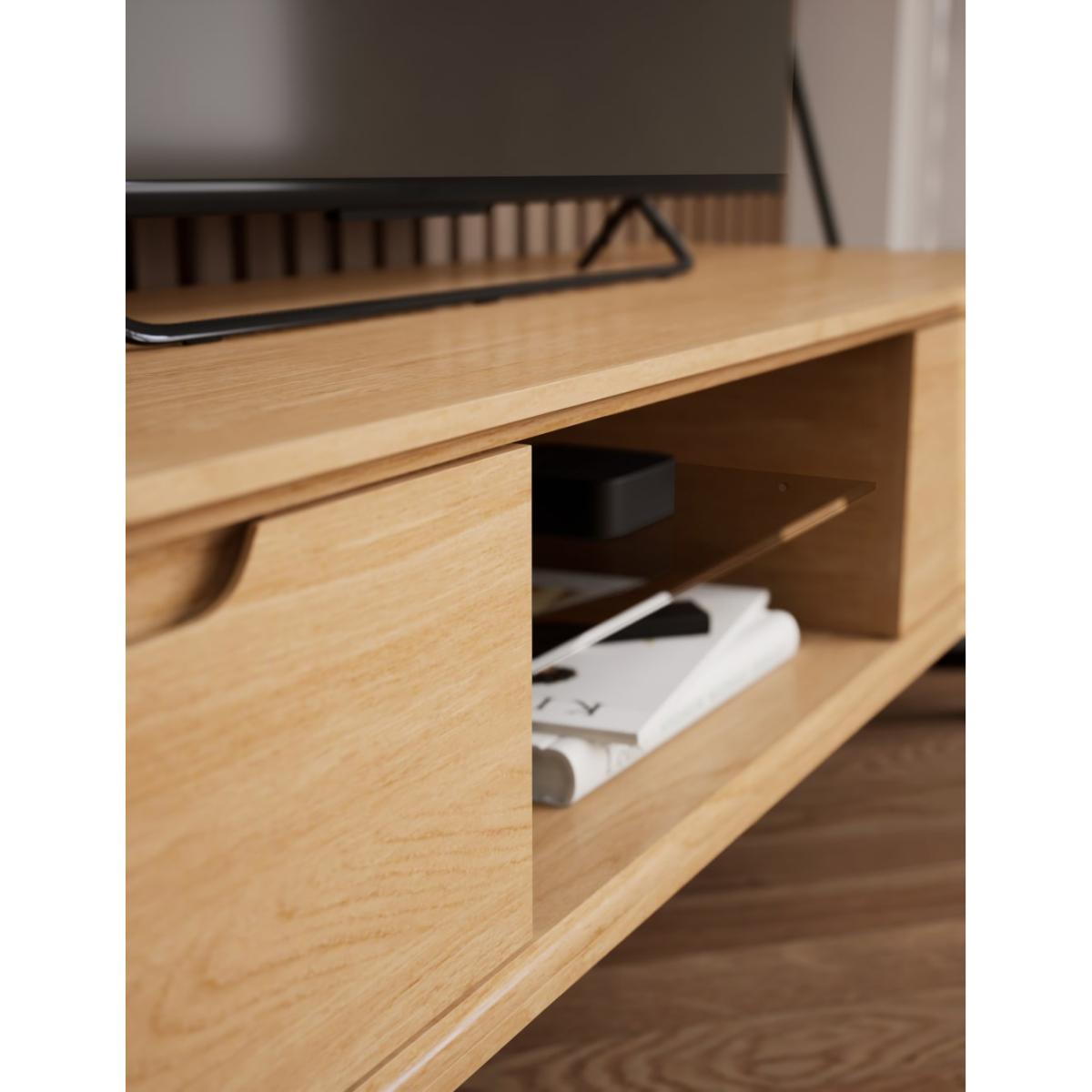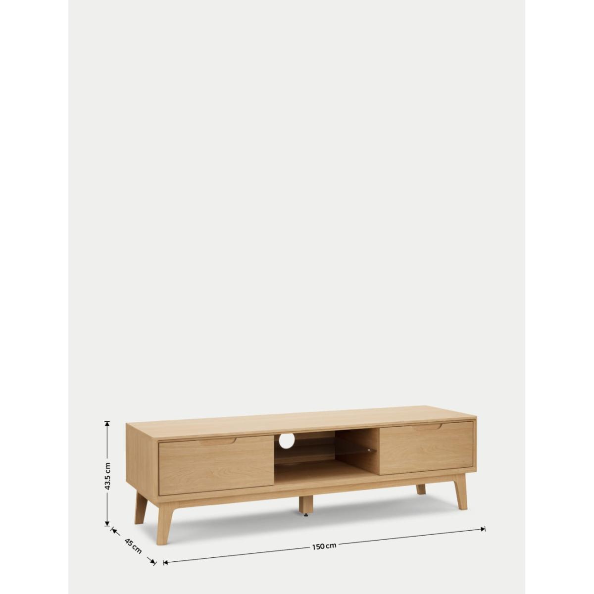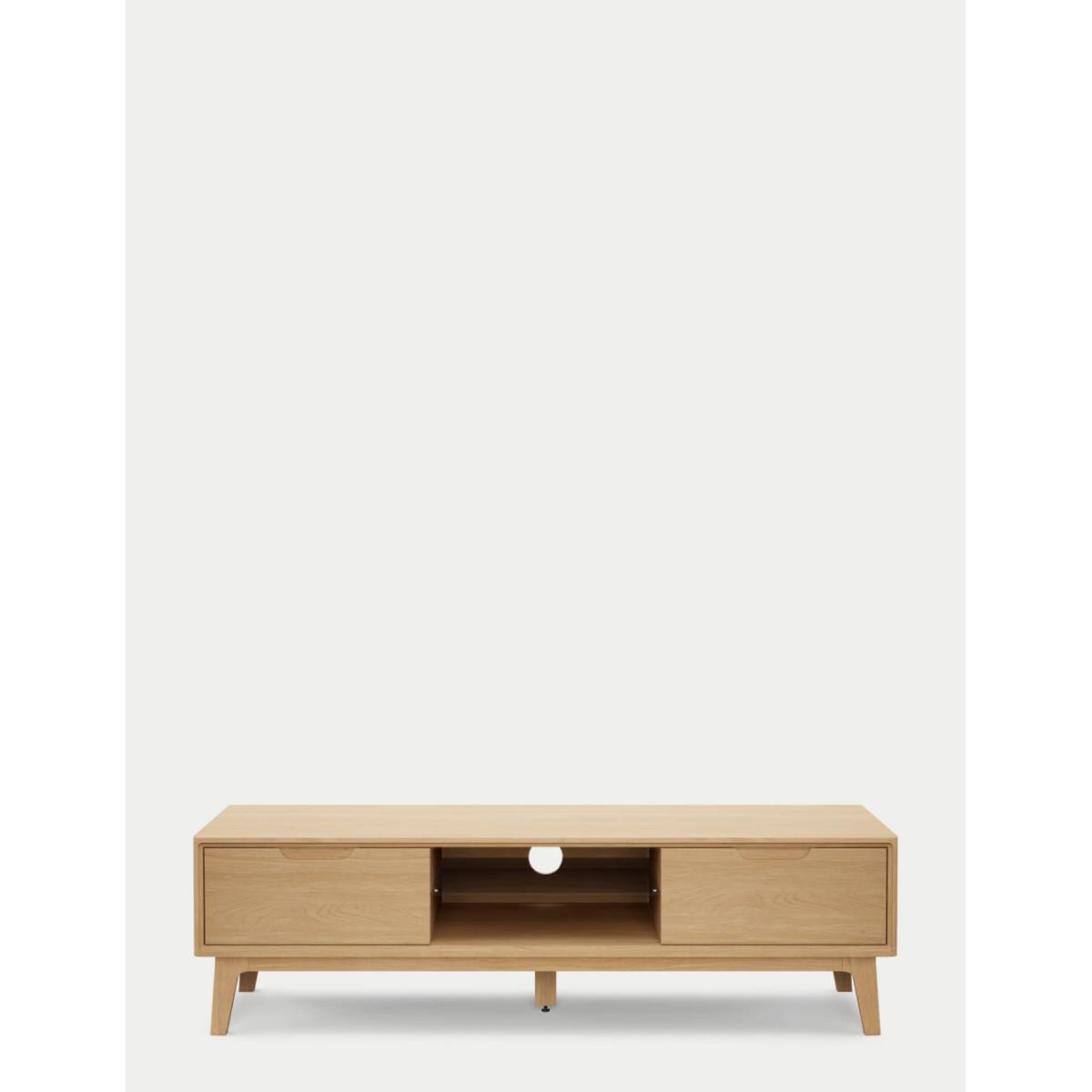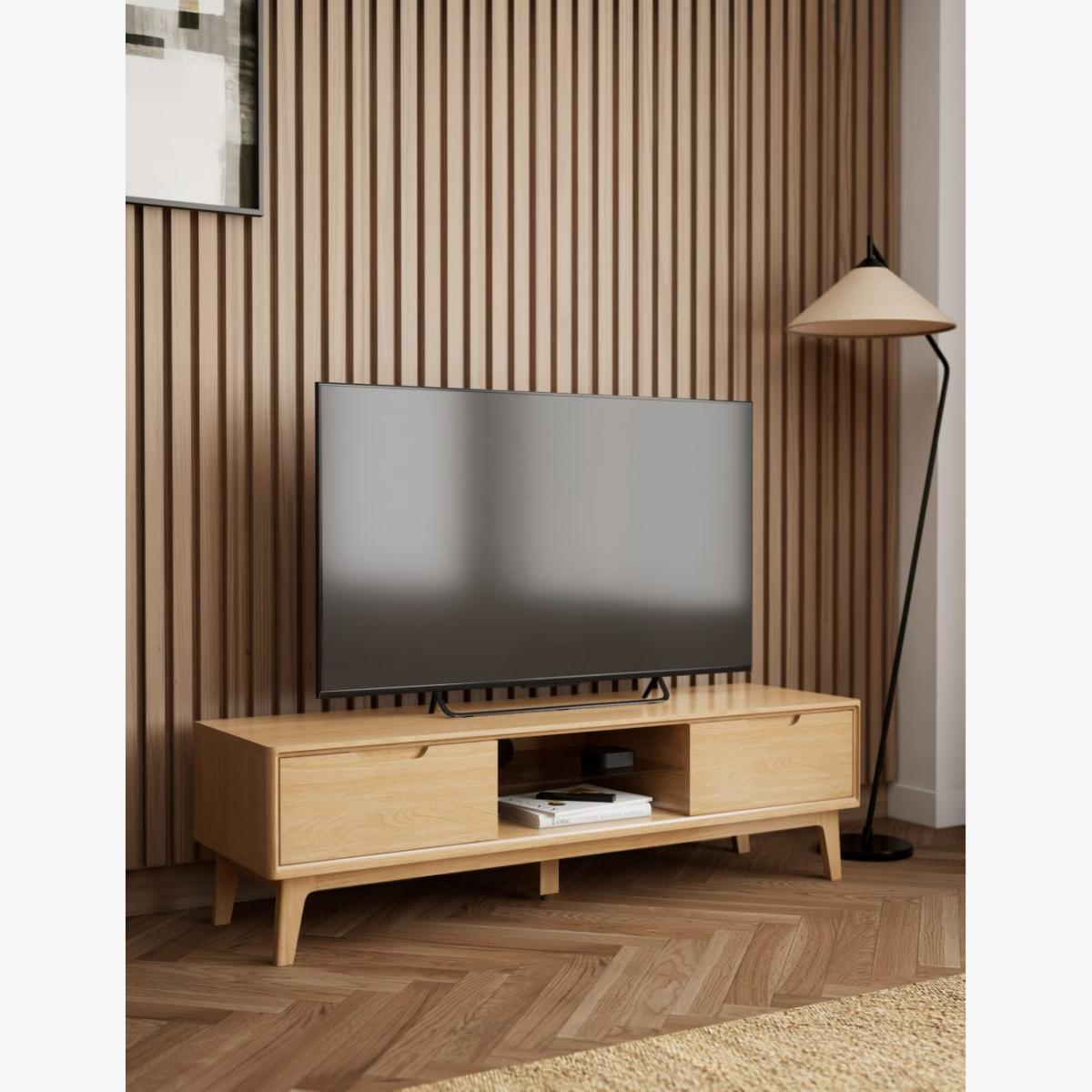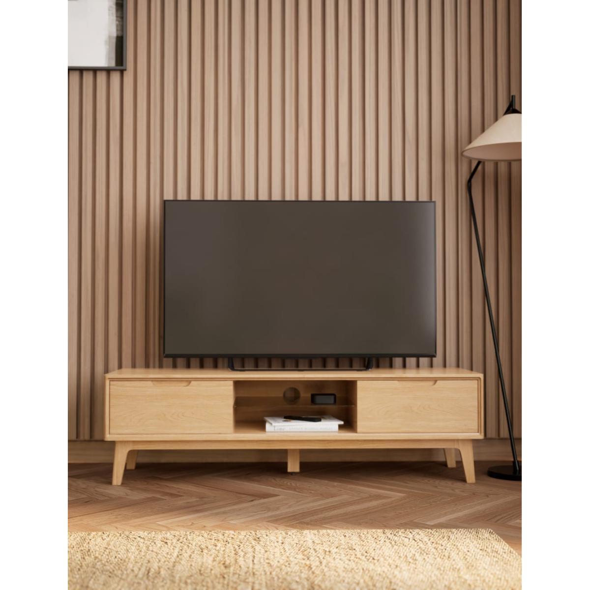 This large Nord TV unit is a stylish way to display your media and has been designed to fit TVs up to 65 inches. Crafted from solid oak and oak veneers it evokes a cool Scandi aesthetic with its low profile, clean-cut lines and gently splayed legs. Find ample storage space in its two drawers that open and close with neat carved handles. The middle section includes a glass shelf for optimal organisation, plus a hole at the rear to keep cables tidy and out of sight. An adjustable centre foot adds extra stability. Co-ordinating items in the Nord range are also available. We’re so confident our furniture is built to last, our industry-leading guarantee covers any manufacturing failure on all furniture. That’s our promise, and why our furniture comes with a 10-year guarantee that you can trust. Excludes: outdoor furniture and any issues that are a result of normal wear and tear, improper care or accidental damage.