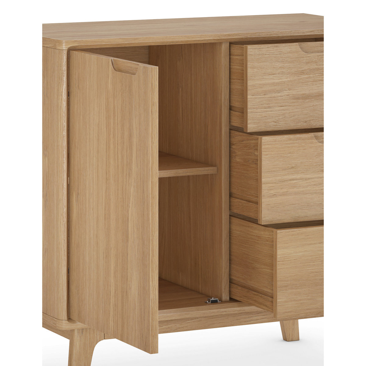 This modern Nord oak sideboard will become a focal point in your home. Crafted from light-coloured wood, this two-door design has plenty of storage space with a shelved unit and two drawers. Soft close mechanisms ensure there's no loud banging, to keep your space serene. Find matching items in our full Nord range. We’re so confident our furniture is built to last, our industry-leading guarantee covers any manufacturing failure on all furniture. That’s our promise, and why our furniture comes with a 10-year guarantee that you can trust. Excludes: outdoor furniture and any issues that are a result of normal wear and tear, improper care or accidental damage.