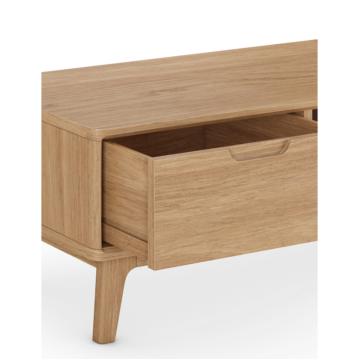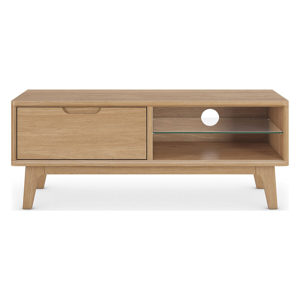 This sleek media unit from our Nord range is the perfect place to display your TV and keep consoles and wires organised. Made from sustainable wood in a beautifully light or dark stain to suit your decor, this four-leg design includes a space at the back to hide pesky cables. It boasts plenty of storage too, with a large drawer and glass shelving that can be swapped to suit your preferences. Discover matching items in the rest of our Nord range.