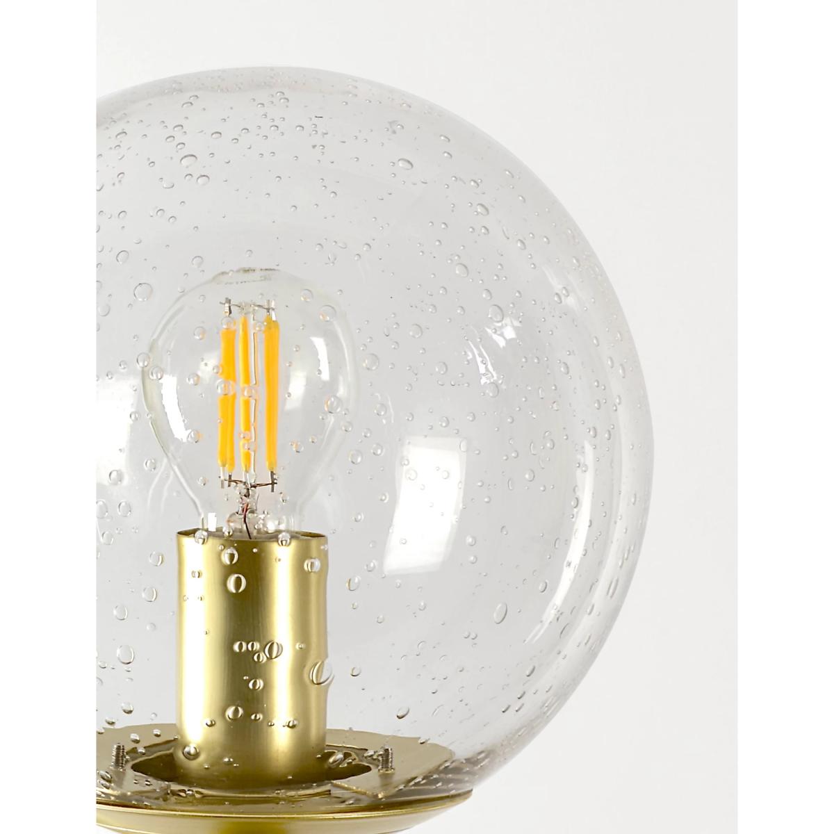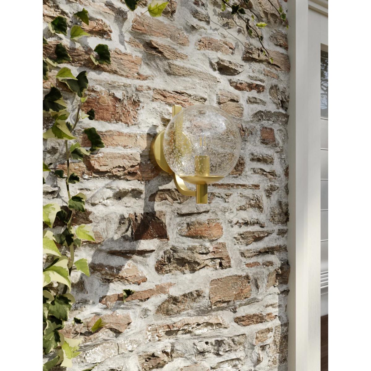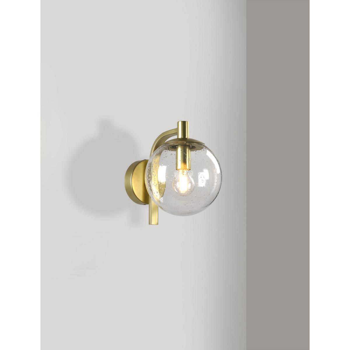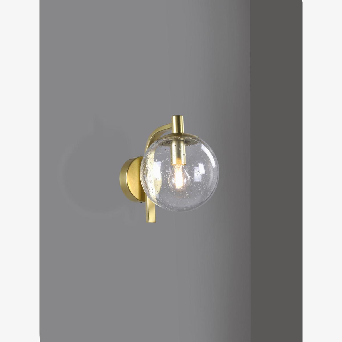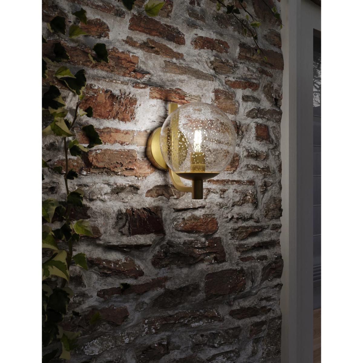 Jazz up your exterior space with this glass wall light. The bulb is housed in a clear glass sphere with a bubble effect in the seeded glass. It's supported on a smart curved brass arm which can be oriented above or below the sphere. The bulb holder creates a candelabra-style finish. It is designed for use with an energy efficient LED light bulb so you can choose the perfect brightness for the outside of your home or garden.