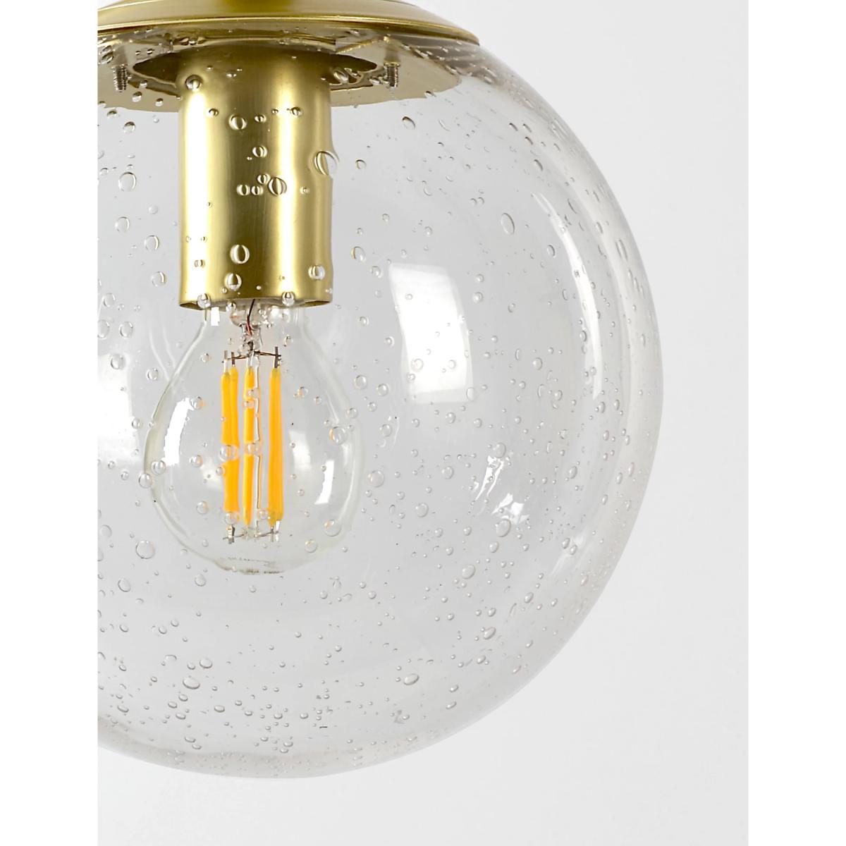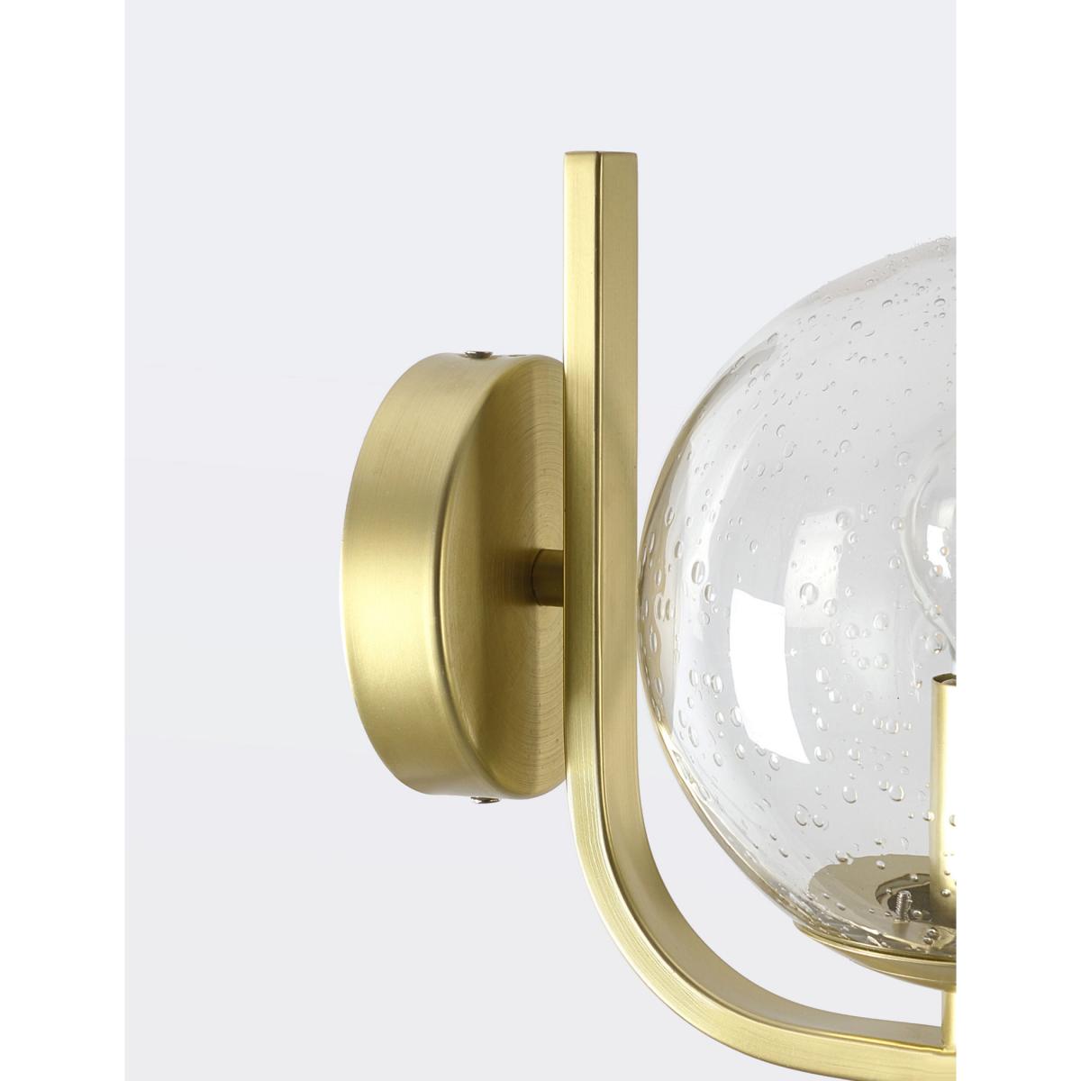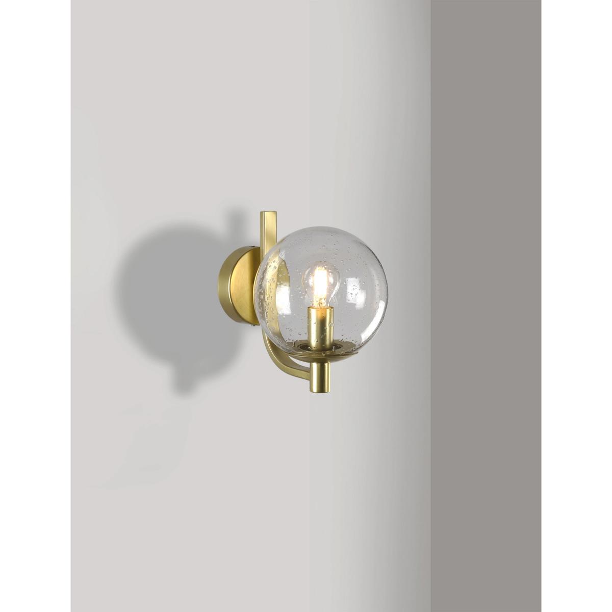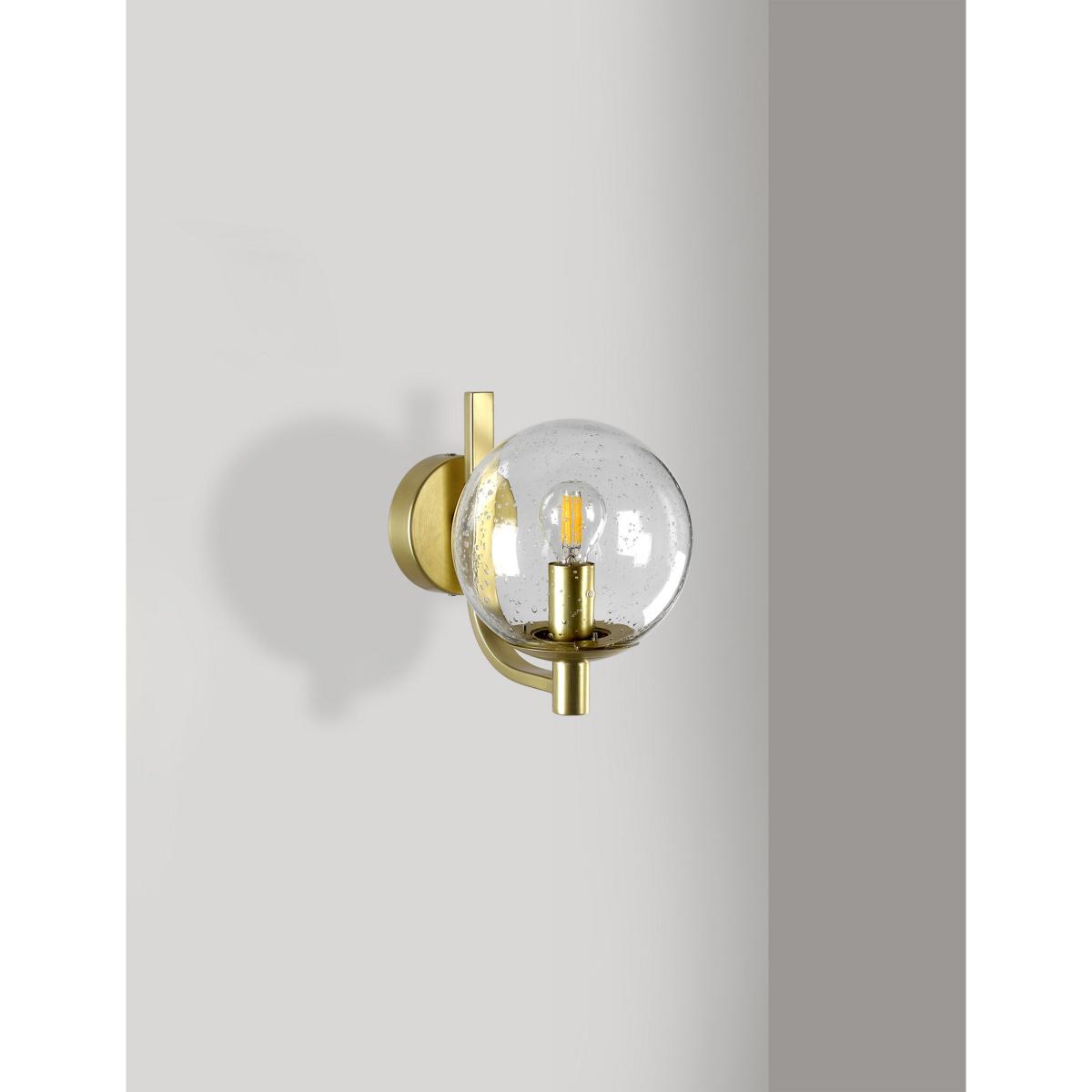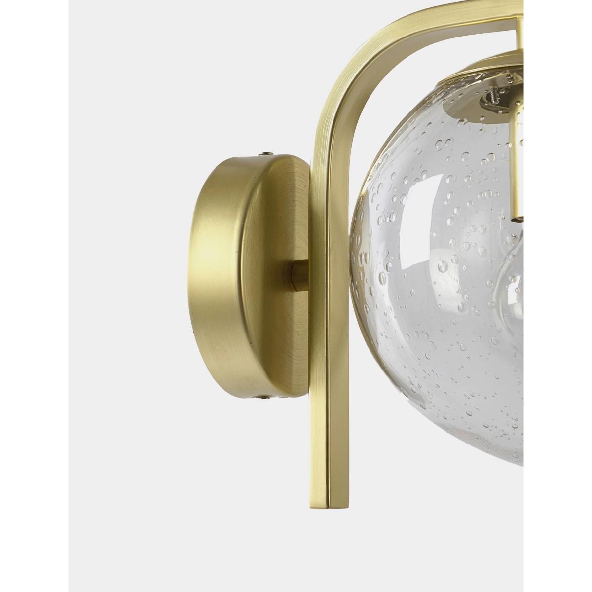 Jazz up your exterior space with this glass wall light. The bulb is housed in a clear glass sphere with a bubble effect in the seeded glass. It's supported on a smart curved brass arm which can be oriented above or below the sphere. The bulb holder creates a candelabra-style finish. It is designed for use with an energy efficient LED light bulb so you can choose the perfect brightness for the outside of your home or garden.