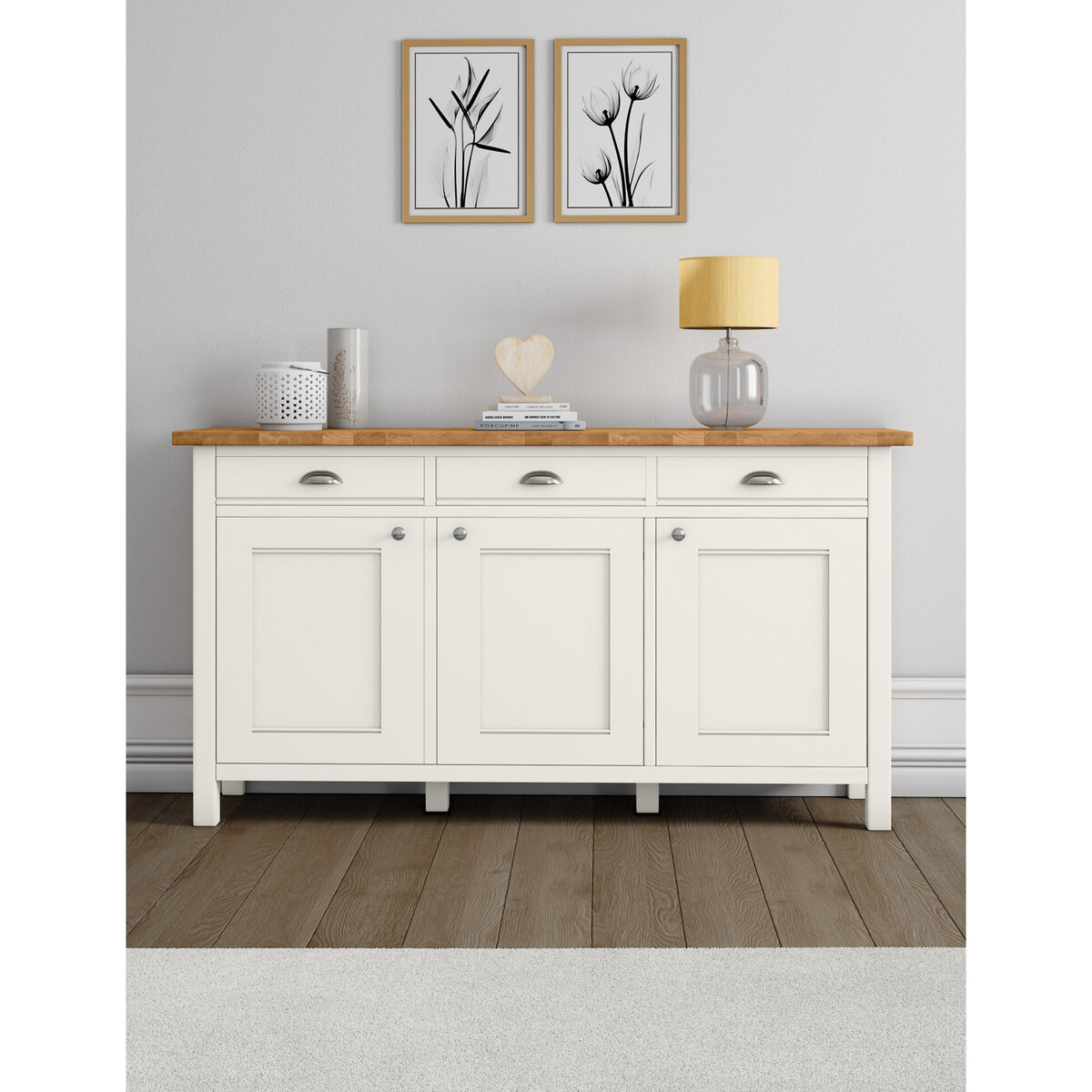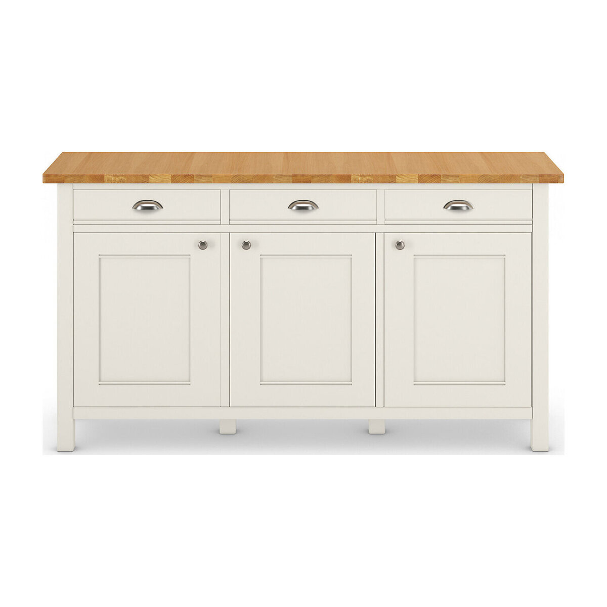 Natural oak veneer meets a painted finish in our Padstow range. Giving traditional country styling a modern twist, this sideboard includes three drawers, one single-width and one double-width cupboard. Central shelves to the cupboards make the most of the space while a protective low-sheen lacquer gives extra durability. Matching Padstow pieces are available.