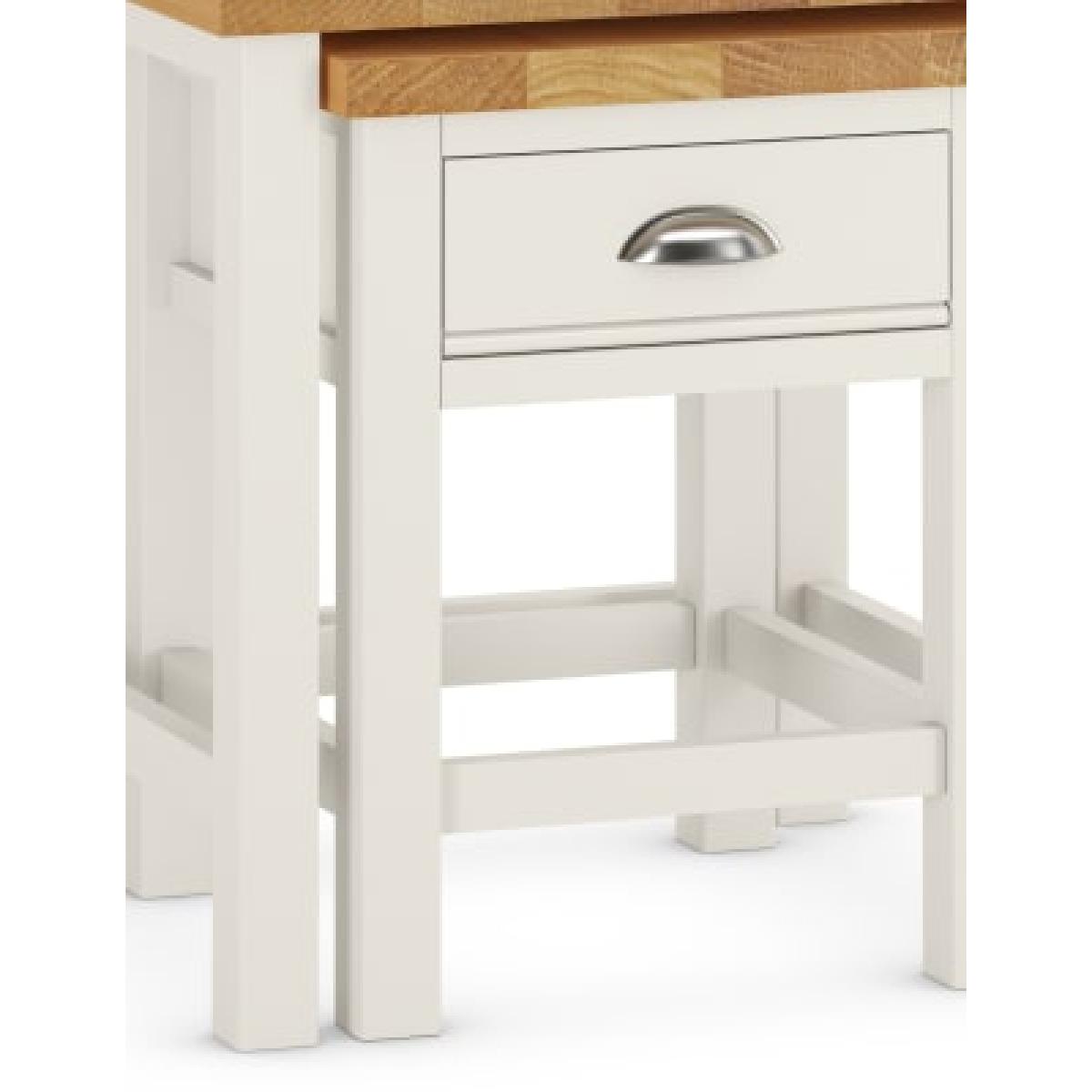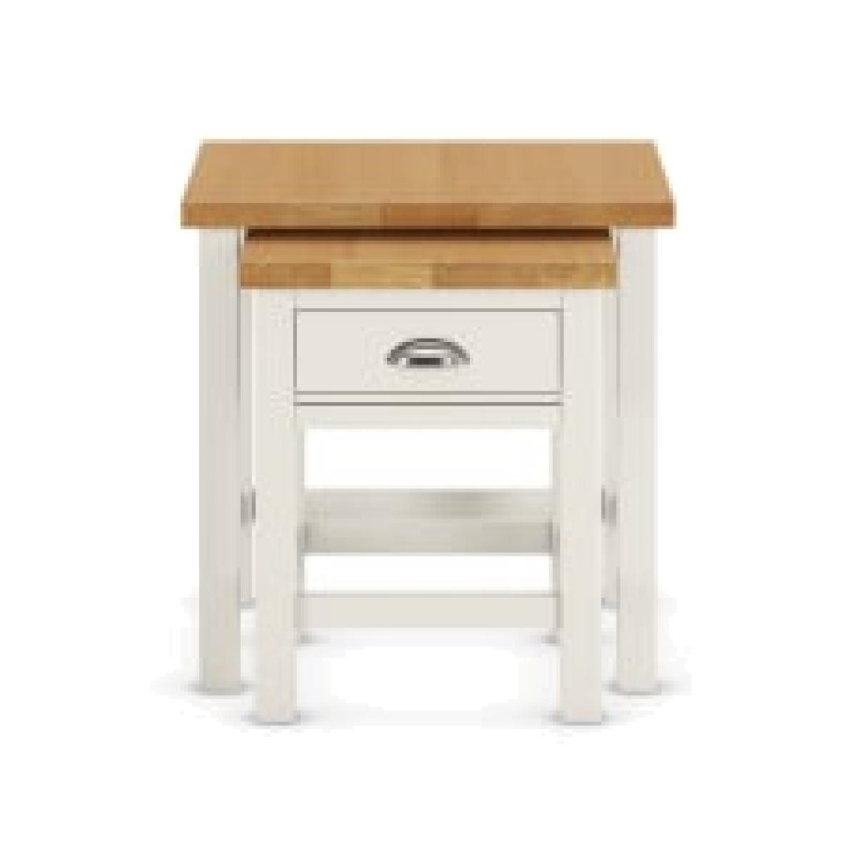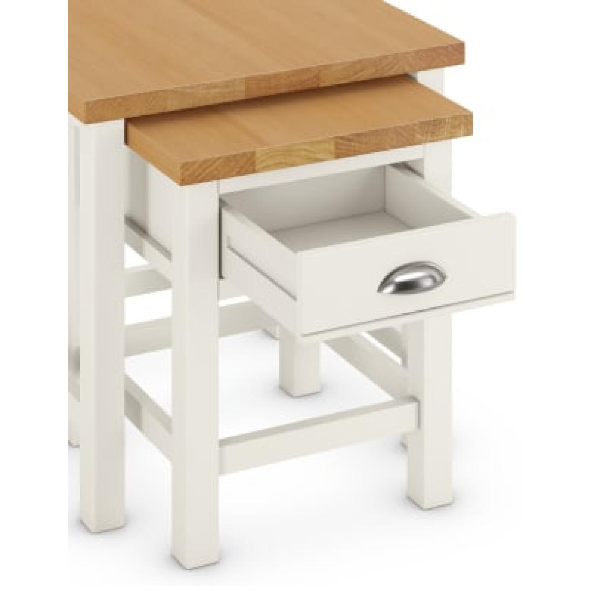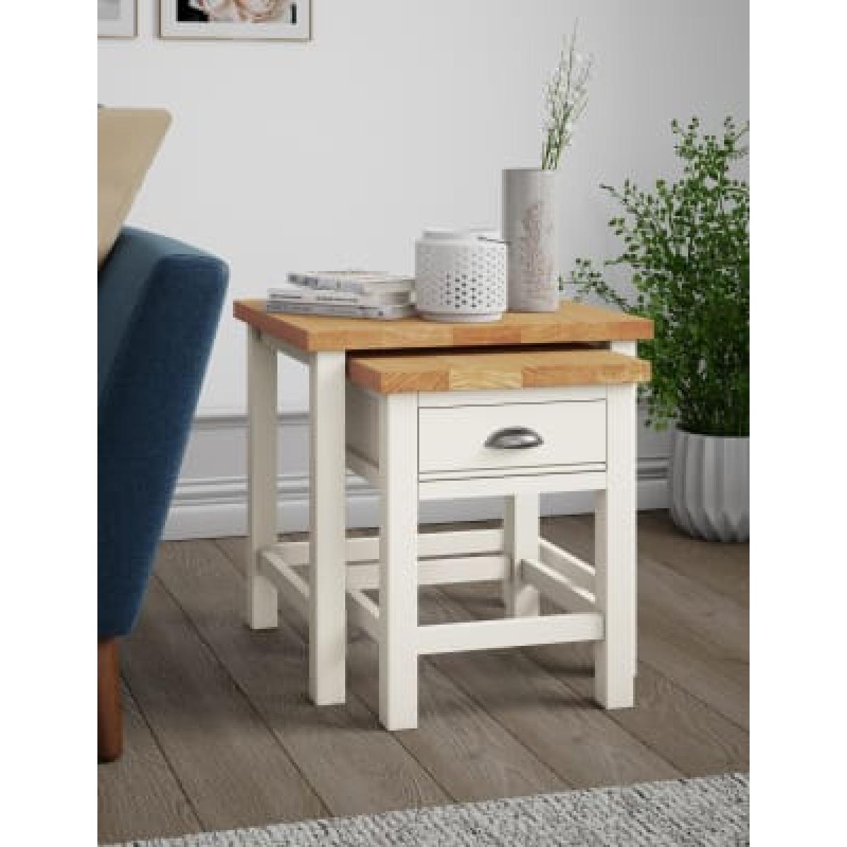 Our Padstow range combines oak veneer with painted wood for a contemporary twist on traditional country styling. These sturdy nesting tables have an integral storage drawer with moulded detailing to the base. Finished with a low-sheen lacquer for extra durability, a metal cup pull handle completes the look. We’re so confident our furniture is built to last, our industry-leading guarantee covers any manufacturing failure on all furniture. That’s our promise, and why our furniture comes with a 10-year guarantee that you can trust. Excludes: outdoor furniture and any issues that are a result of normal wear and tear, improper care or accidental damage.