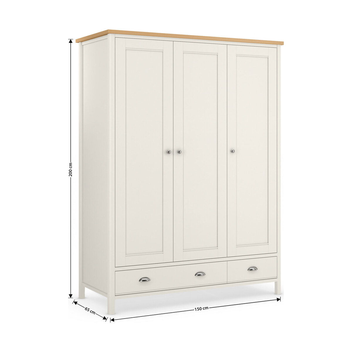 With its homely ivory finish and elegantly panelled doors, this substantial triple wardrobe provides all of the space you need to neatly store your clothing. Featuring two drawers, a clothing rail, and six storage compartments, you'll be able to keep everything in this cream wardrobe, from long coats to accessories and shoes. The oak top and oak handles contrast wonderfully with the cream colour, adding another layer of visual interest. Straight standing legs lift this wardrobe off the ground, giving it a lighter appeal.