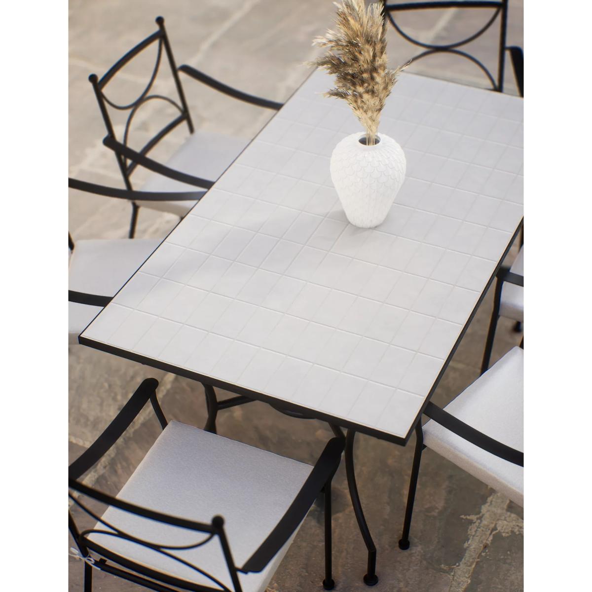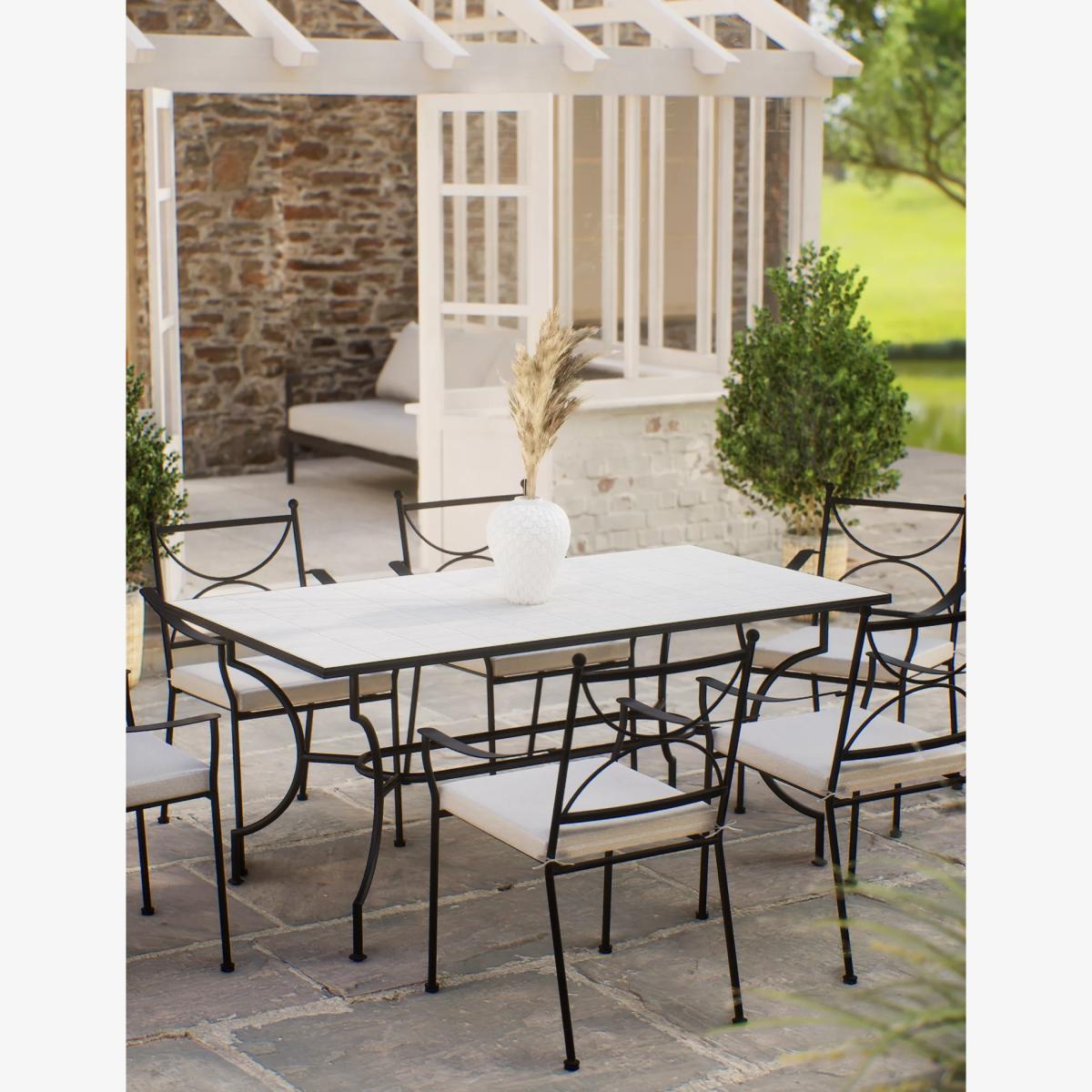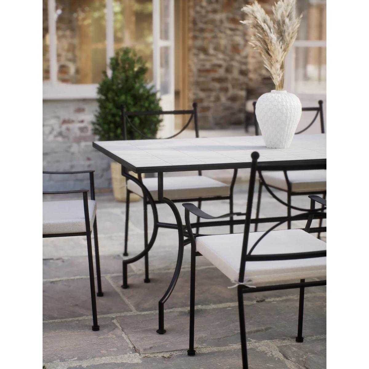 Host BBQs or outdoor dinners with this six-seater dining table and chair set from the Pembroke collection. The table features a glazed tiled top for a modern feel that will fit in with most decors. All the chairs come with coordinating cushions for extra comfort, while the whole set features an antique-finish metal frame with a high-quality powder coating for durability.