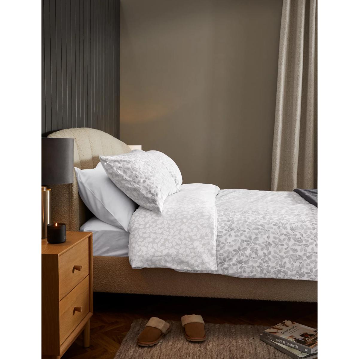 I love this bedding set for its understated, natural appeal and versatile colour palette. The brushed cotton fabric adds a cosy, soft touch, making it perfect for creating a relaxed and inviting bedroom. It works particularly well in neutral or minimalist interiors, but also complements rustic, country styles with its leaf pattern and natural tone. To style it effectively, pair it with textured throws or cushions in muted colours or earthy tones for added depth. For a quick update, introducing warm wood accents or layered textiles can elevate the look without overpowering its simple charm. Overall, it’s a practical yet sophisticated choice for anyone seeking a timeless, comfortable bed setup.