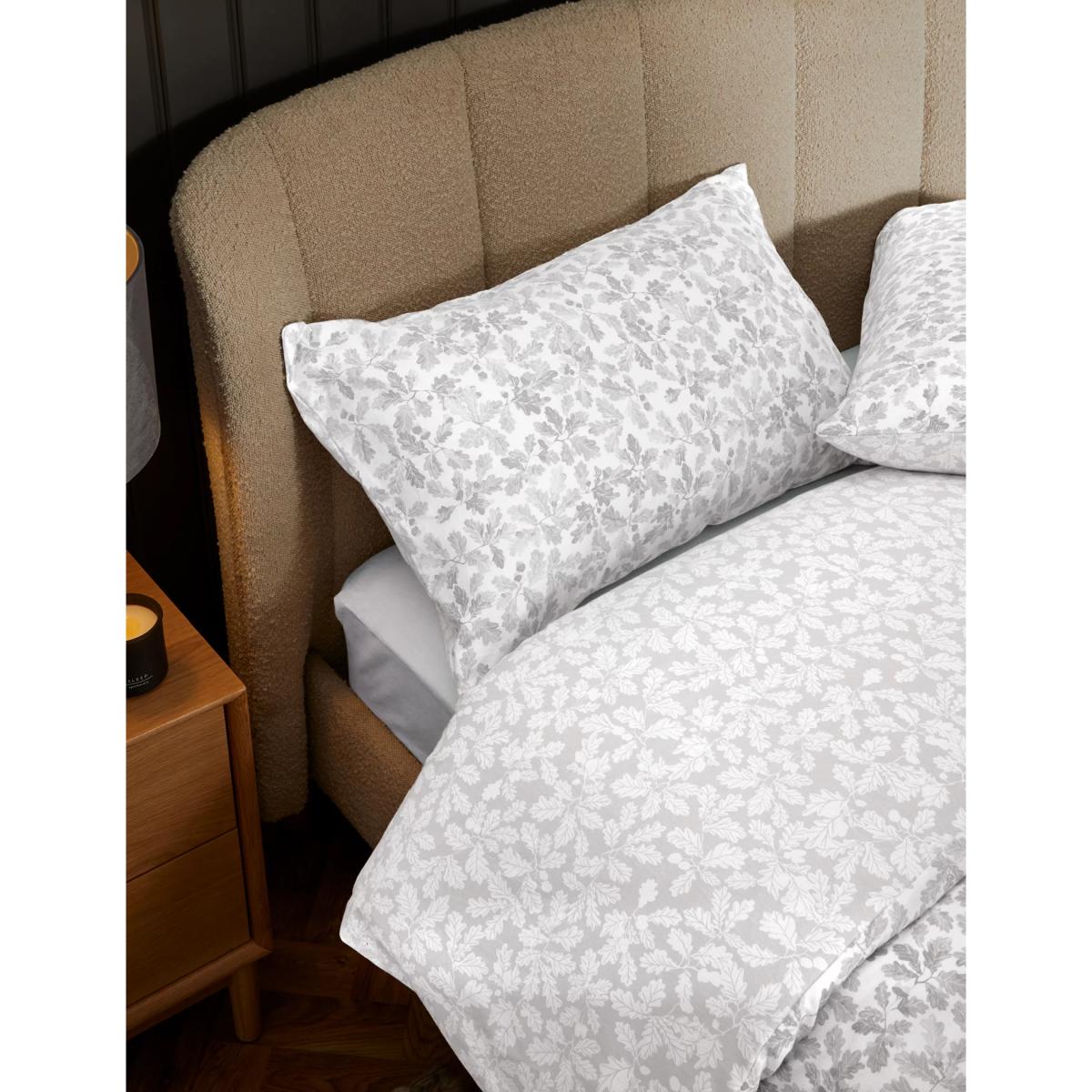 The pure cotton fabric of this bedding set is brushed for extra softness on skin. It's adorned with a charming print of delicate oak leaf sprigs, dotted with acorn cups. A reverse-colour design features on the back, giving you a choice of two looks. It is finished with a button fastening.