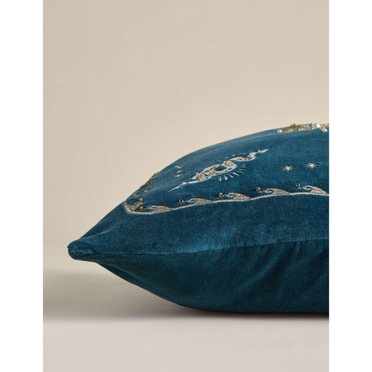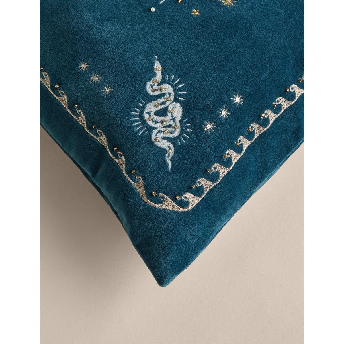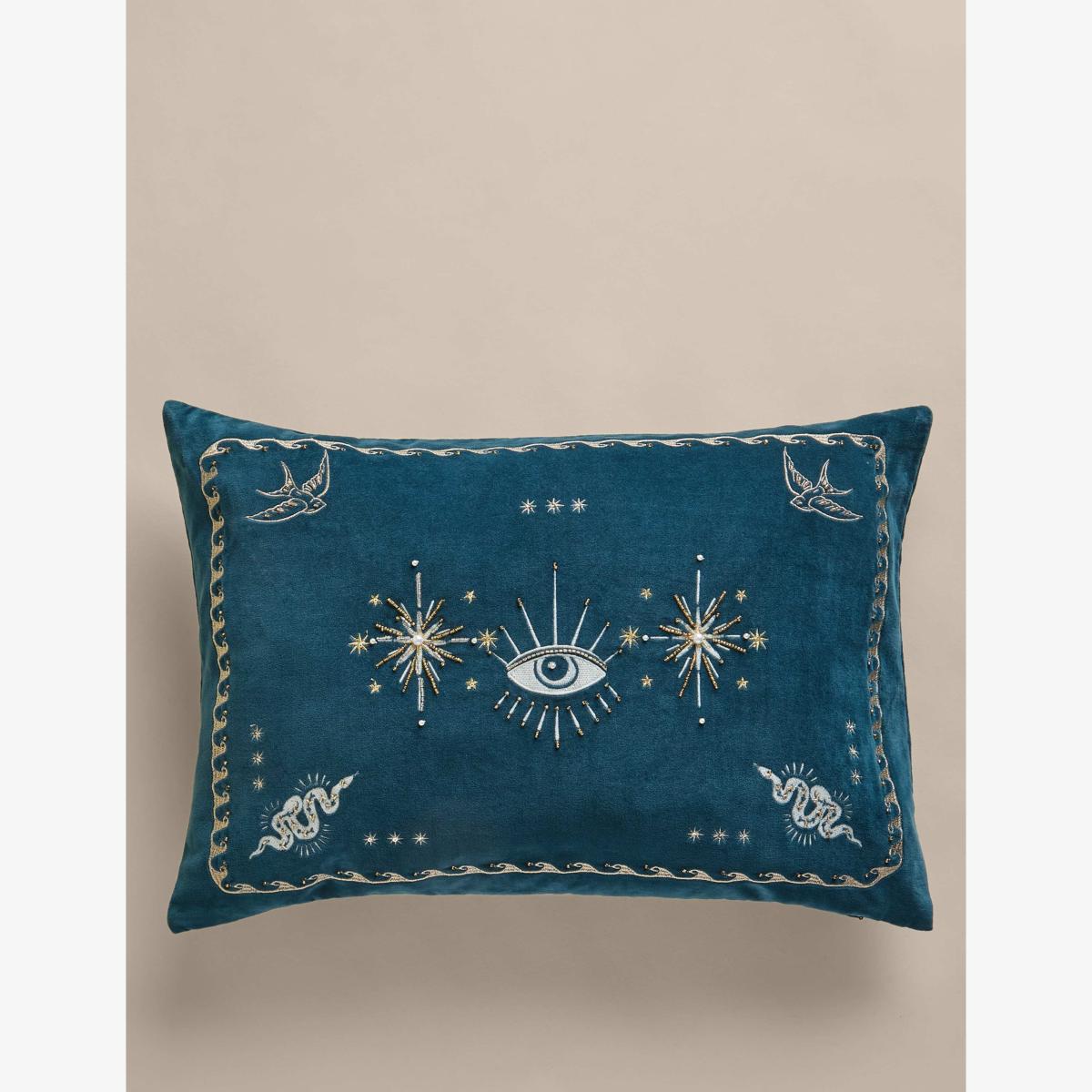 Bring celestial charm to your room with this plush velvet bolster cushion. It's made in a classic rectangular shape from pure cotton. The embroidered design features stars, an eye, birds and snakes, framed by a curling wave border. Beaded and sequin embellishment adds sparkly detail.