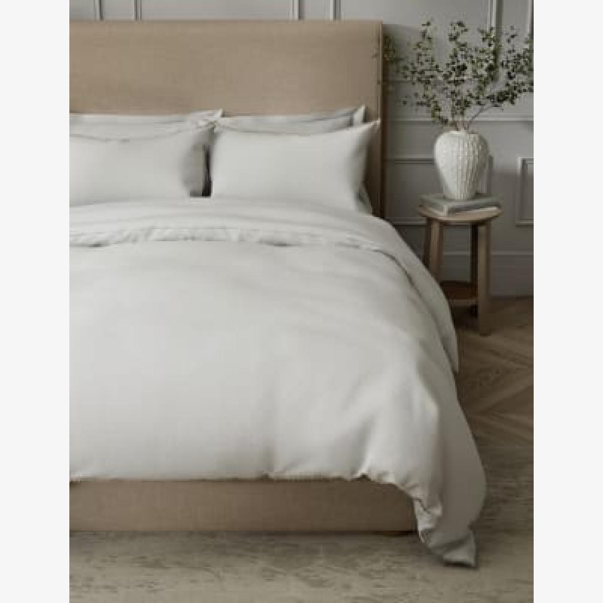 I love this duvet set for its classic and versatile look-white with subtle stripes, it adds a fresh, clean feel to any bedroom. It works particularly well in contemporary or minimal interiors where simplicity is key, but it can also be layered with colourful cushions or throws to create a more eclectic vibe. Practical styling tips include pairing it with natural textiles like linen or textured throws to add tactile interest, or keeping it crisp and minimal for a sleek, luxurious finish. Its pure cotton fabric ensures comfort and durability, making it a smart choice for those seeking effortless elegance and practicality in their bedding.