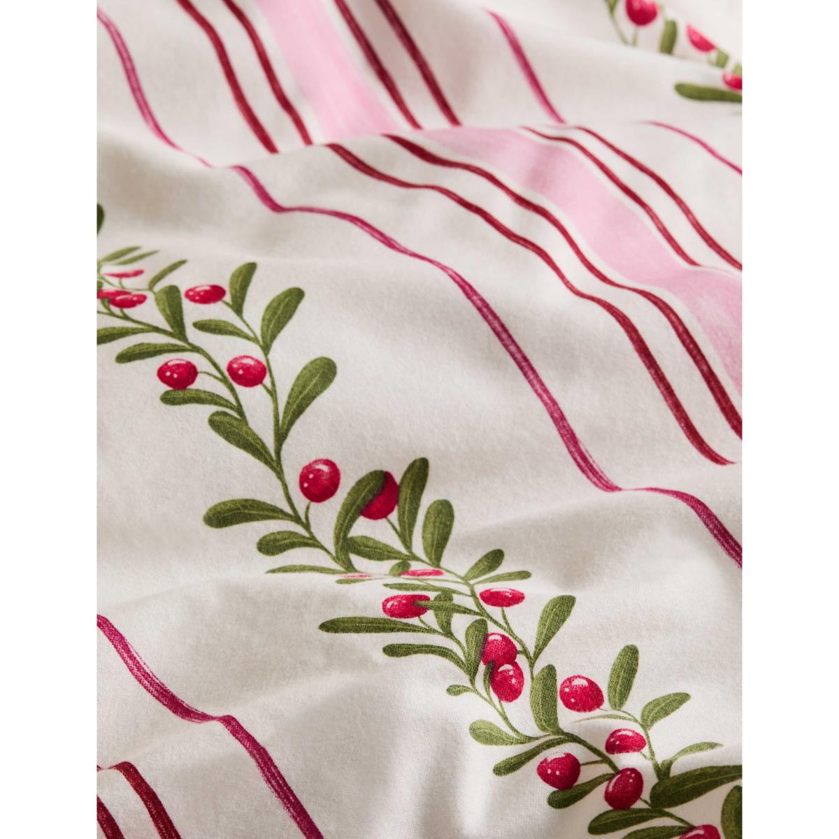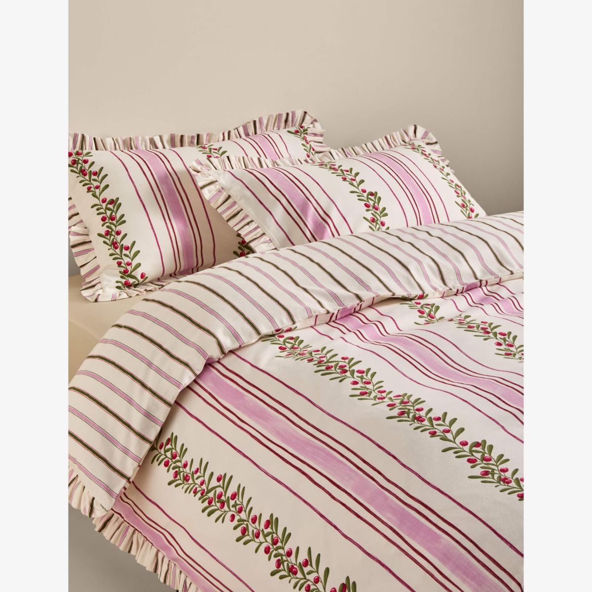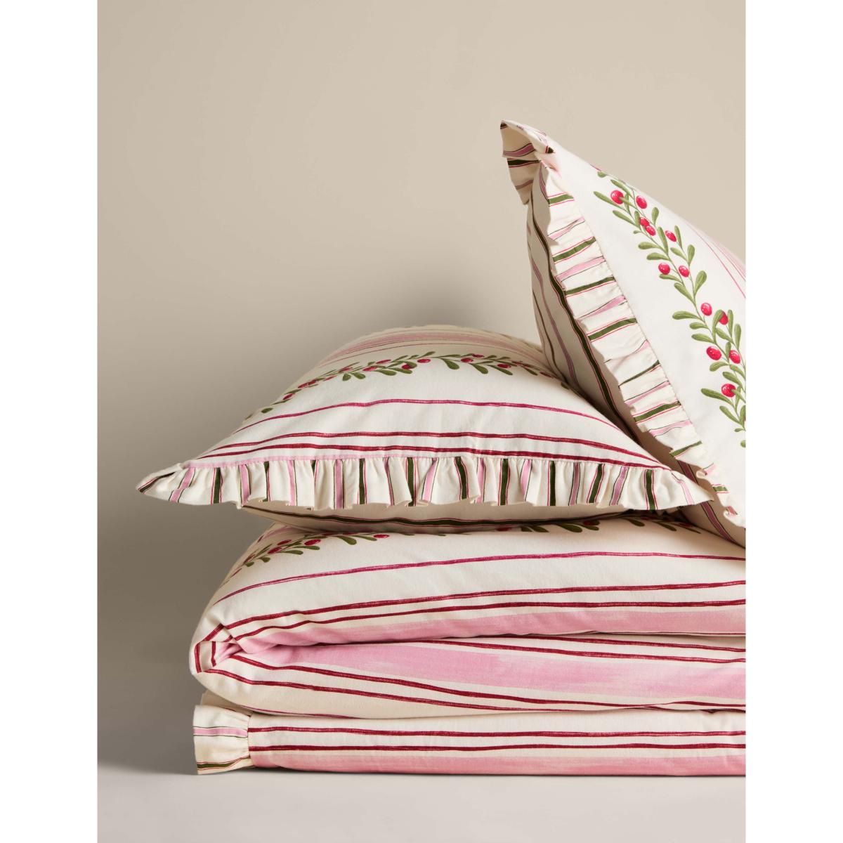 Bold stripes with winter foliage lend a seasonal touch to this pure cotton bedding set. Ruffle detail on the pillow cases adds a pretty feel, while a button fastening on the duvet cover keeps everything in place. The reverse features plain stripes for a coordinated look.