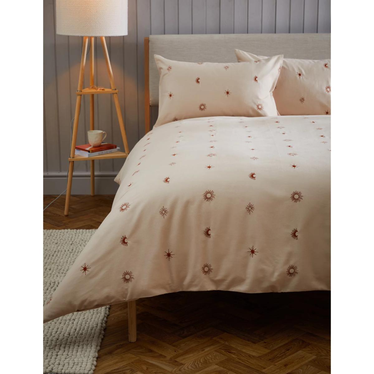 I love this duvet set because its neutral tones and celestial design make it versatile across various bedroom styles, from Scandi minimalism to cosy contemporary interiors. The sun and moon motif adds a gentle touch of whimsy without overwhelming the space, making it perfect for a relaxed, calming vibe. It works particularly well in bedrooms with soft, muted colour palettes or natural textures. For styling tips, consider pairing it with tactile throws or cushions in complementary earthy shades or subtle metallics to enhance the celestial theme. Keeping the rest of the bedding simple and layering with cosy accessories will ensure a harmonious, inviting look that's both functional and visually appealing.