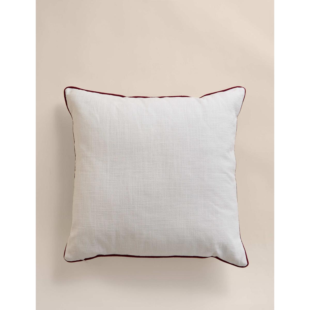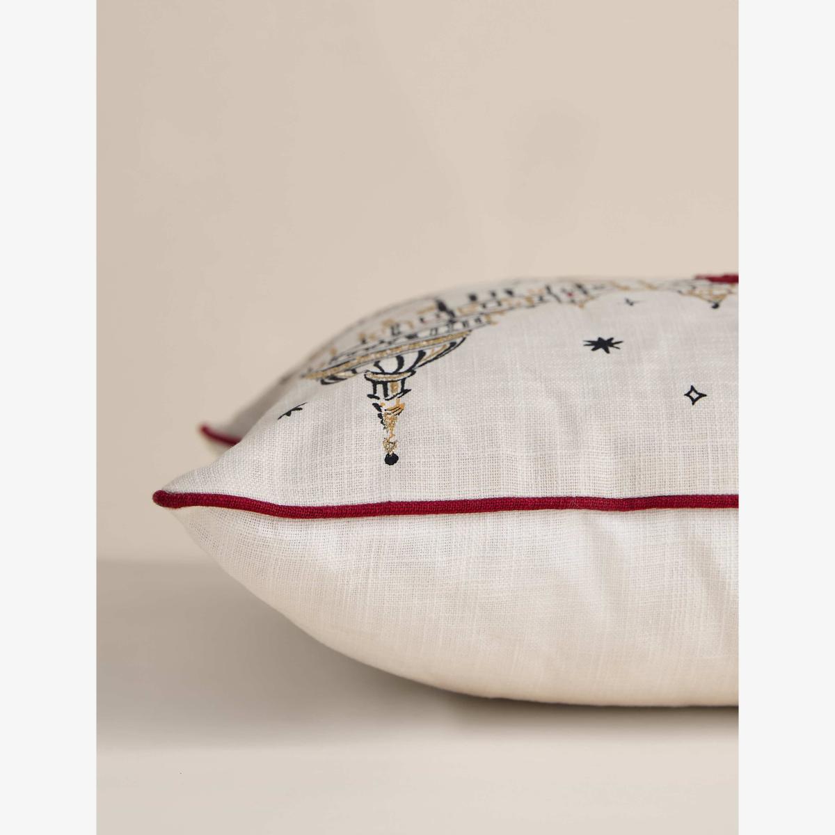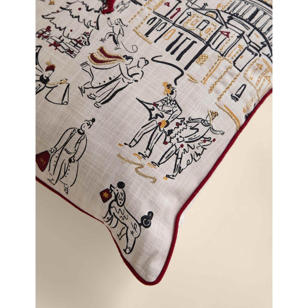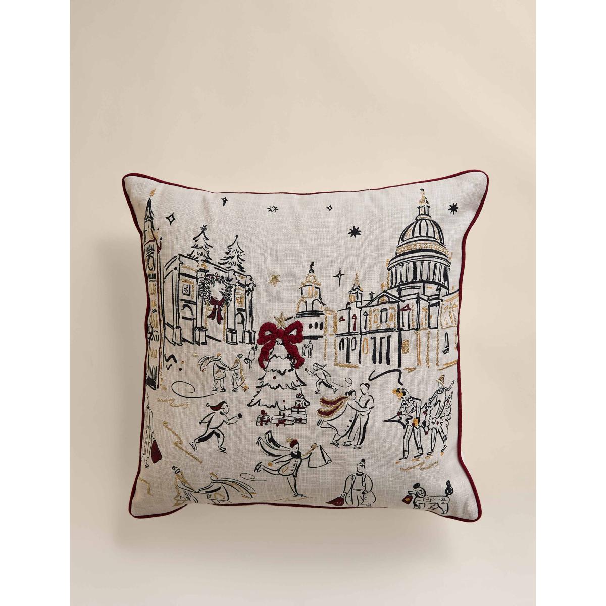 This pure cotton cushion captures a lively festive townhouse scene, complete with seasonal skaters and glittering landmarks. Embroidered details and sparkling thread bring depth to the design, while the Christmas tree is embellished with a textured bow for a decorative finish.