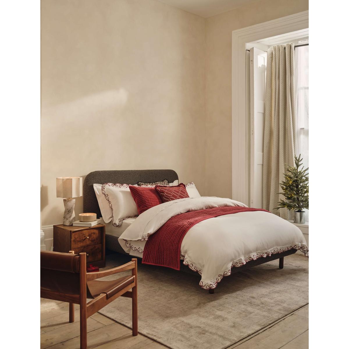 I love this bedspread for its rich, deep red hue and the luxurious velvety texture, which instantly adds warmth and sophistication to any bedroom. Its narrow stripe pattern offers subtle visual interest without overwhelming the space, making it versatile for both contemporary and classic interiors. It works particularly well layered over neutral or light bedding to create a cosy yet polished look. Practical styling tips include pairing it with crisp white or cream linens for contrast, or adding textured cushions in complementary shades for a more layered feel. This piece is a great option for creating an inviting, comfortable atmosphere while offering easy maintenance thanks to its durable cotton velvet fabric.