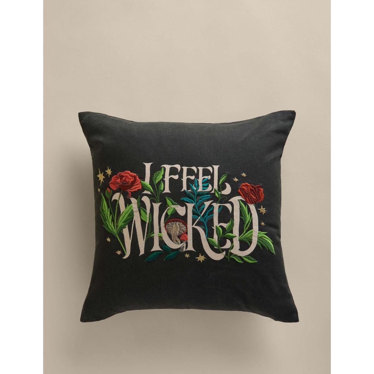 Celebrate the magic of the stage with this pure cotton square cushion, embroidered with the bold slogan 'I Feel Wicked.' Colourful florals and metallic star motifs surround the lettering for a striking finish.