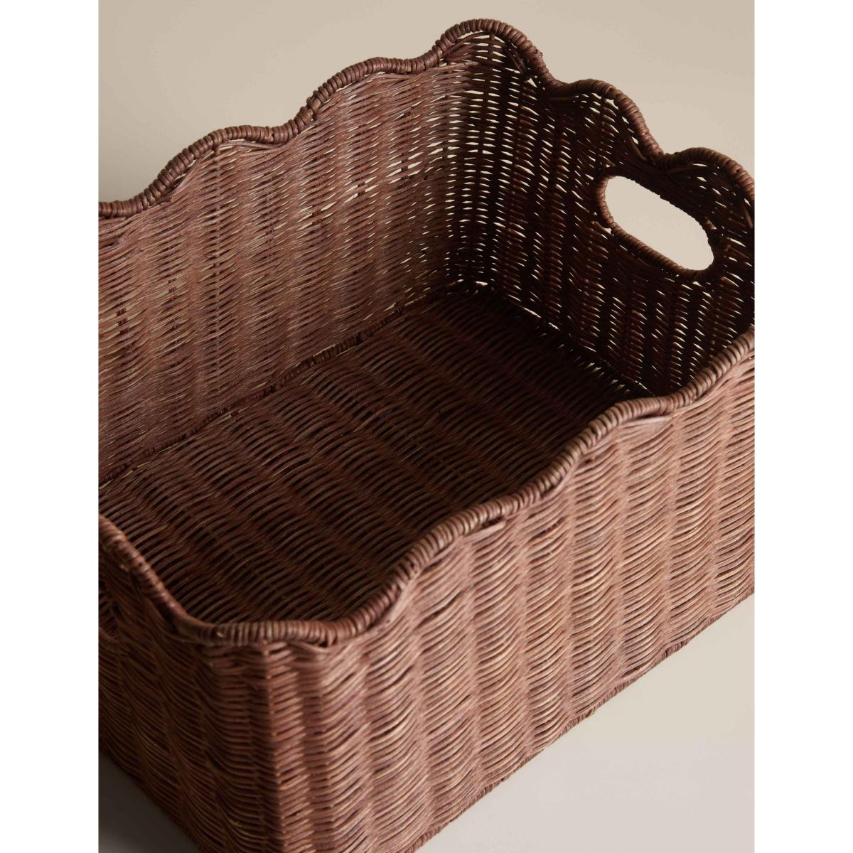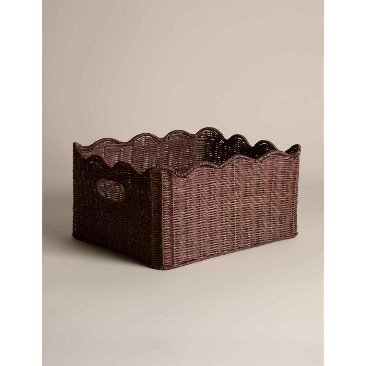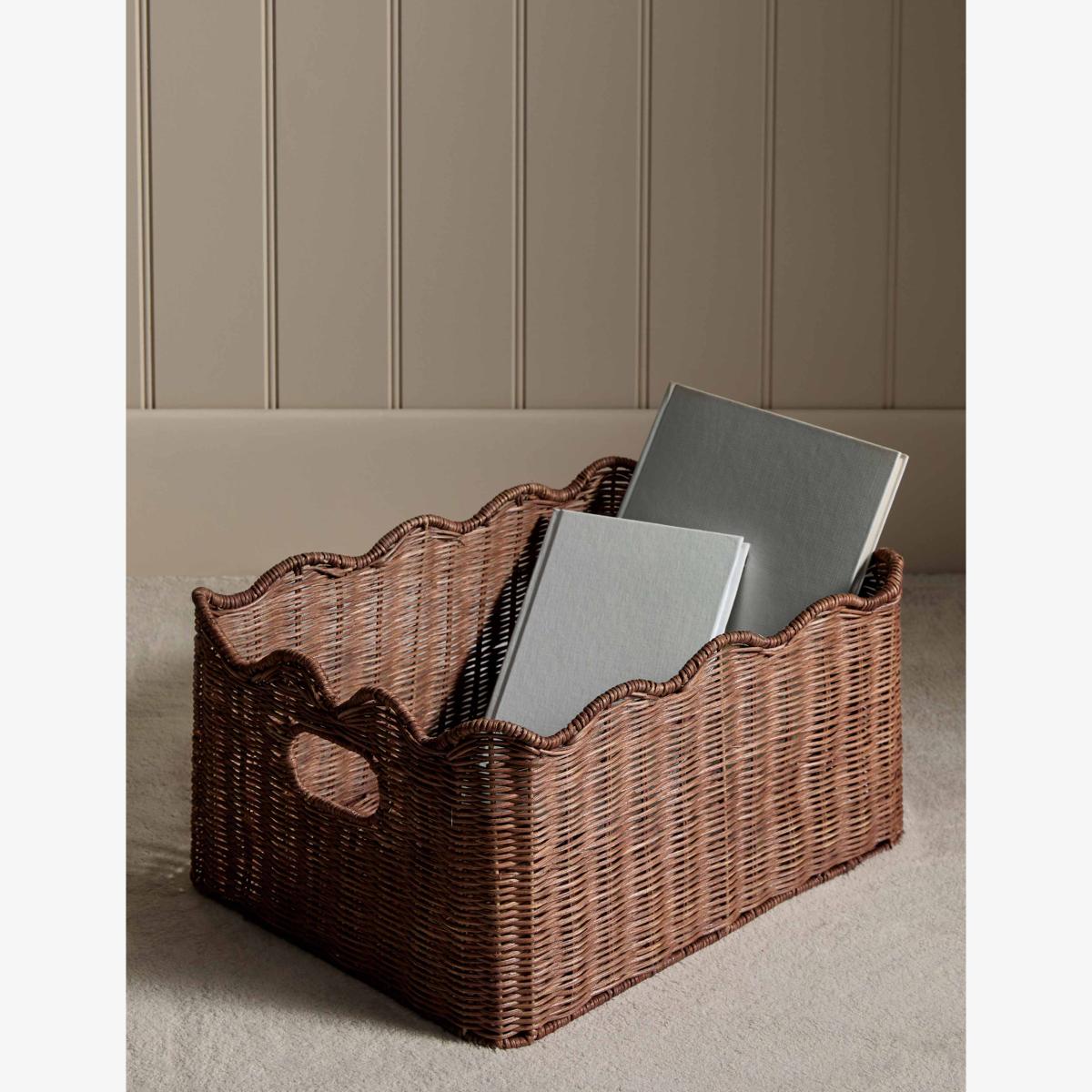 This rectangular rattan basket is topped with a scalloped edge for a decorative finish. Cut-out handles on either side make it easy to carry.