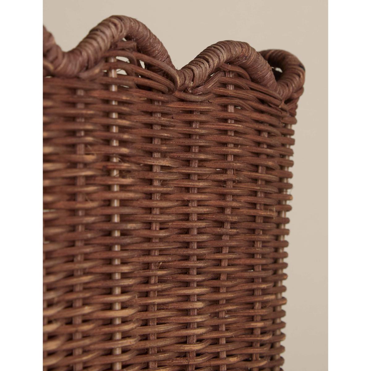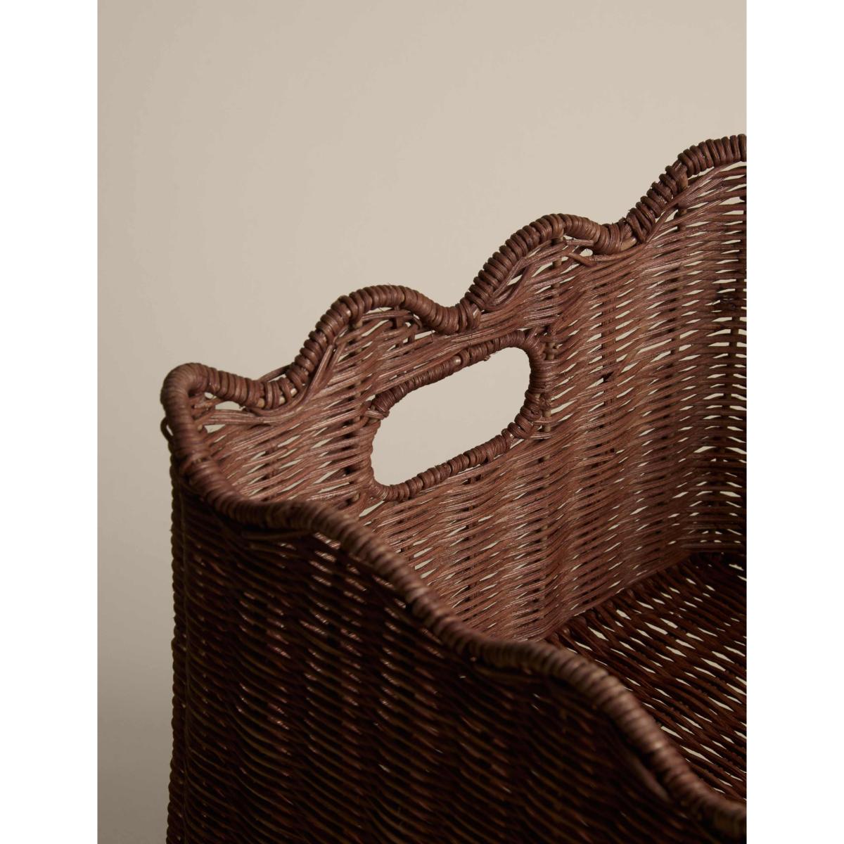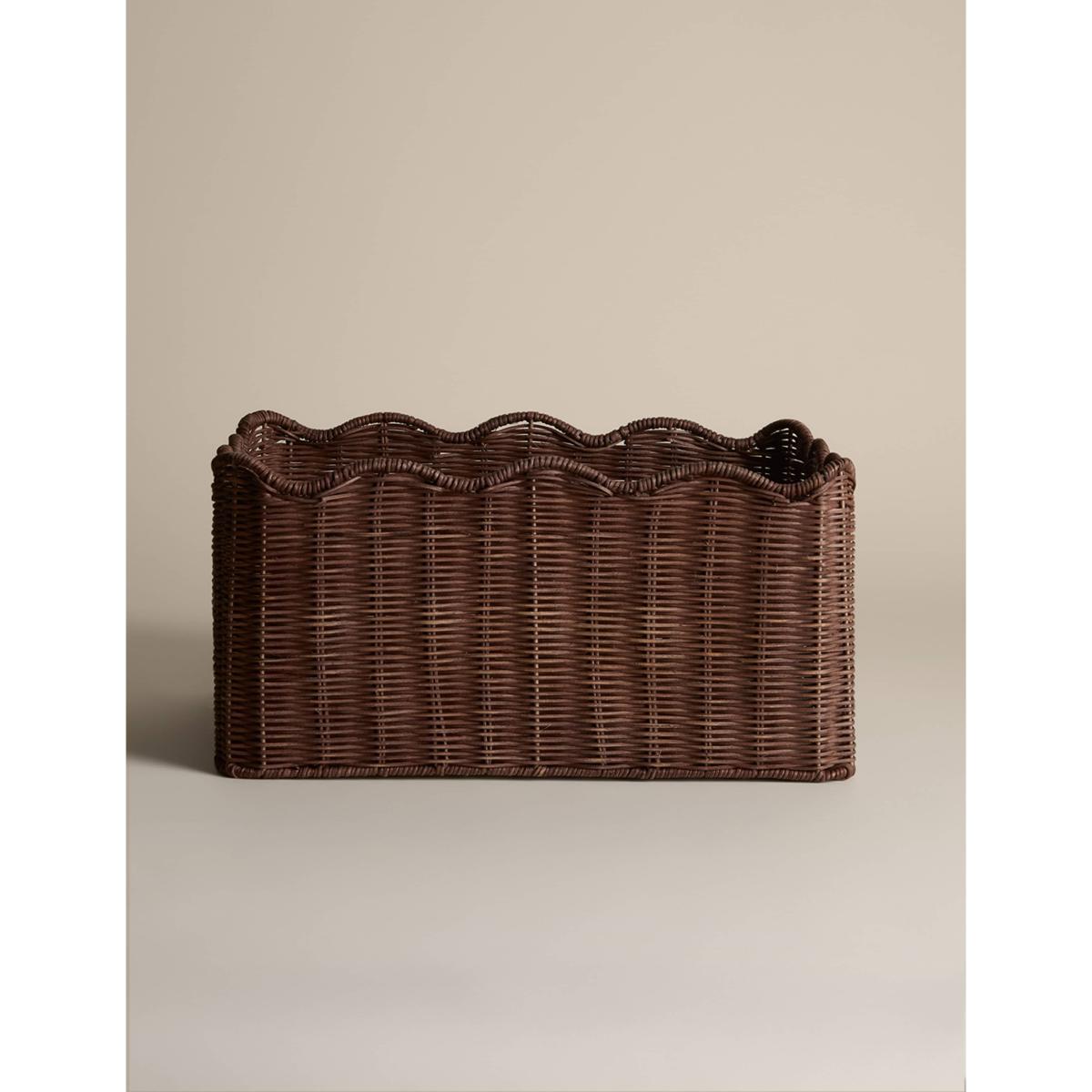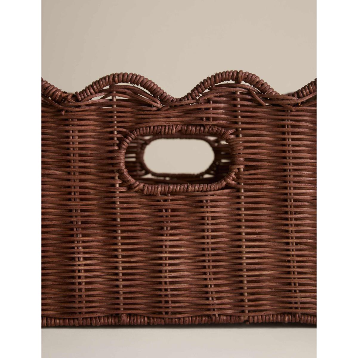 This rectangular rattan basket is topped with a scalloped edge for a decorative finish. Cut-out handles on either side make it easy to carry.