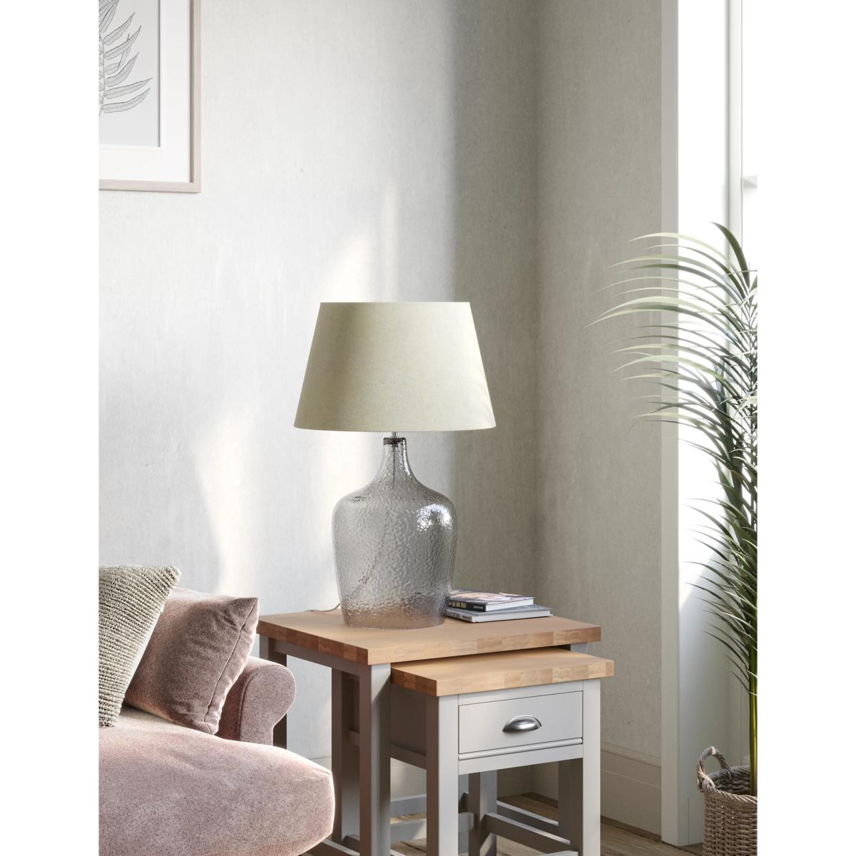 The Raven table lamp is made with a striking smoked glass base that ensures a contemporary look. The linen shade is double-lined to give a soft glow and the metalwork is crafted from satin nickel for a neat, understated finish. A matching pendant light is available.