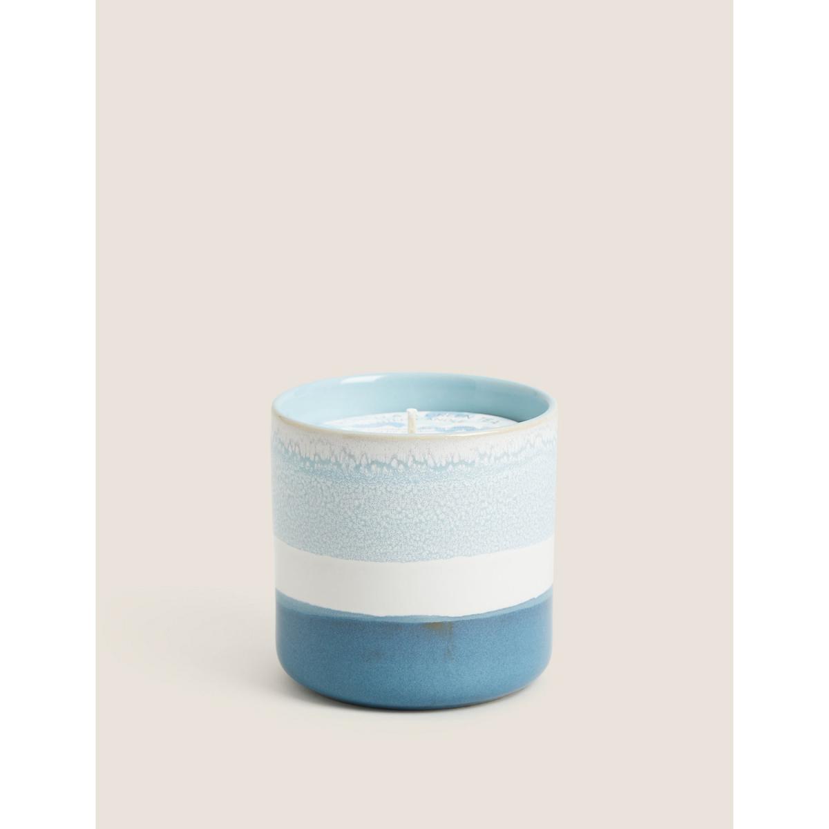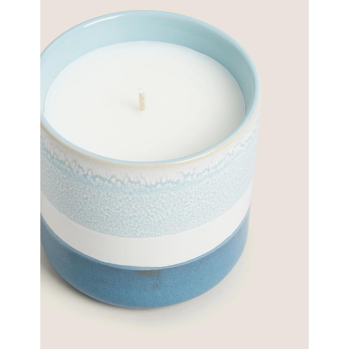 With its decorative pot, this candle doubles up as an eye-catching ornament in your home. It's fragranced with calming notes of green tea and citronella. A blue and white reactive glaze creates a unique striped effect on each pot.