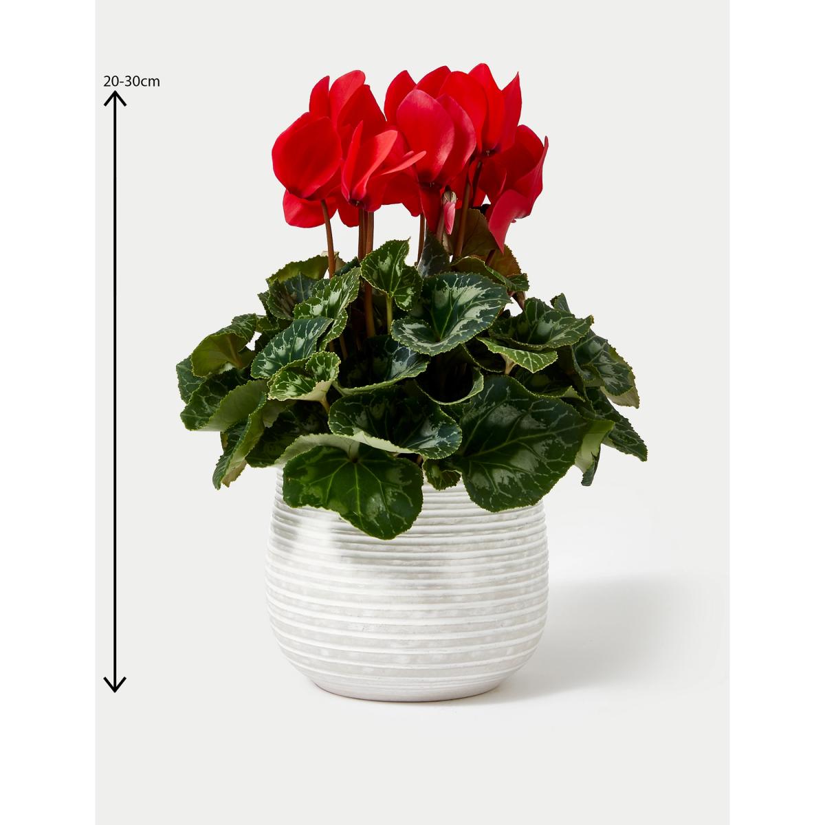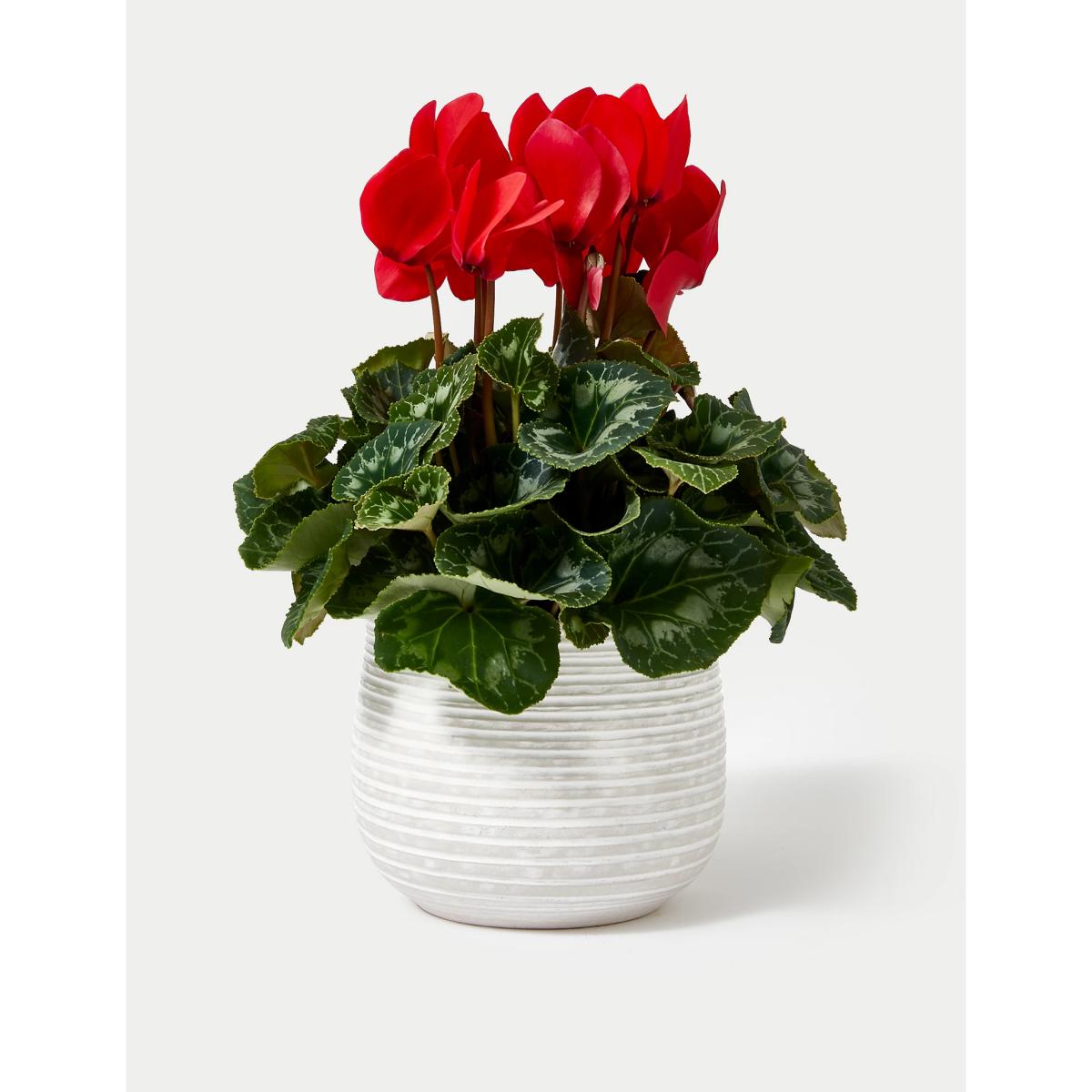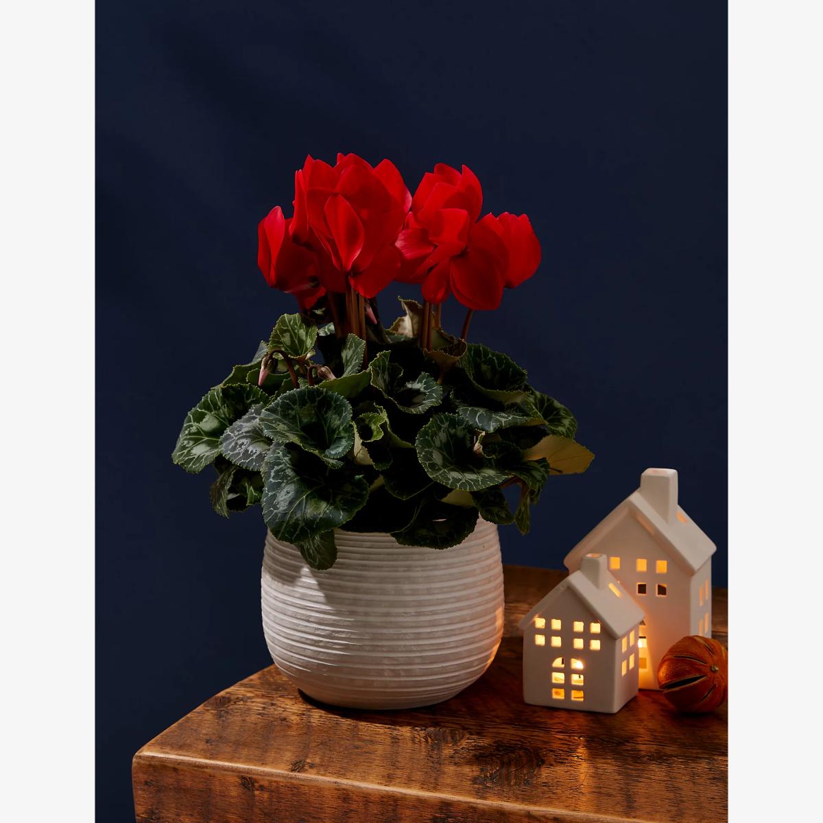 Treat someone special to a traditional Christmas bloom with this red cyclamen plant. It's presented in a white ceramic planter, hand-made in Portugal so each one is unique. Colours may vary slightly throughout the season.