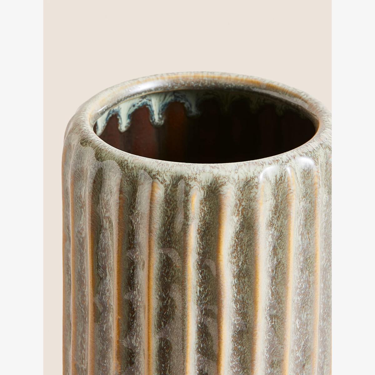 This medium-sized ceramic vase is crafted in a ribbed shape for a contemporary, organic look. The reactive glaze gives each piece its own unique and charming finish.