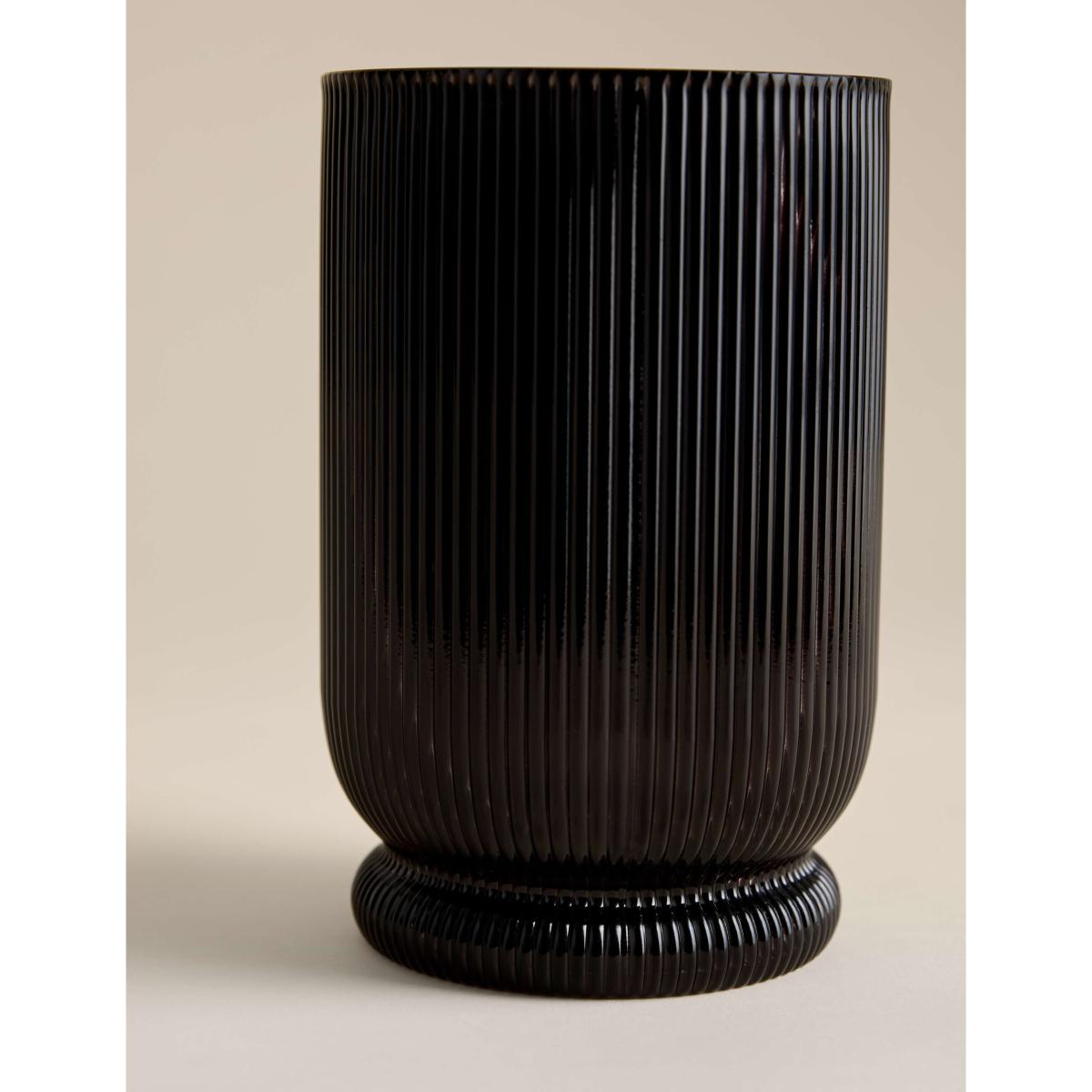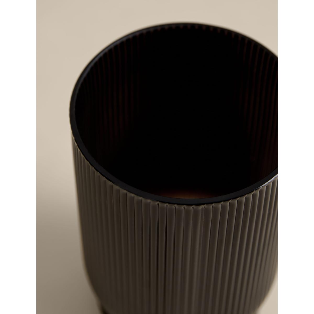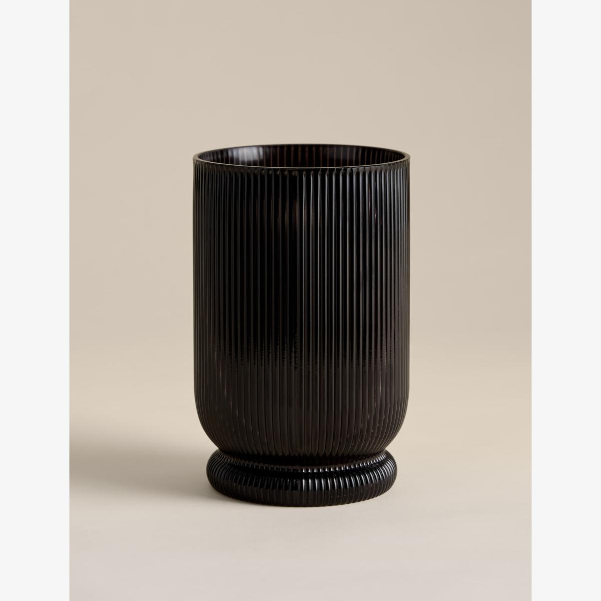With its deep tone and ridged glass design, this hurricane candle holder adds sculptural elegance to your setting. The cylindrical shape and raised base lend a contemporary feel, while the textured surface softly diffuses candlelight for a warm, ambient glow. Perfect as a standalone accent or styled in pairs.