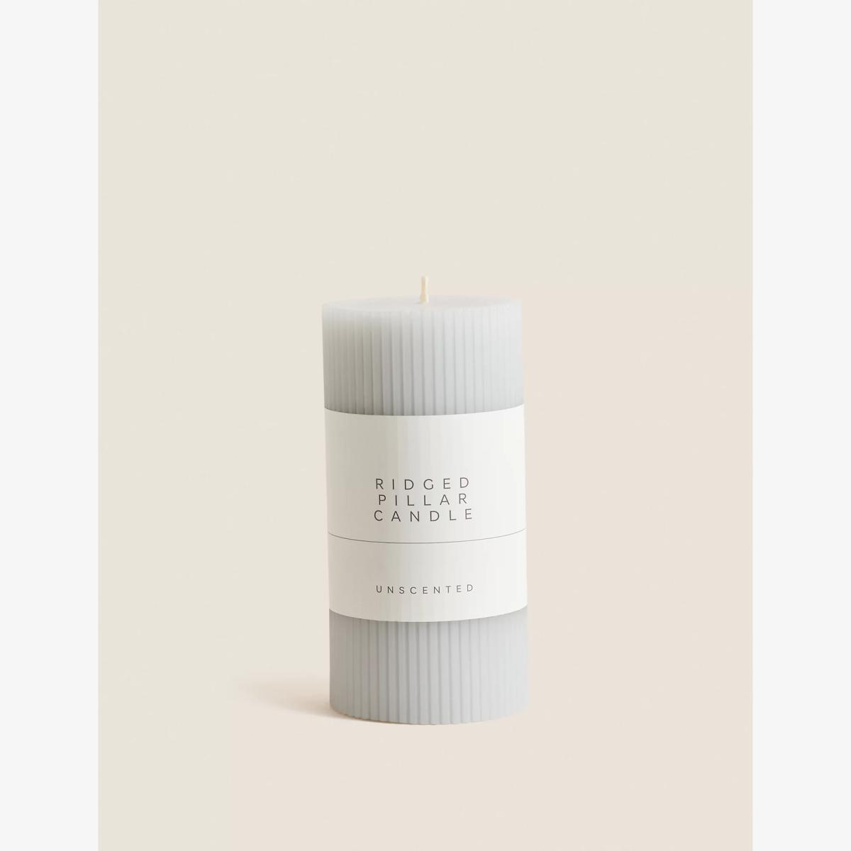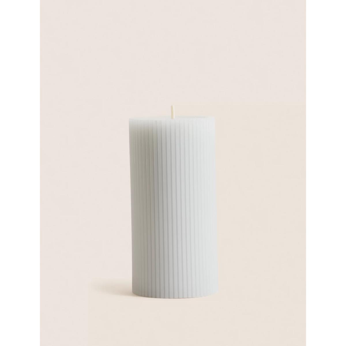 This decorative pillar candle has a finely ridged texture for a refined look and has a burn time of up to 65 hours. Choose from a selection of soft, calming colours.