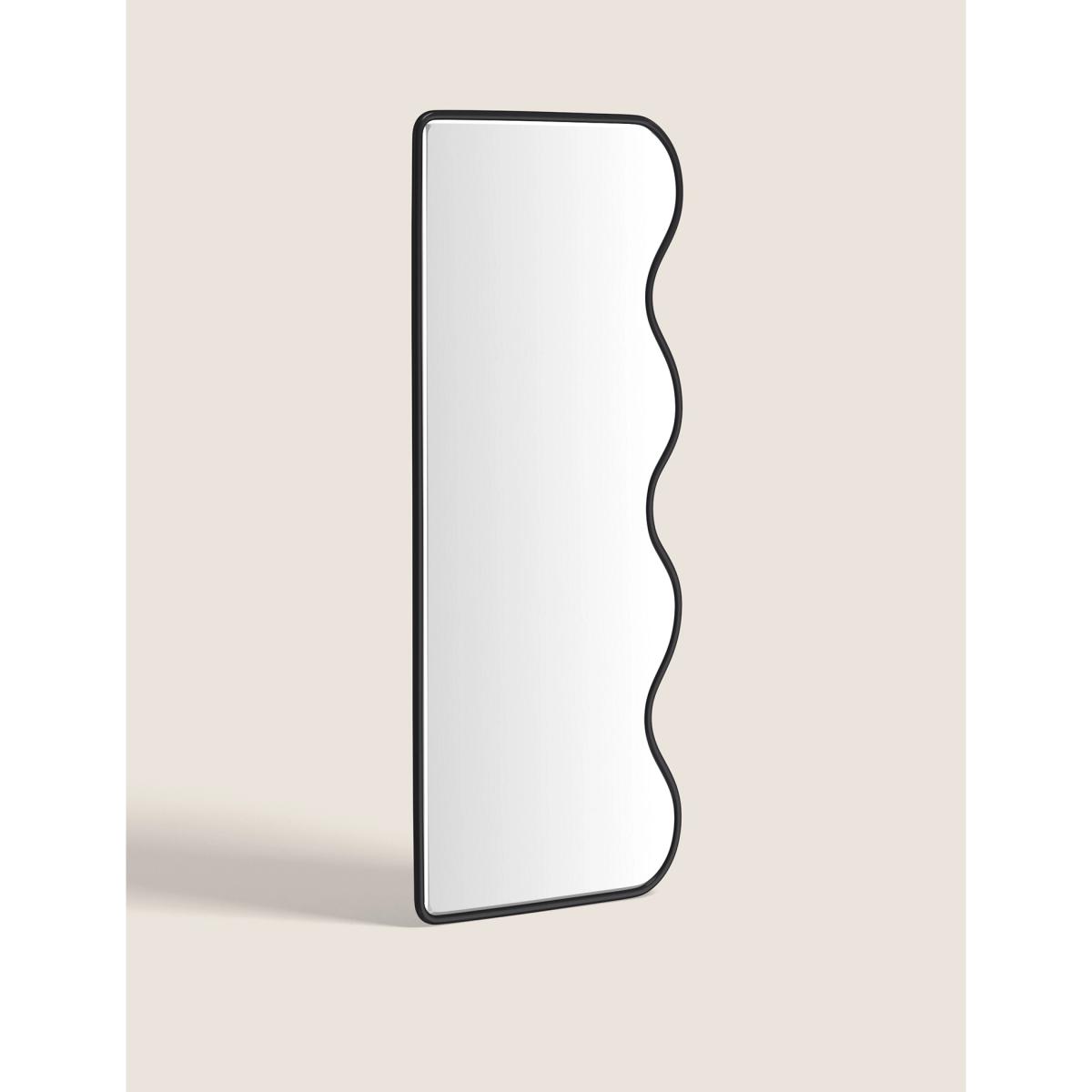 This unique wall mirror will add a contemporary feel to your decor. The smooth metal frame has one wavy edge surrounded by contrasting clean, straight lines. A full-length design makes this piece perfect for bedrooms or hallways – or to lend a modern touch to living areas.