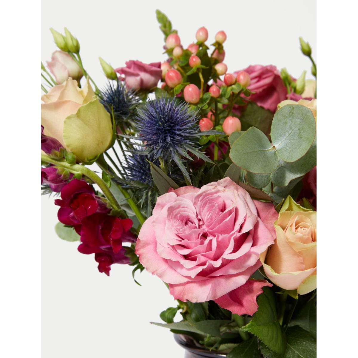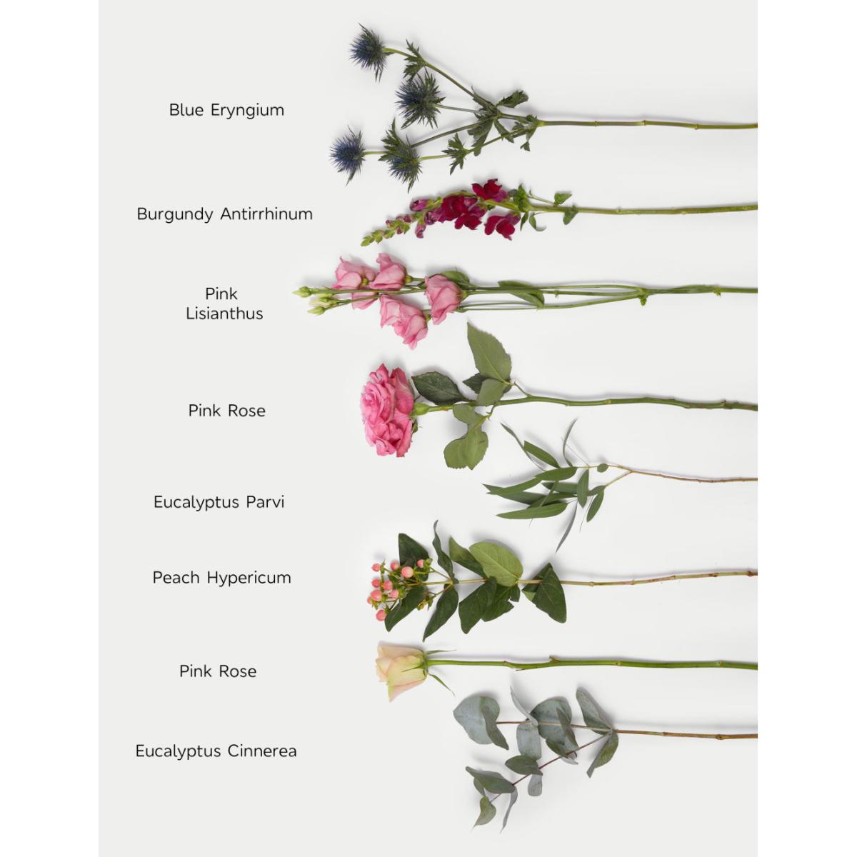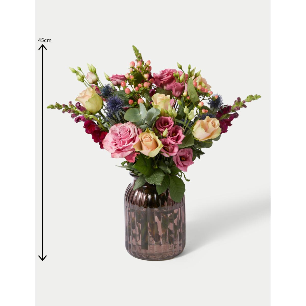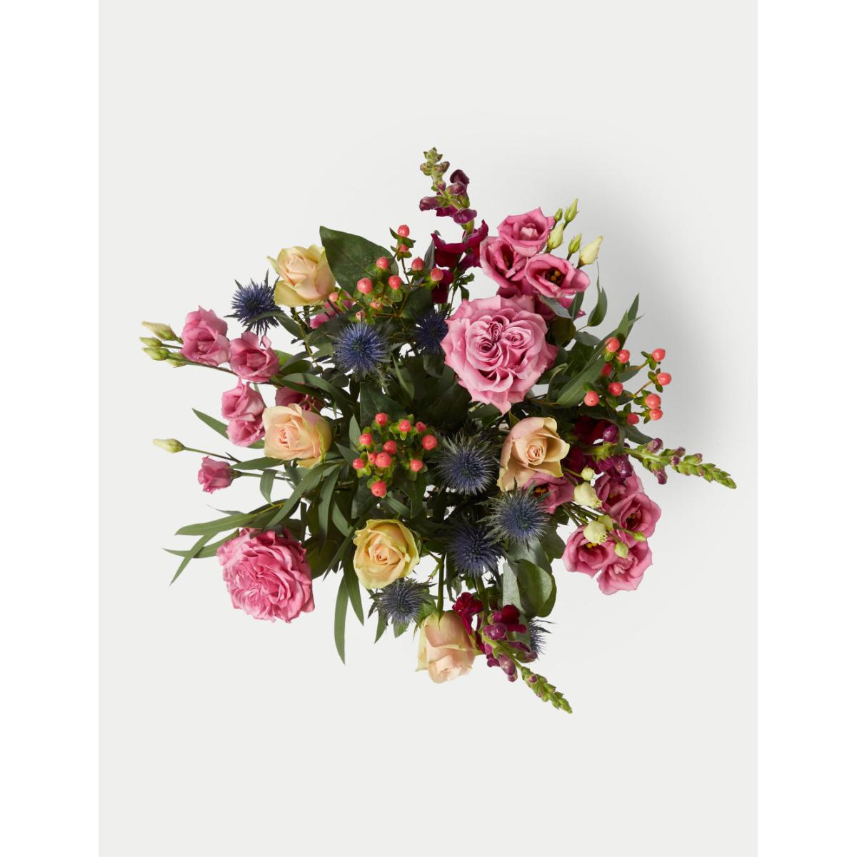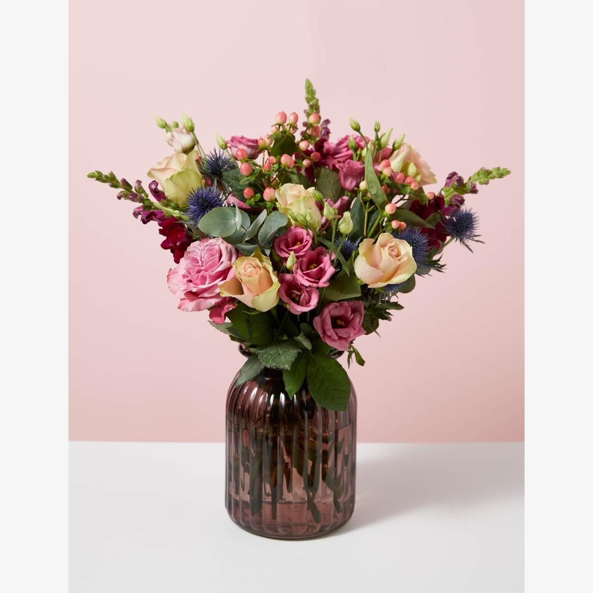 Elevate any space with our expertly curated arrangement, featuring a vibrant mix of colours and textures. This charming bouquet showcases seven pink roses, three peach hypericum, three burgundy snapdragons and three pink lisianthus, accented by the unique touch of two blue eryngium. The elegant vase, perfectly paired with the bouquet, makes this gift ready for immediate display.