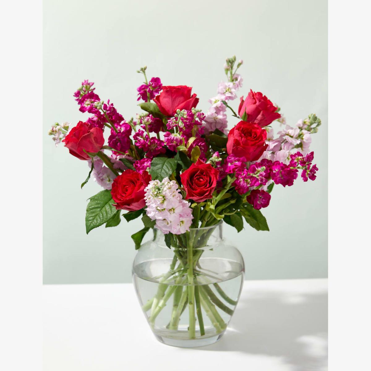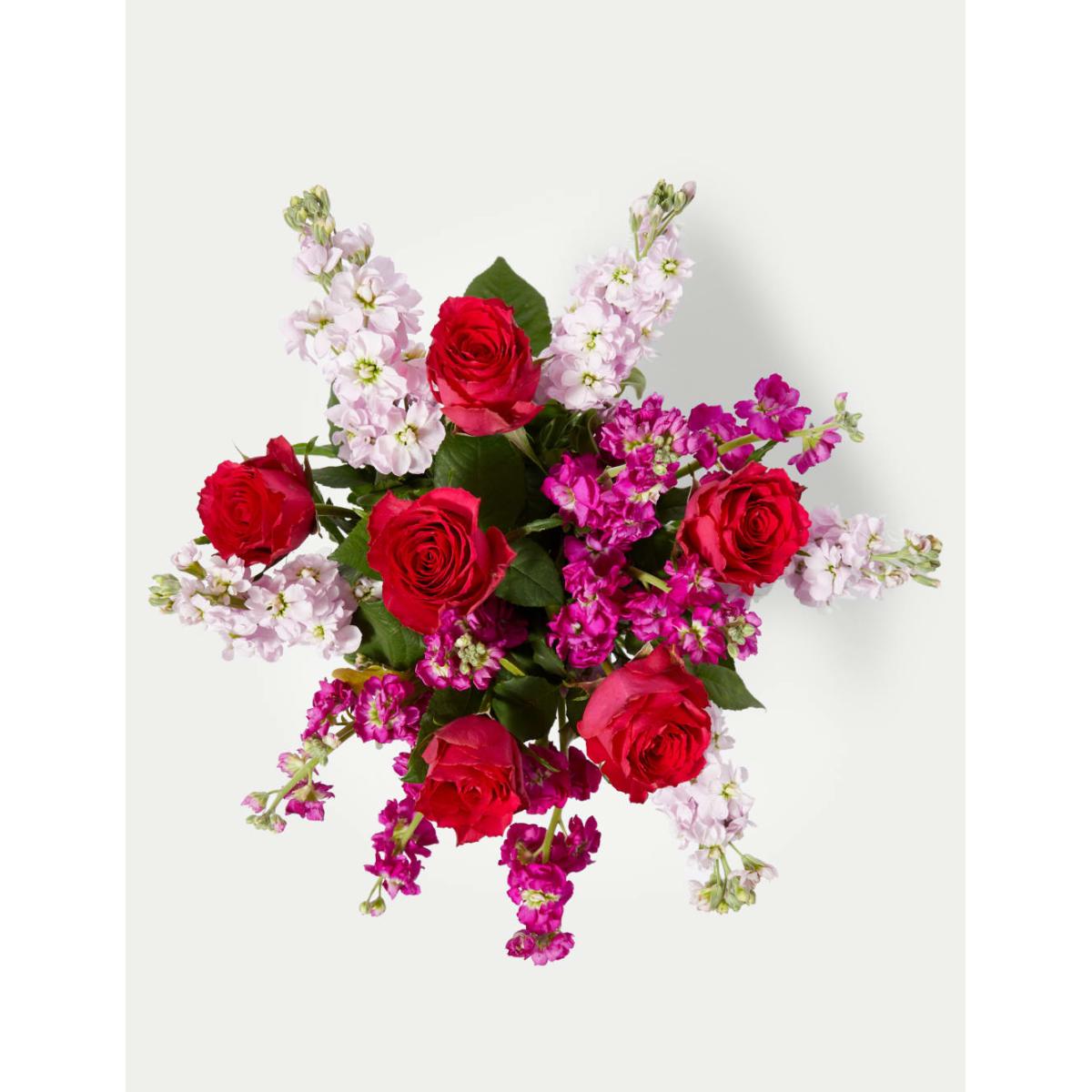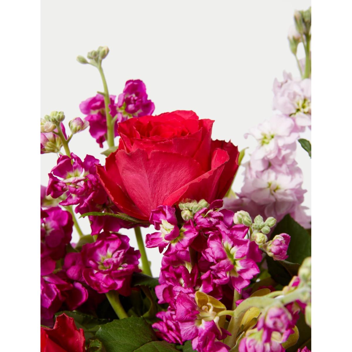 Surprise someone special this month with this vibrant bouquet of seasonal roses and stocks. This lush selection of 13 stems features dreamy roses surrounded by stocks, in show-stopping shades of pink and cerise. It will be delivered direct to the recipient's door together with your personalised message. Colours may vary slightly throughout the season.