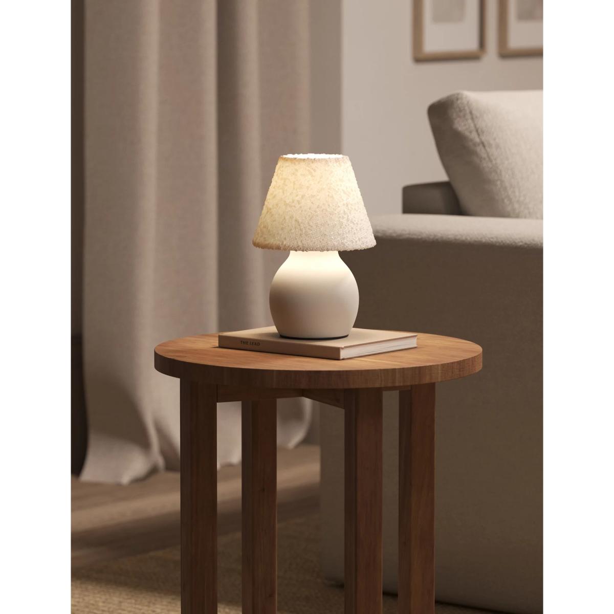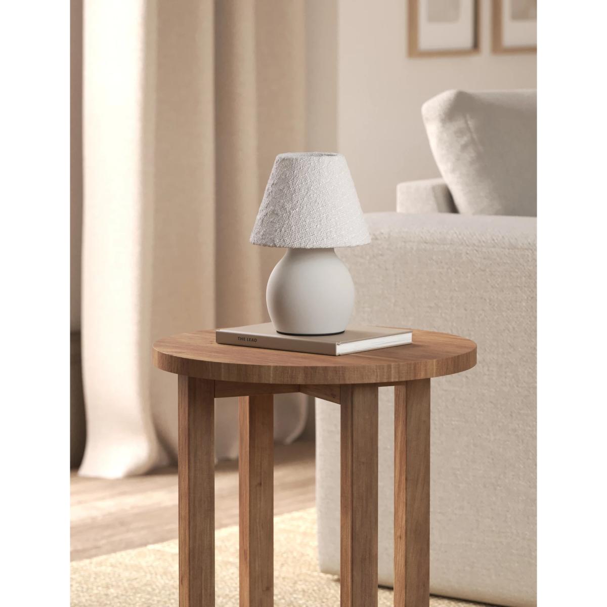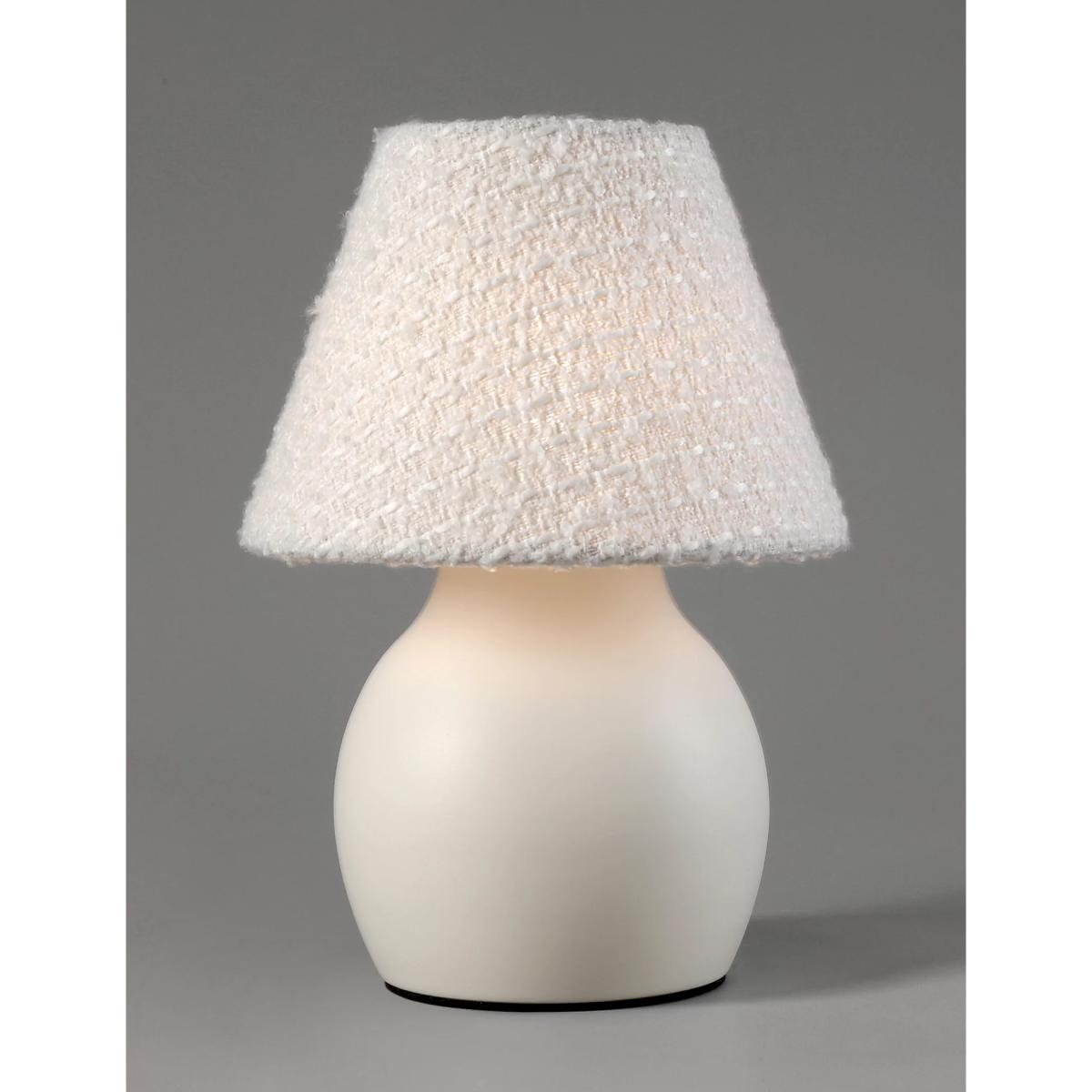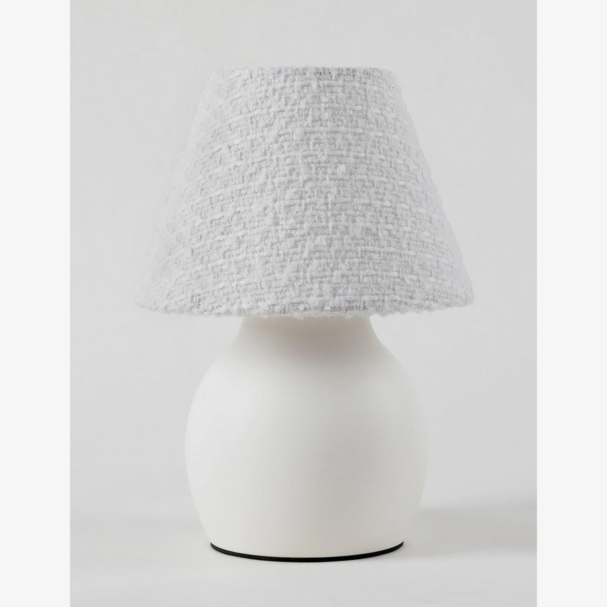 Cosy meets contemporary with this small table lamp. Its conical fabric shade has a beautifully textured finish, while its base is crafted from stylish curved ceramic. This lamp runs on battery power, so you can position it wherever you like without having to worry about wires.