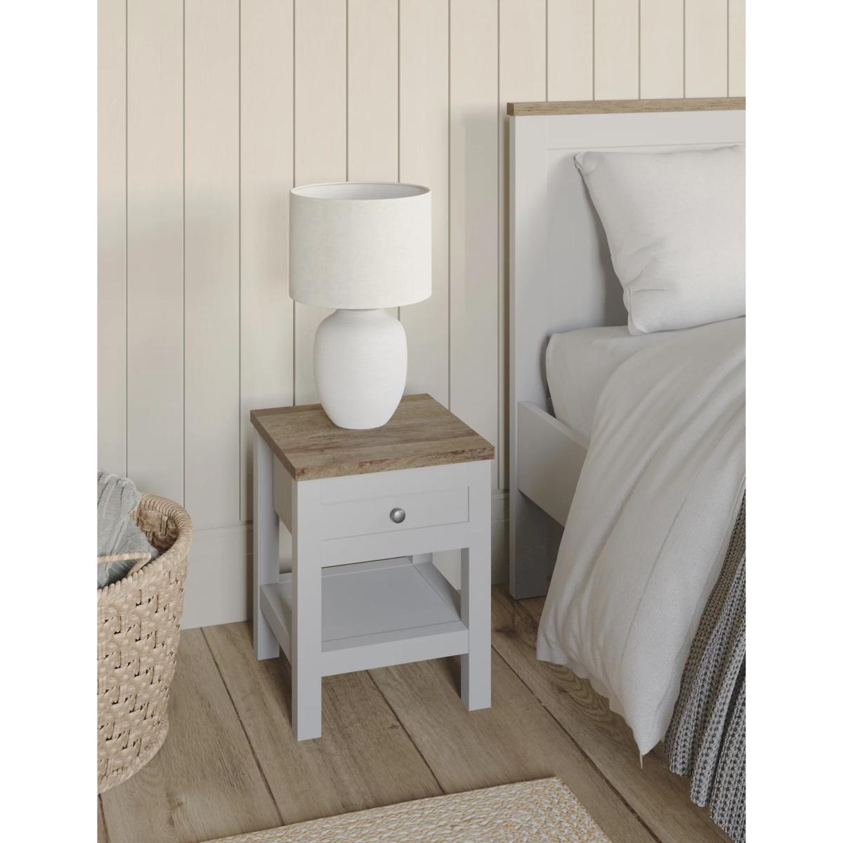I love this bedside table for its versatile and timeless appeal, making it suitable for a range of interiors from coastal to contemporary. The combination of a light grey finish with a natural wood top gives it a relaxed, Scandinavian vibe that pairs well with neutral palettes, soft textiles, or layered patterns. Practical styling tips include keeping surface clutter-free with minimalistic lamps or a small plant, while utilising the drawer for bedtime essentials. Its open shelf offers space for books or decorative objects, adding personality without overcrowding. Overall, it’s an elegant and functional piece that can blend seamlessly into a range of bedroom styles.