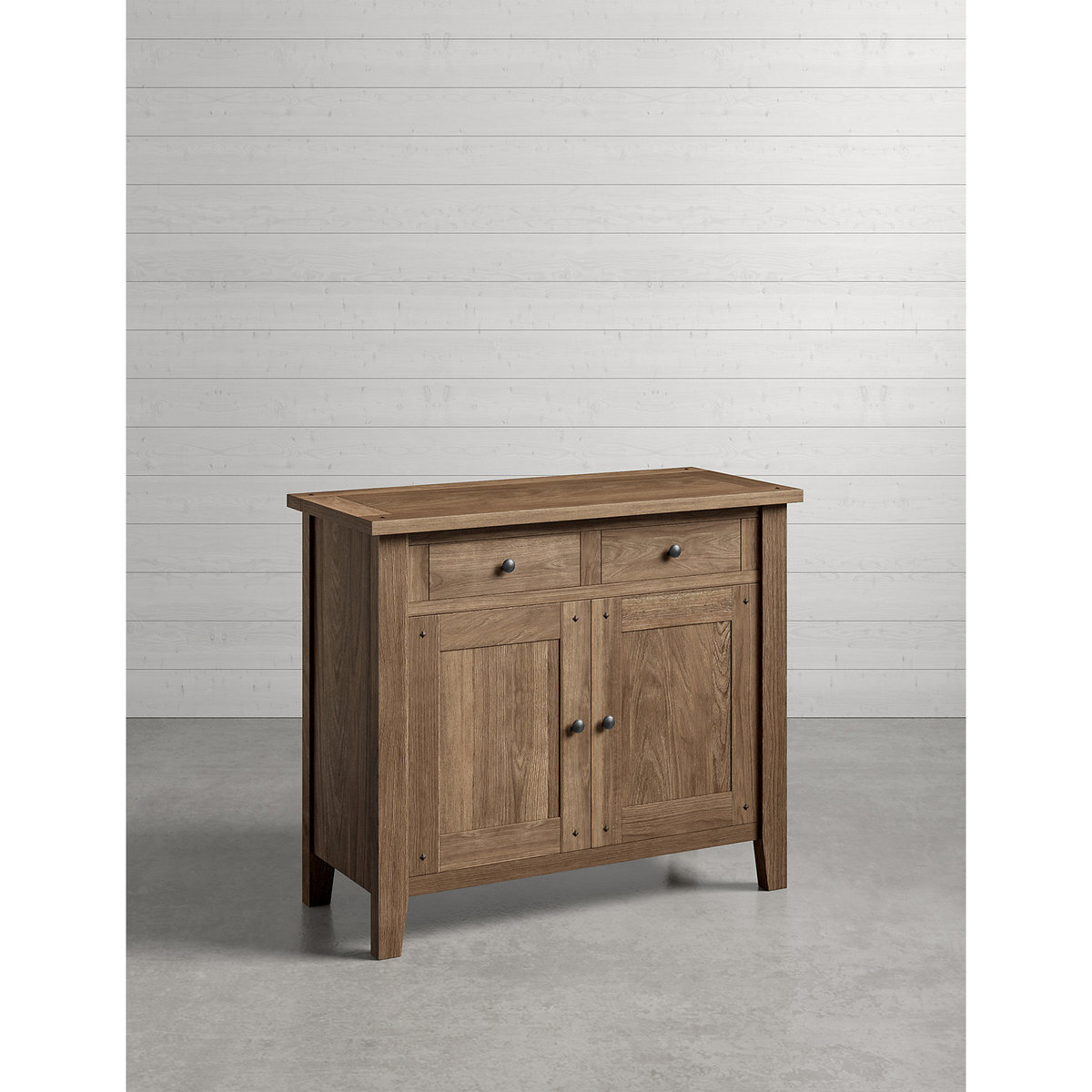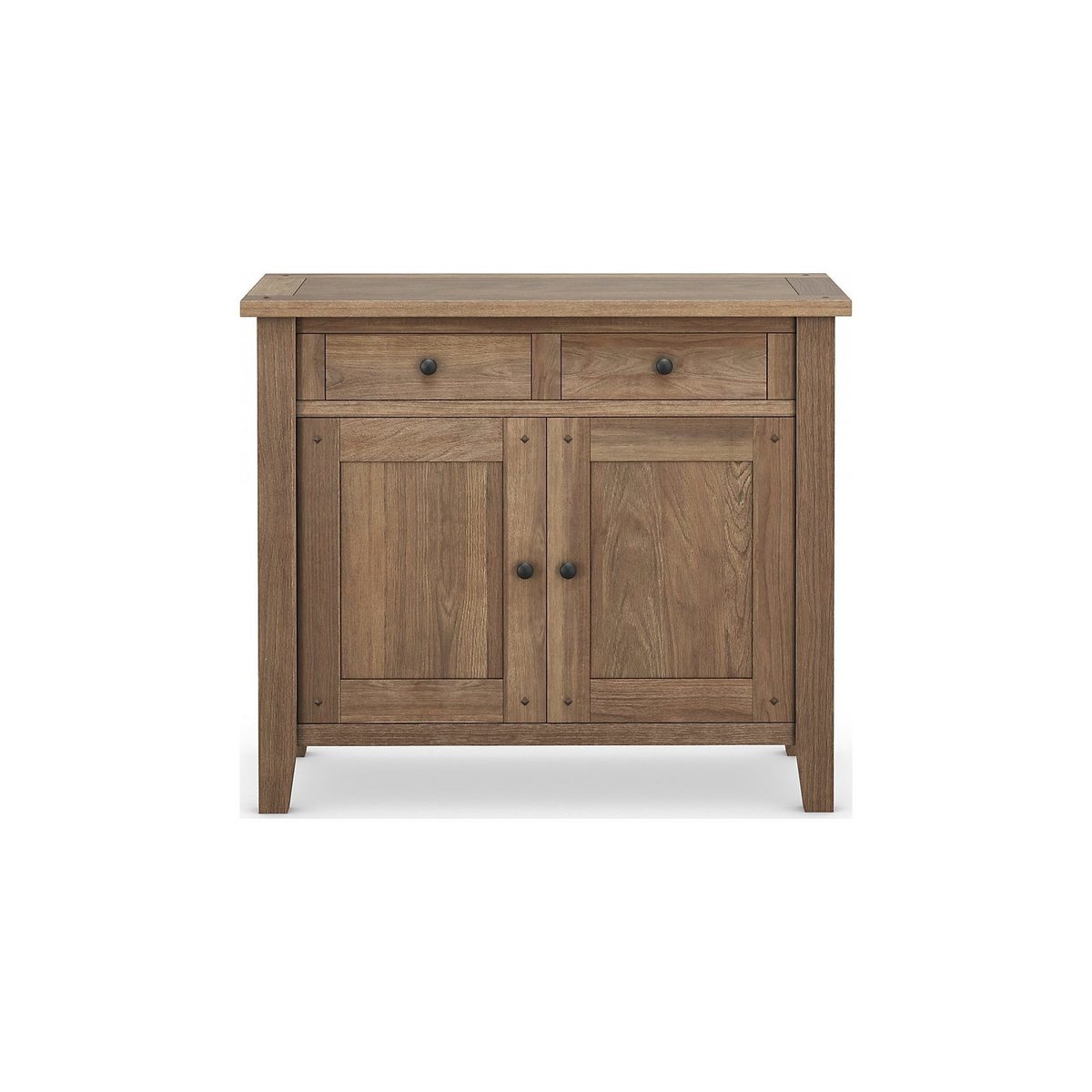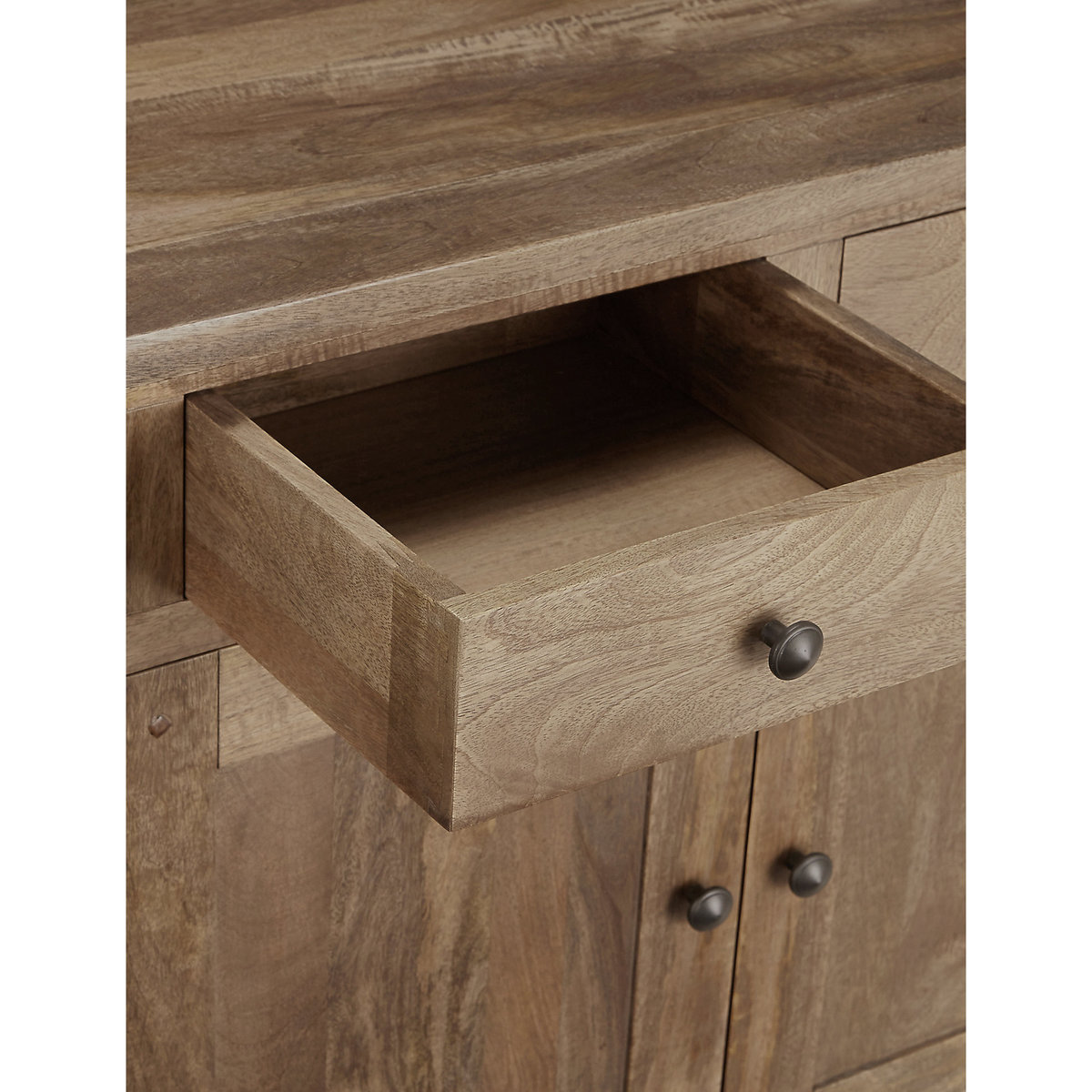 Effortlessly stylish, this beautifully crafted Sanford sideboard is bursting with rustic charm. Sanford furniture wonderfully combines solid mango wood with a stylishly distressed finish complete with knots, peg joints and metal handles on its surface. This Sanford sideboard offers the perfect storage unit for any space in your home thanks to its solid display top, two drawers, shelves and cupboards. Created with sustainable materials, it\u2019s the perfect place to keep your keys, post and any other everyday items.