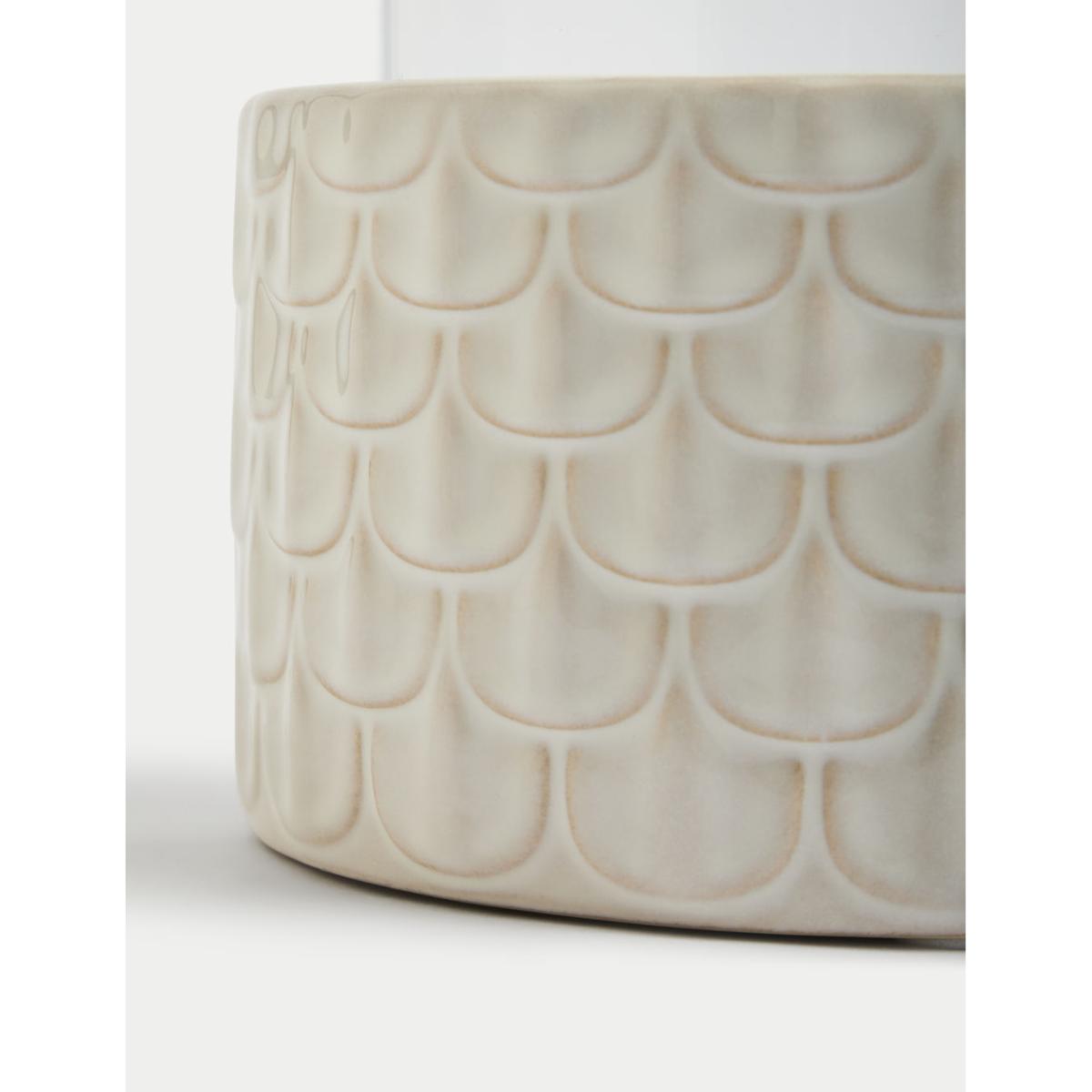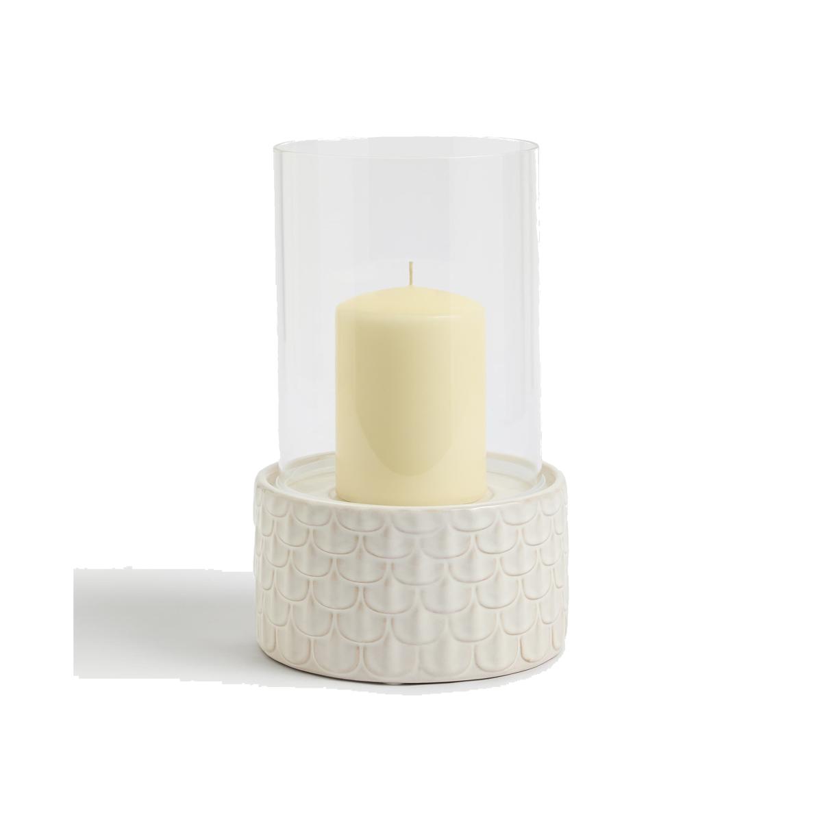 Illuminate your space with warmth and charm using this hurricane candle holder. Crafted with a ceramic base that features a scalloped pattern, this holder adds a touch of artisanal elegance to your setting.