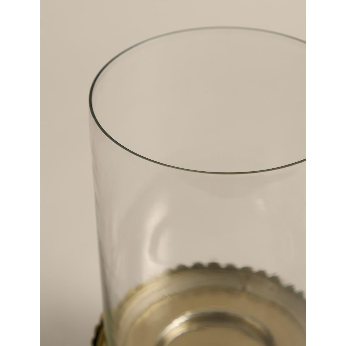 This elegant hurricane candle holder features a textured gold-tone metal base with scalloped detail for a stylish look. A cylindrical glass cover offers a sophisticated touch and allows you to safely burn candles outside.