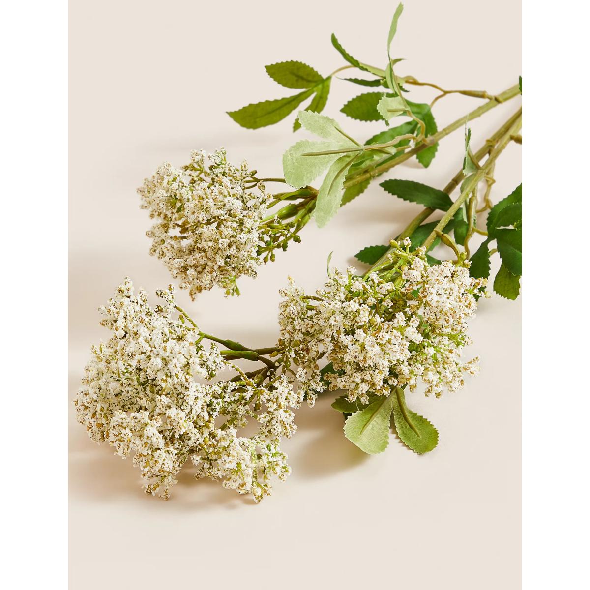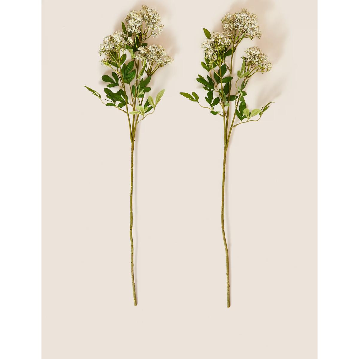 With dainty white flowers amongst verdant green leaves, these artificial cow parsley stems will bring the freshness of the outdoors into your home. The set of two single stems can be added to a larger arrangement for fullness or showcased on their own in a slim vase for a simple centrepiece.