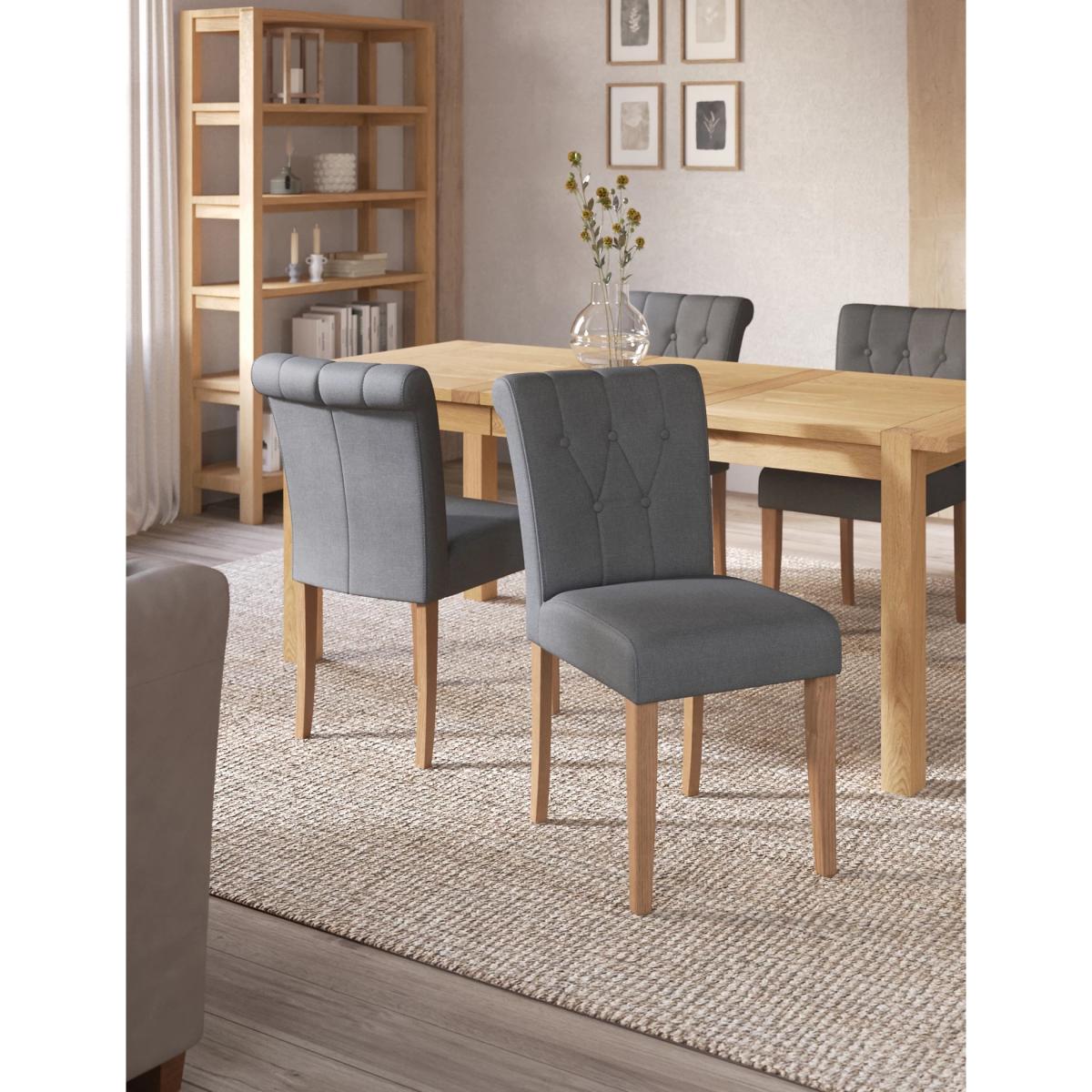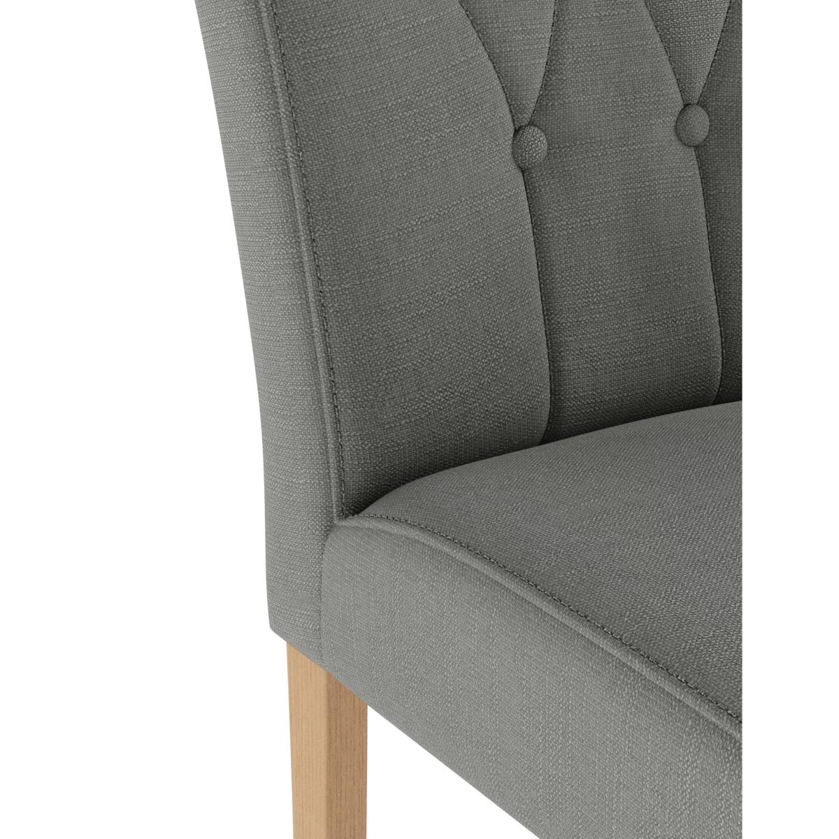 Opt for modern opulence with this set of two Langley dining chairs. They're elegantly styled with a soft scroll top and buttoned tufting on the back seat. Solid oak legs lend a contemporary touch to the design. We’re so confident our furniture is built to last, our industry-leading guarantee covers any manufacturing failure on all furniture. That’s our promise, and why our furniture comes with a 10-year guarantee that you can trust. Excludes: outdoor furniture and any issues that are a result of normal wear and tear, improper care or accidental damage.