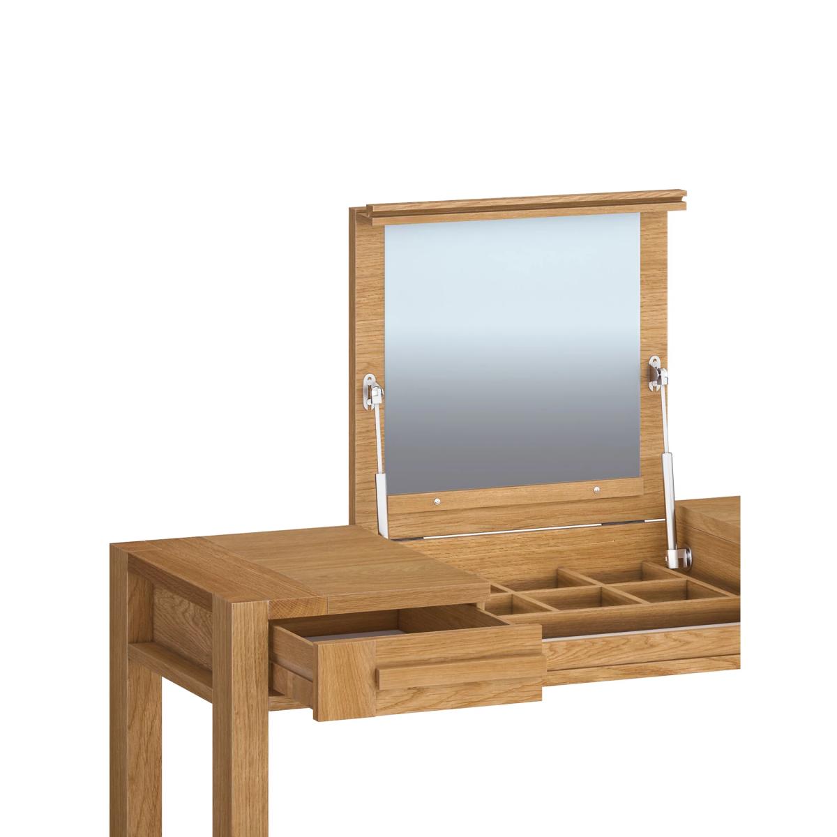 This Sonoma™ dressing table and stool set delivers on both functionality and charm. Featuring two drawers, a sizeable mirror and a number of versatile compartments, this dressing table provides ample space to keep your cosmetics and accessories organised and hidden away behind mirror supported with two gas struts. A matching stool with a comfortable, padded cream seat completes this set. Made from sustainable oak and oak veneer, this table and stool set features clean lines and sharp edges for a timelessly chic addition to your bedroom.